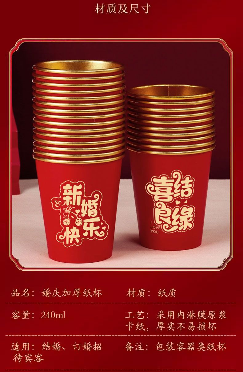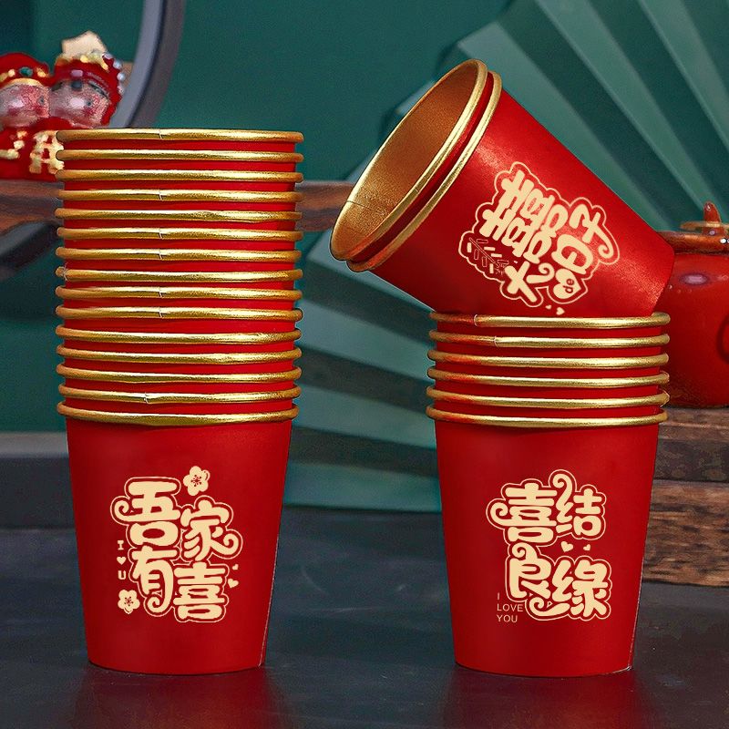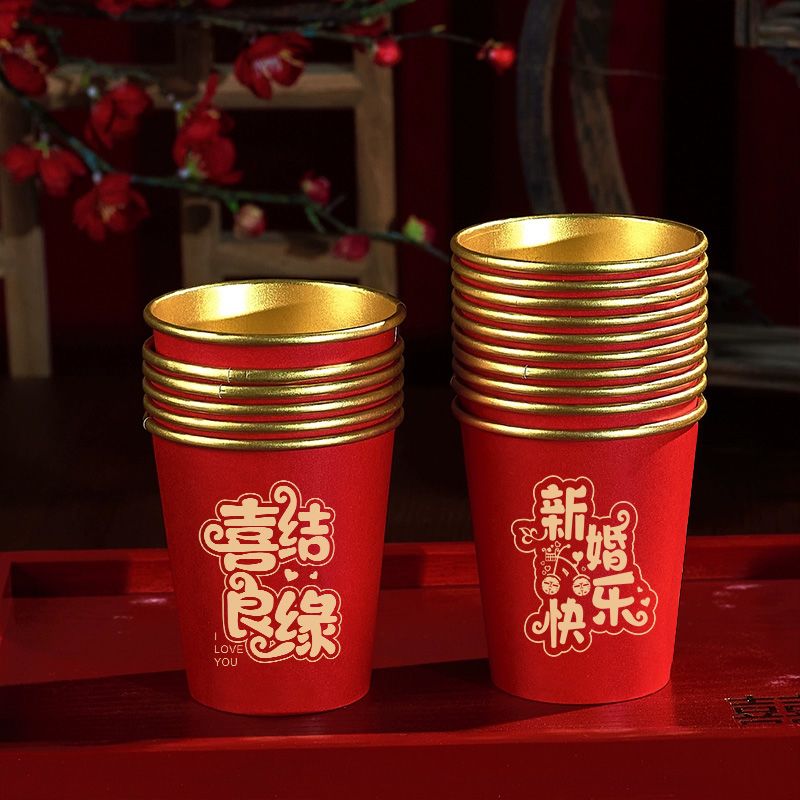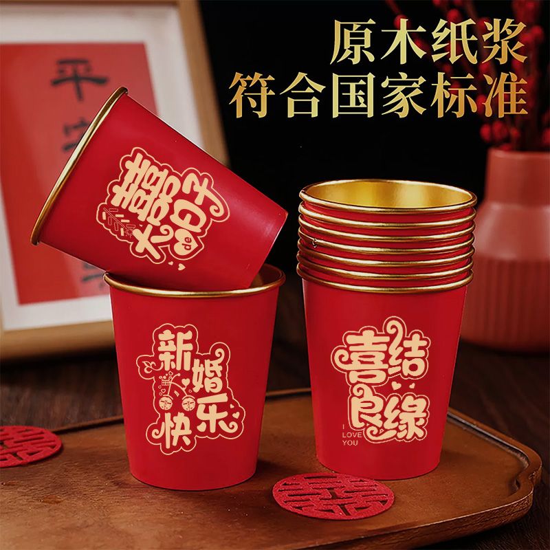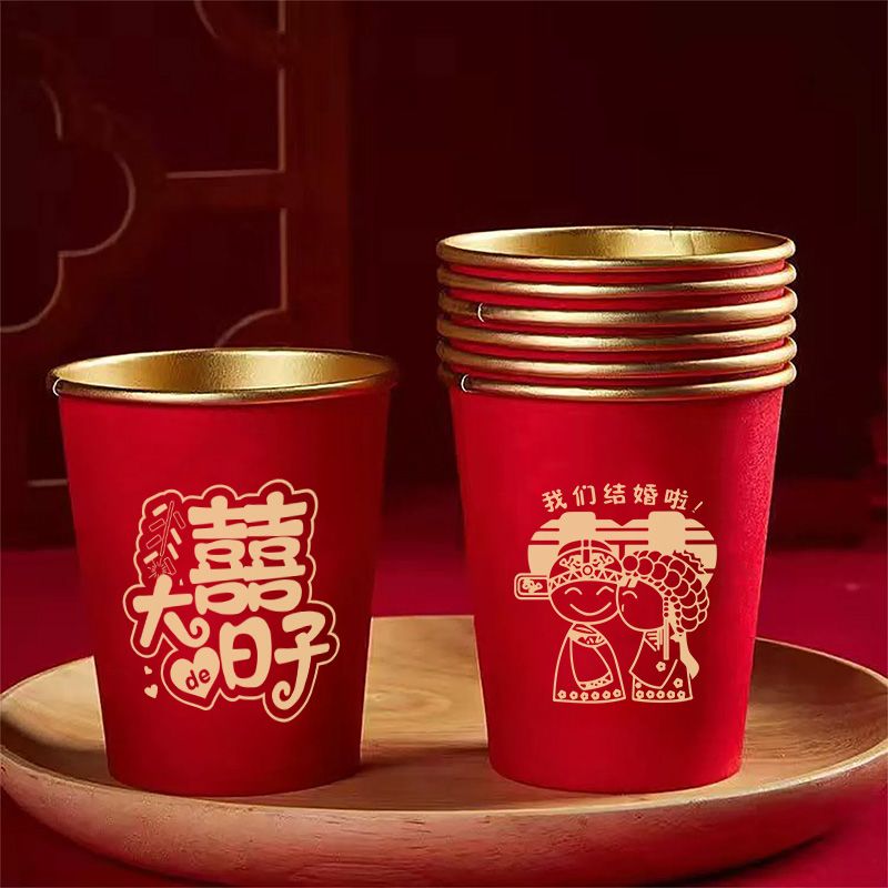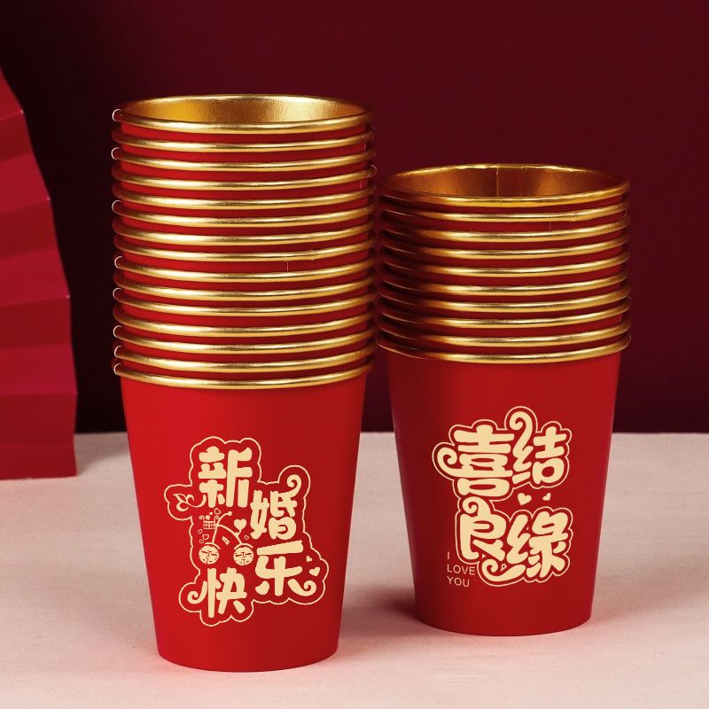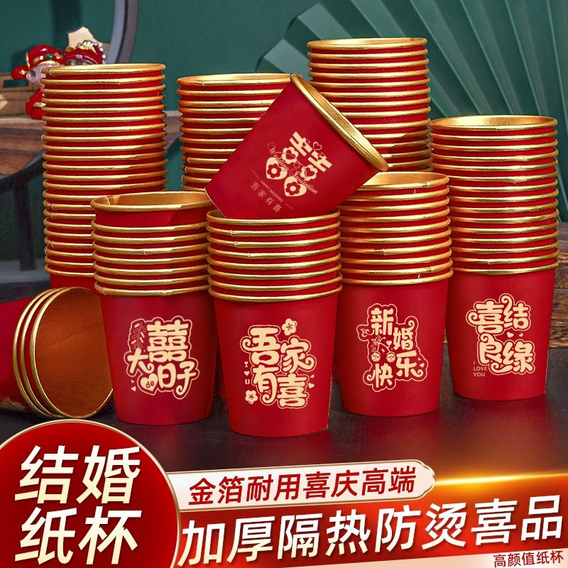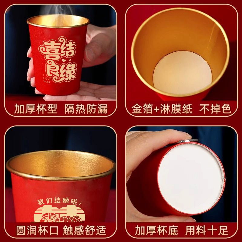 结婚纸杯一次性杯子加厚婚礼婚宴水杯家用喜杯红色婚庆茶杯金箔杯