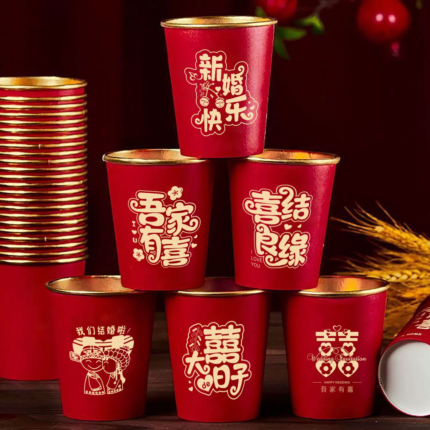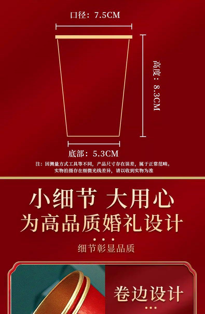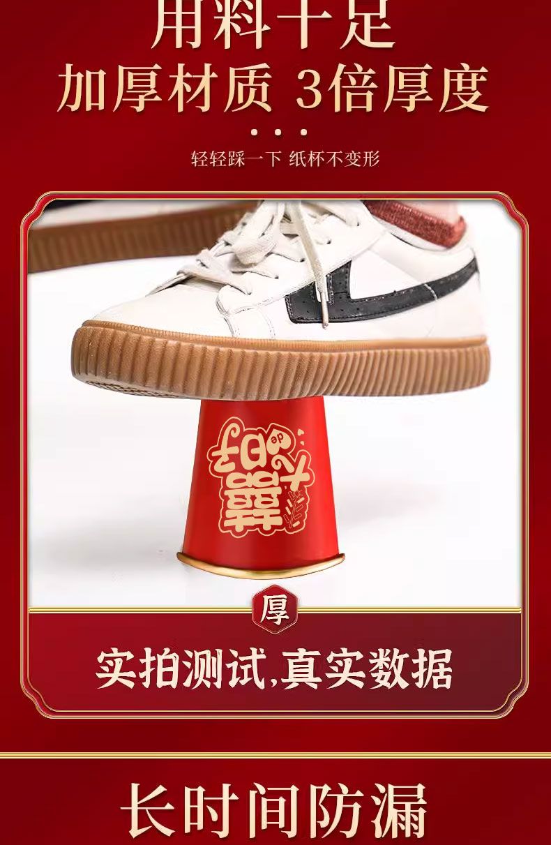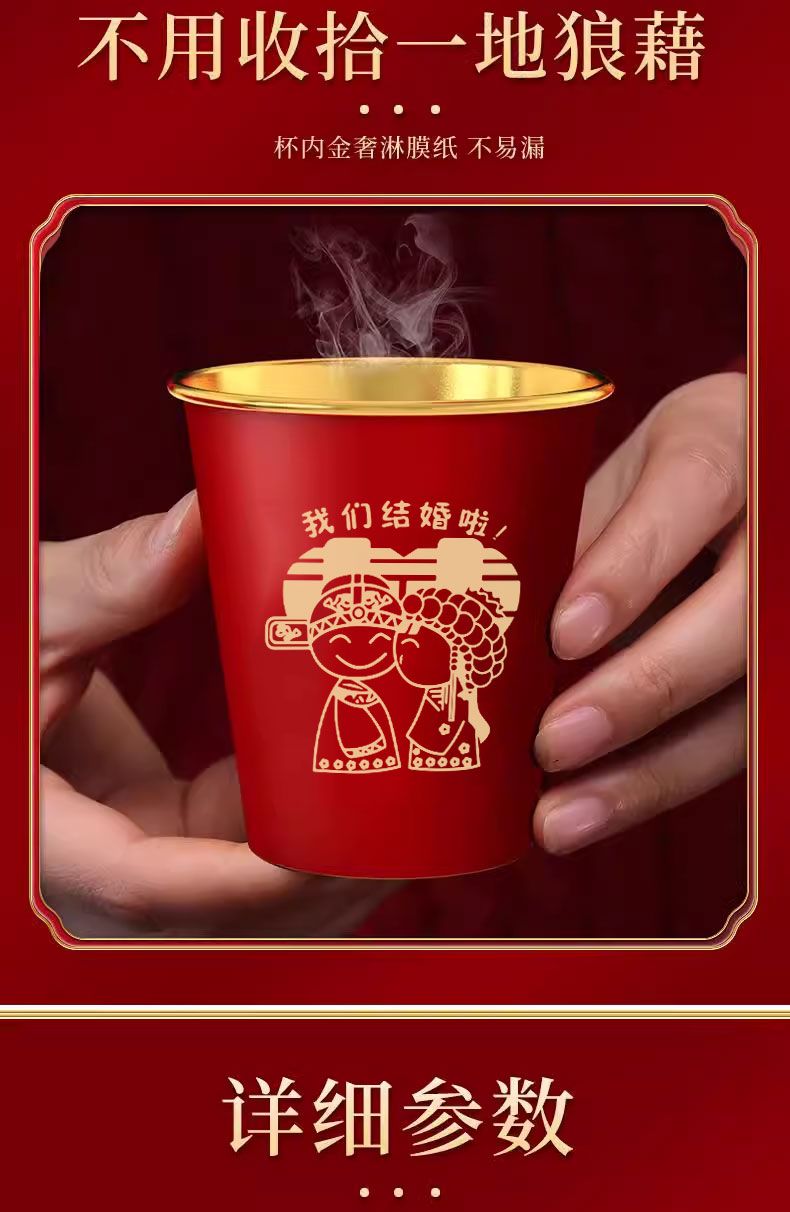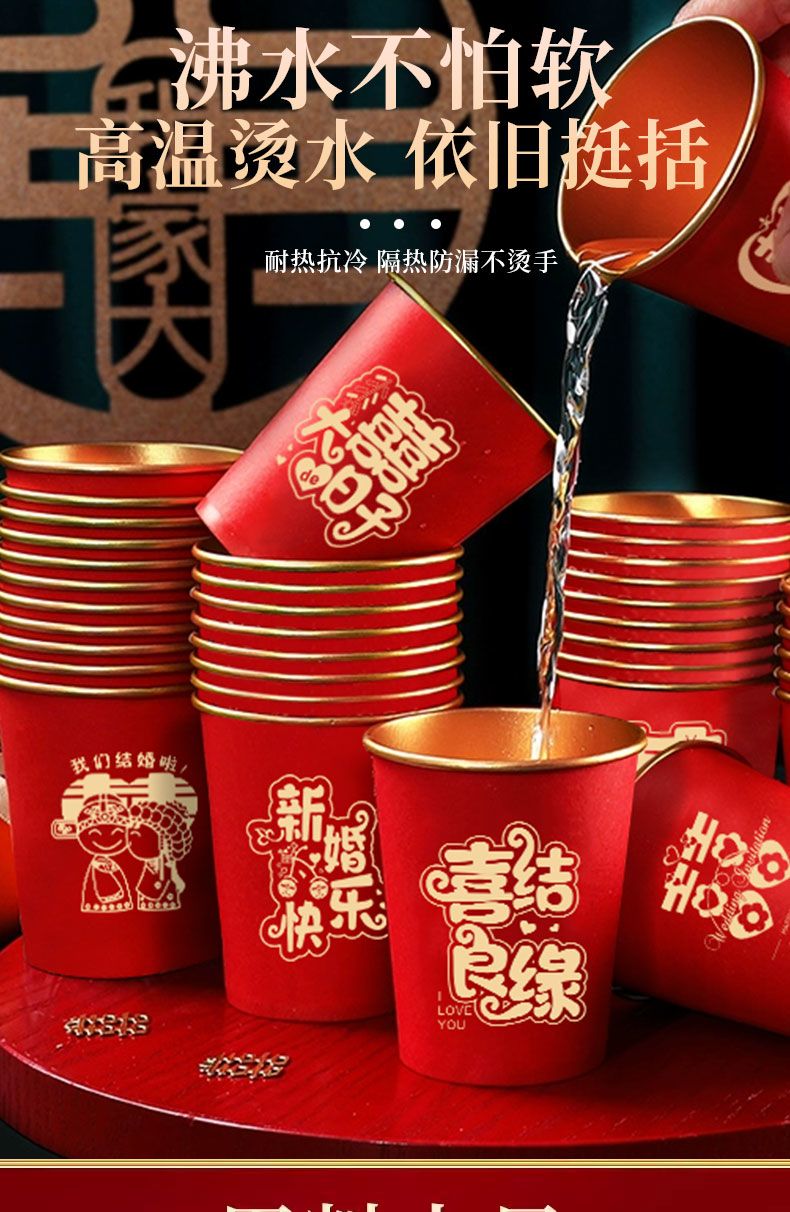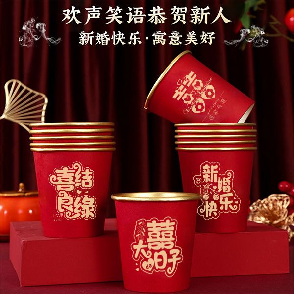 结婚纸杯一次性杯子加厚婚礼婚宴水杯家用喜杯红色婚庆茶杯金箔杯