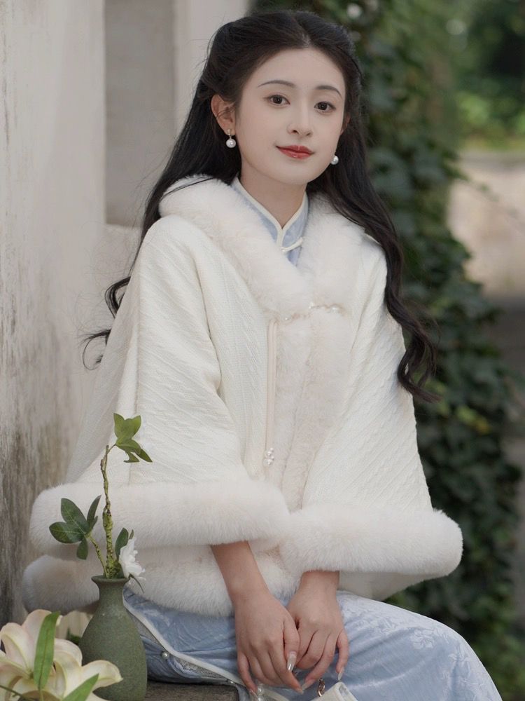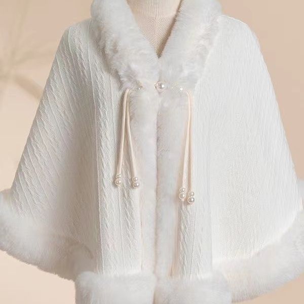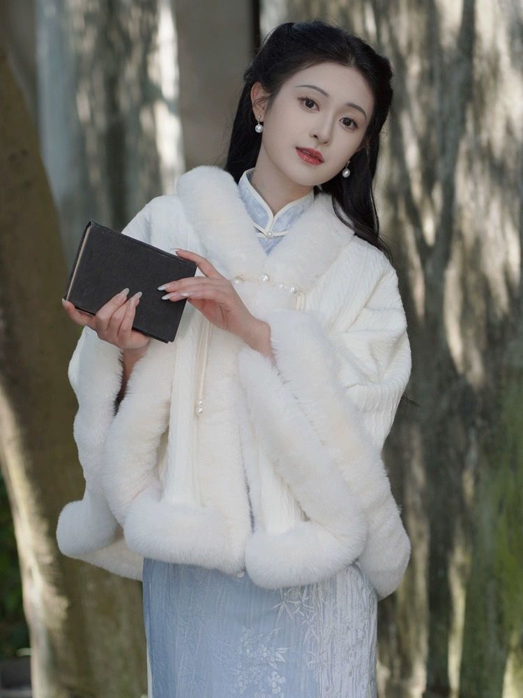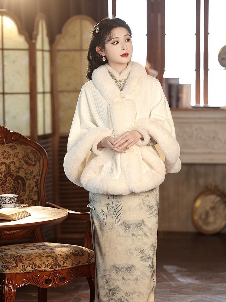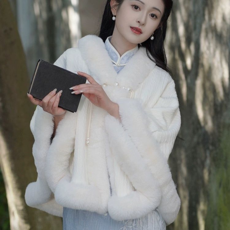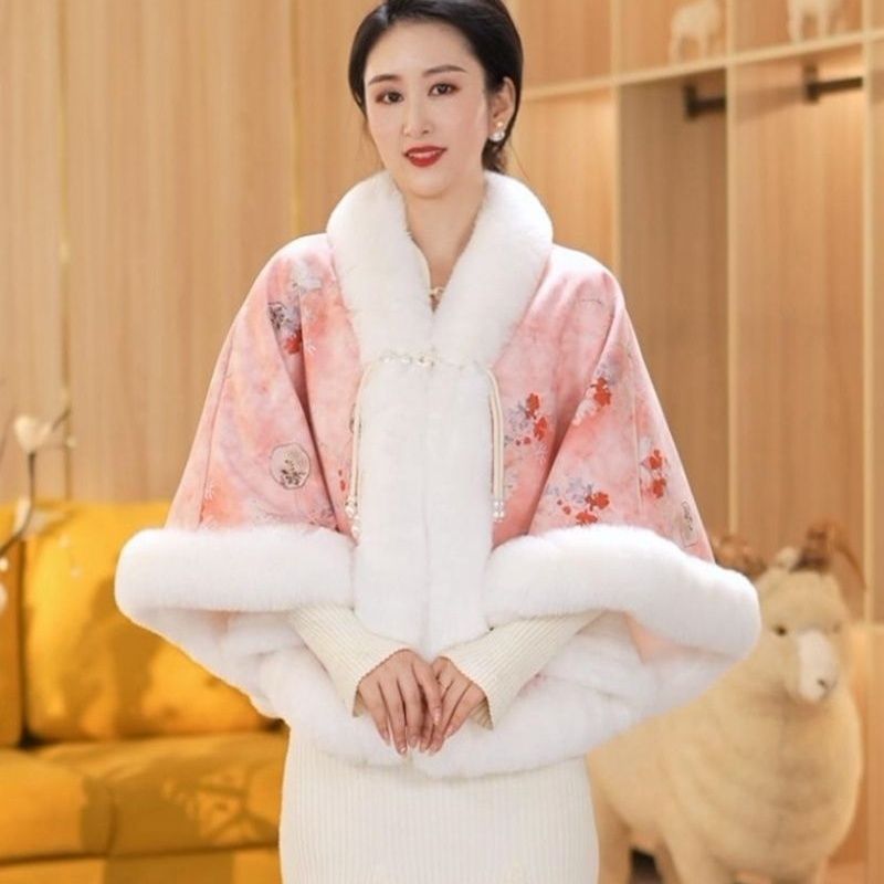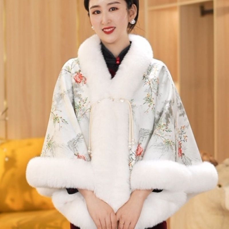 民国加绒加厚新款斗篷2024披肩旗袍气质高端秋冬保暖外套毛绒民族