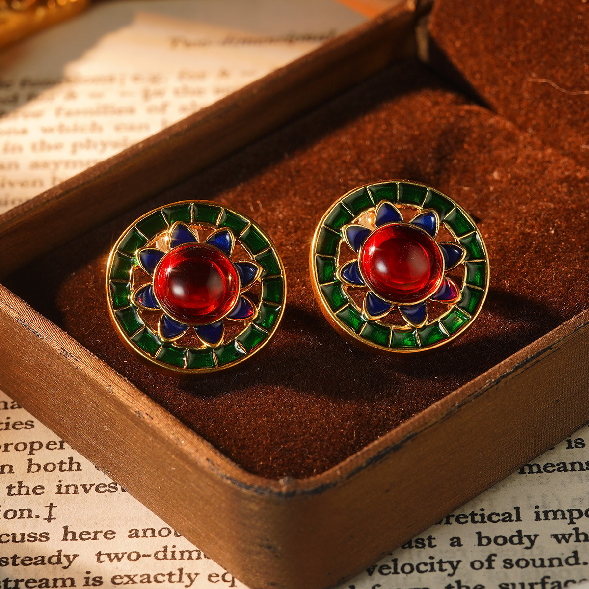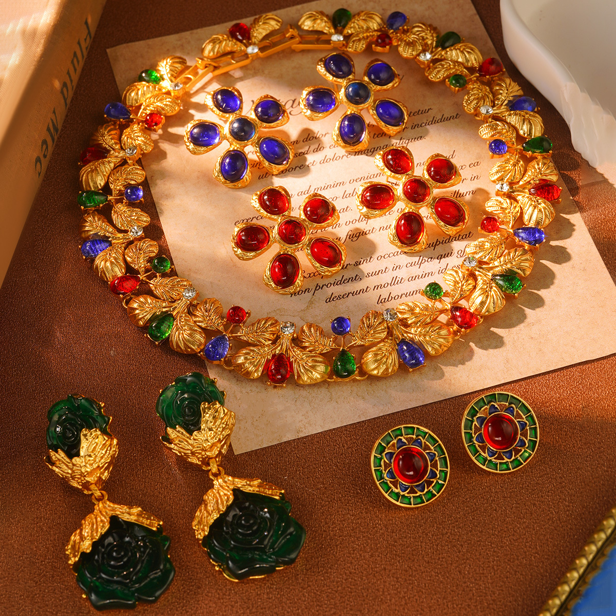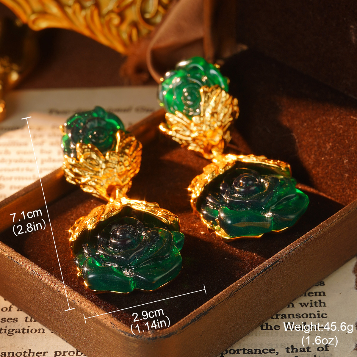 宫廷风花朵耳环小众彩色轻奢高级耳饰品熔岩效果绿玫瑰耳钉中古女