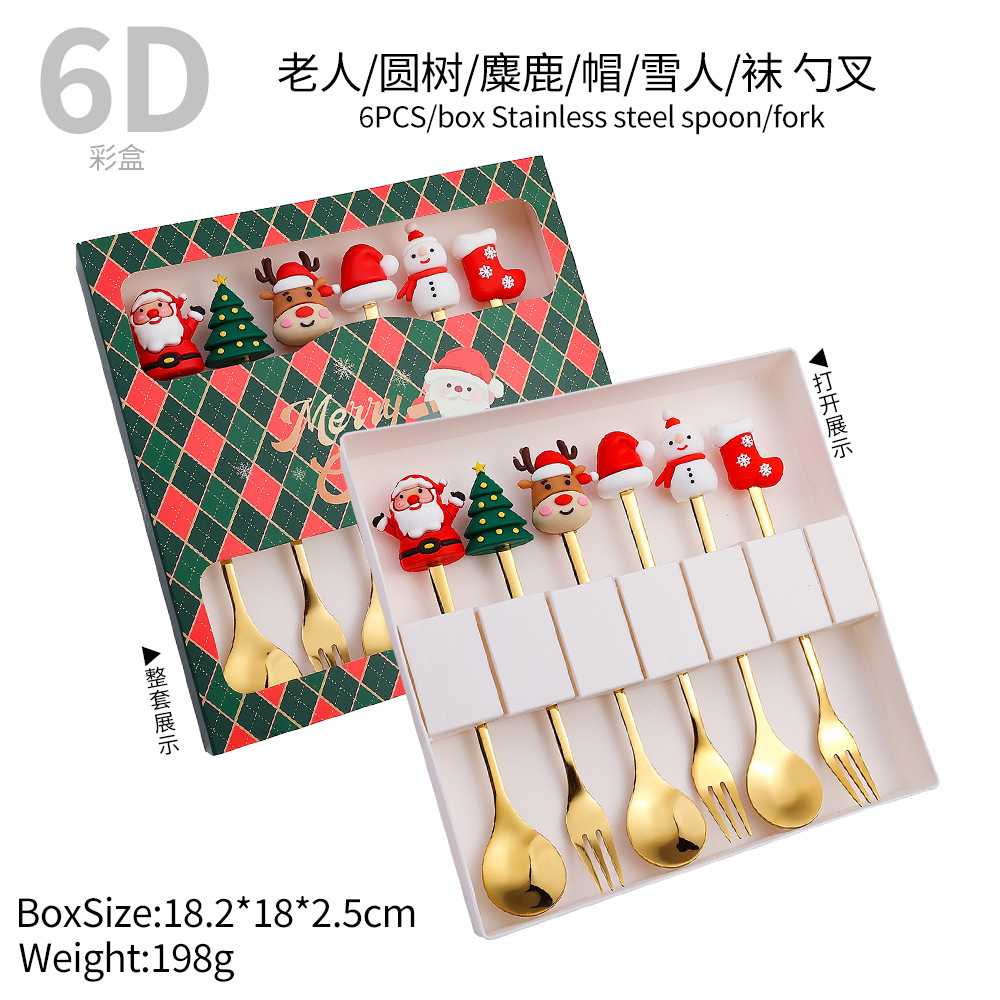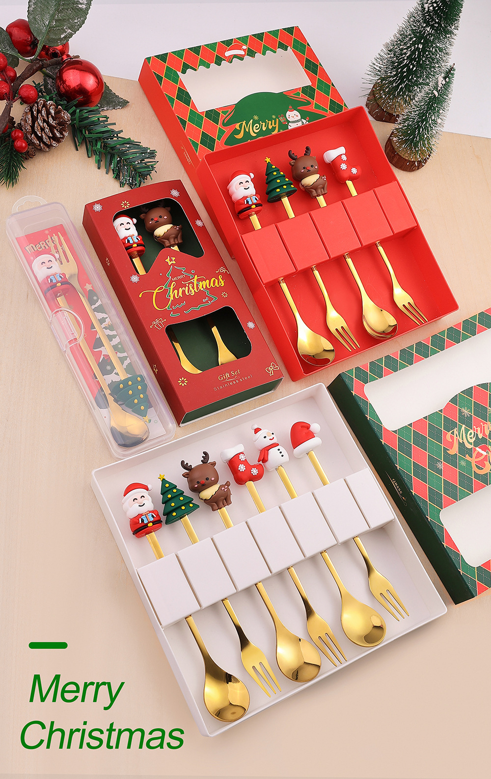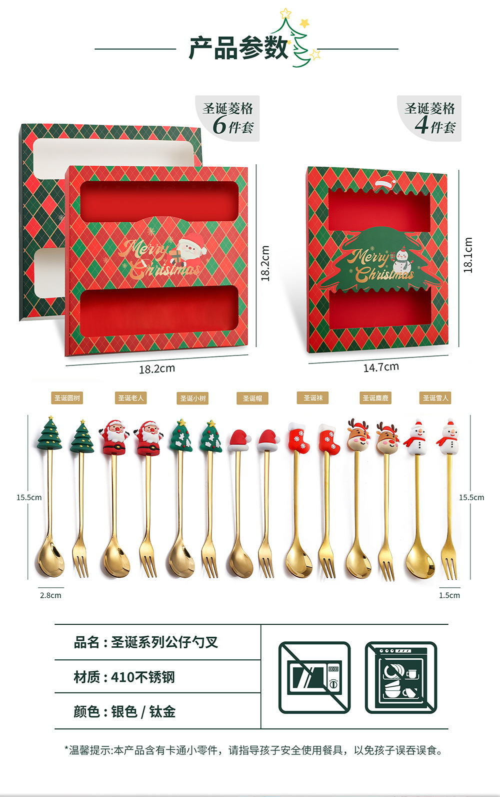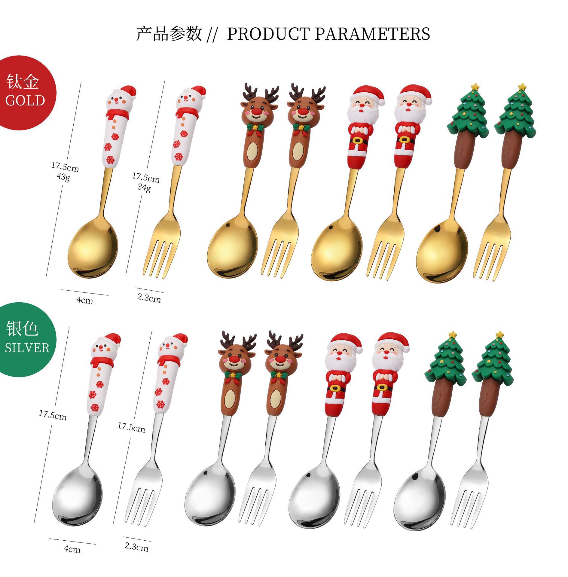 圣诞节勺子餐具套装 卡通圣诞树勺子麋鹿叉子节日礼盒甜品勺礼品