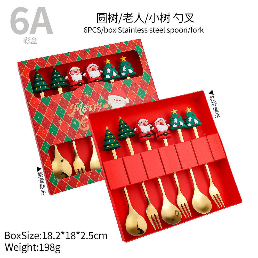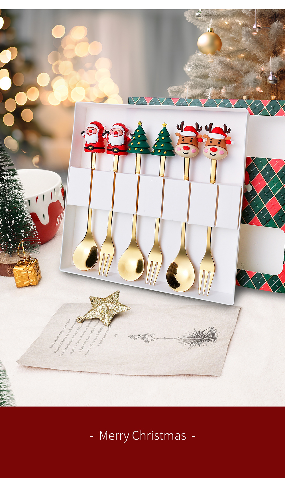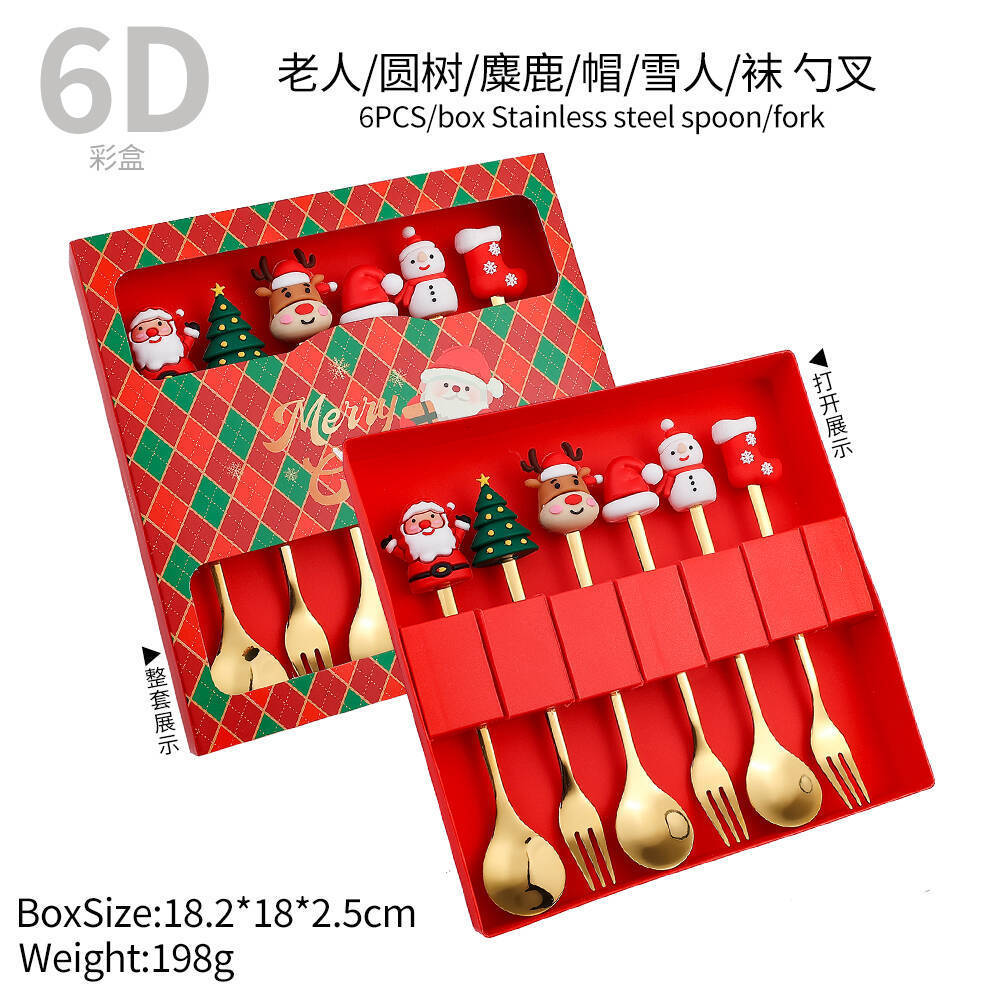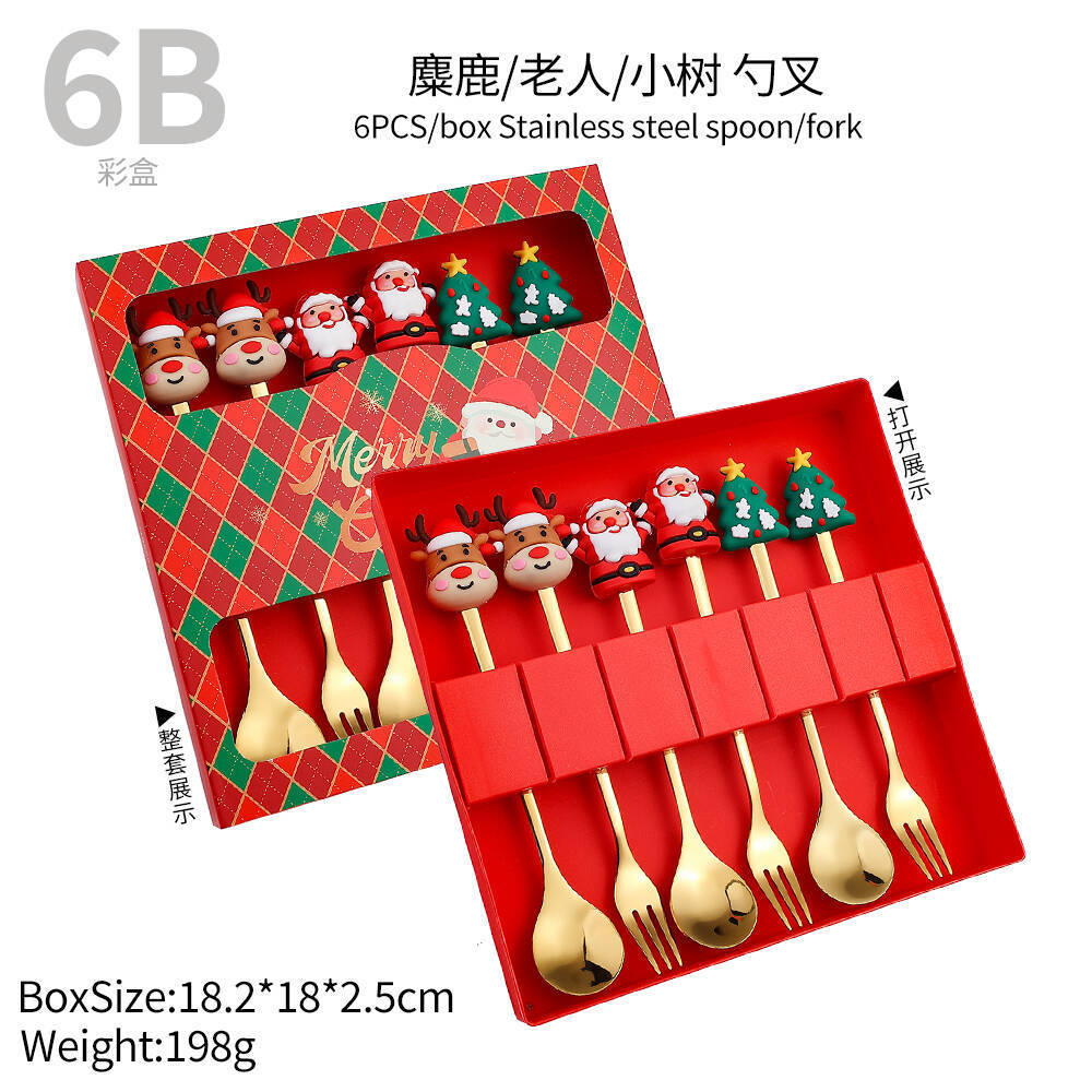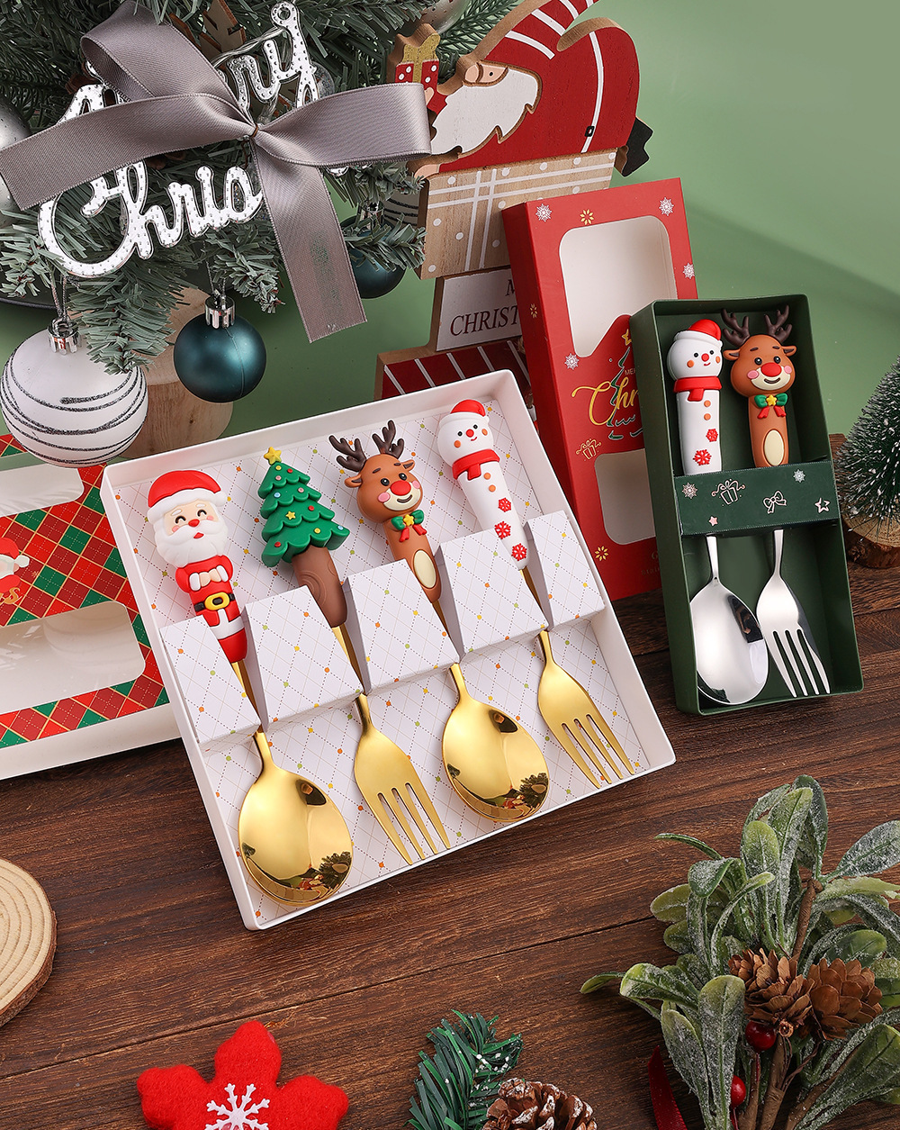 圣诞节勺子餐具套装 卡通圣诞树勺子麋鹿叉子节日礼盒甜品勺礼品