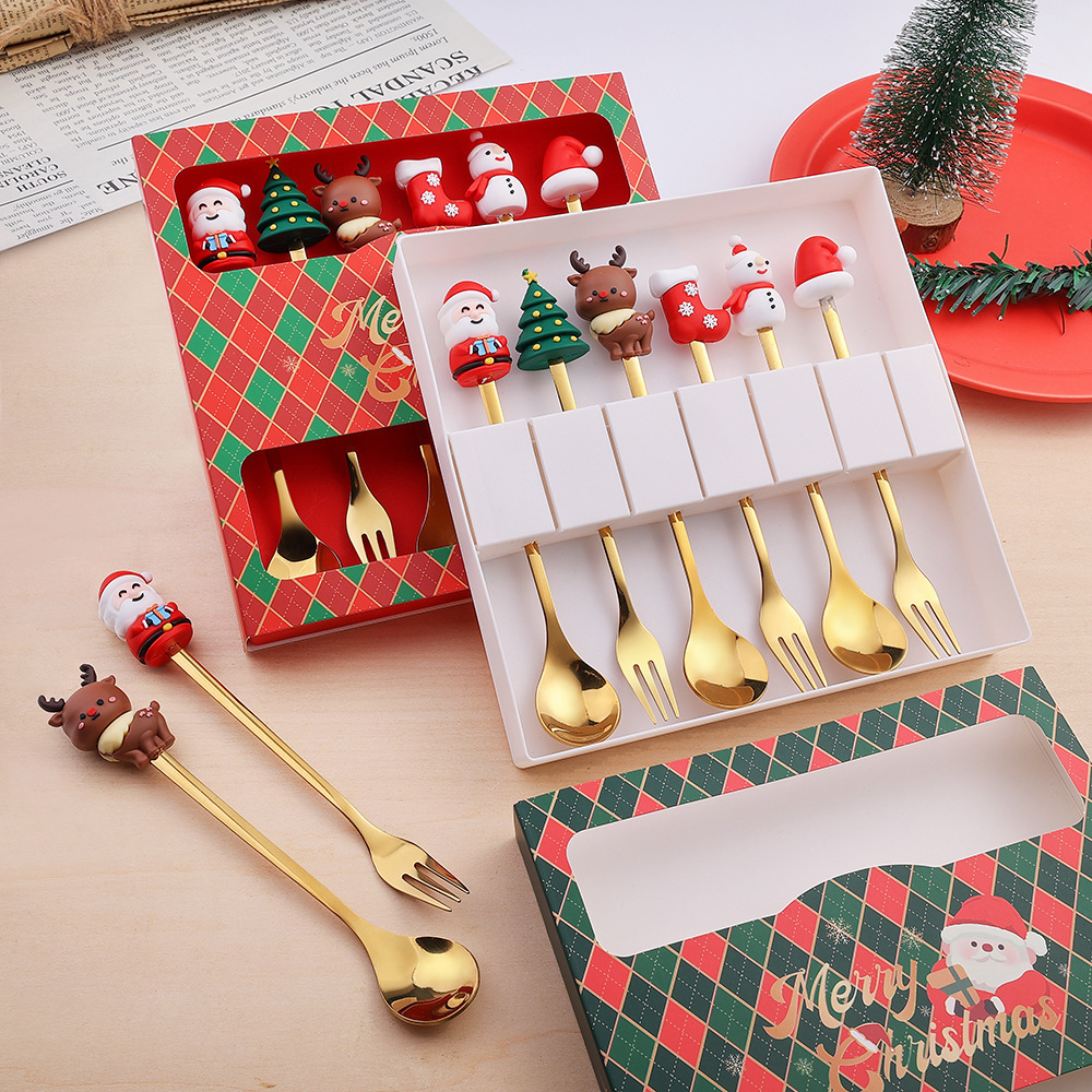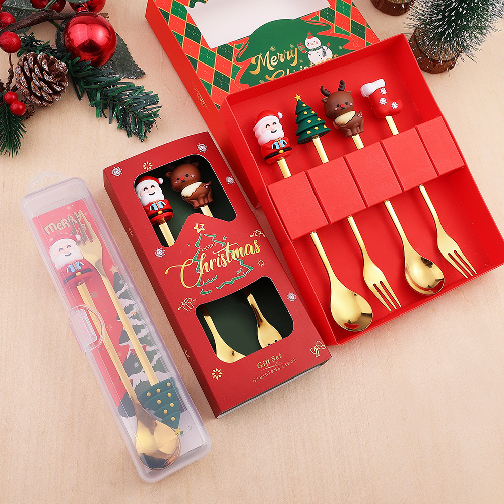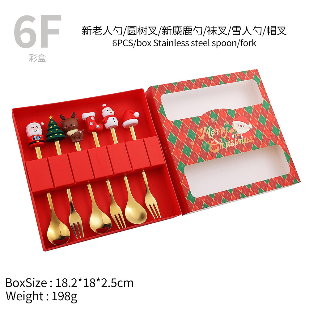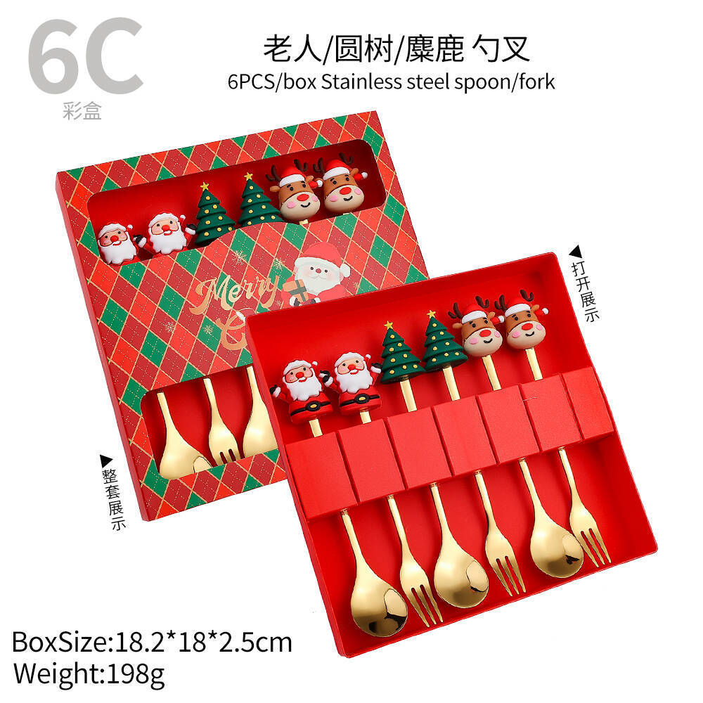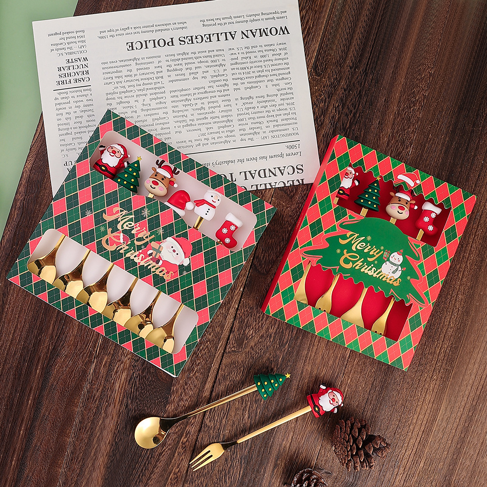 圣诞节勺子餐具套装 卡通圣诞树勺子麋鹿叉子节日礼盒甜品勺礼品