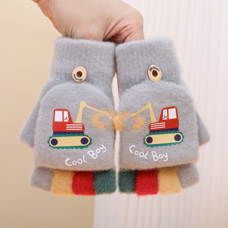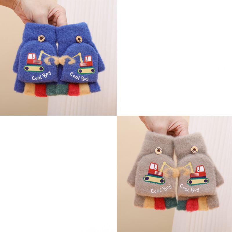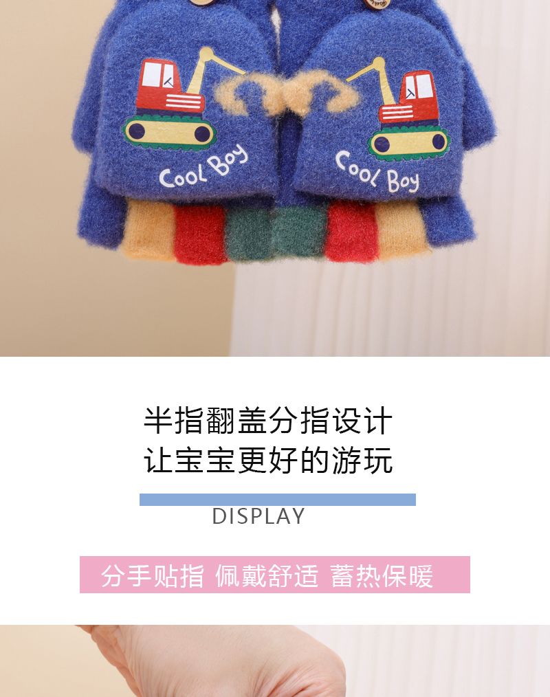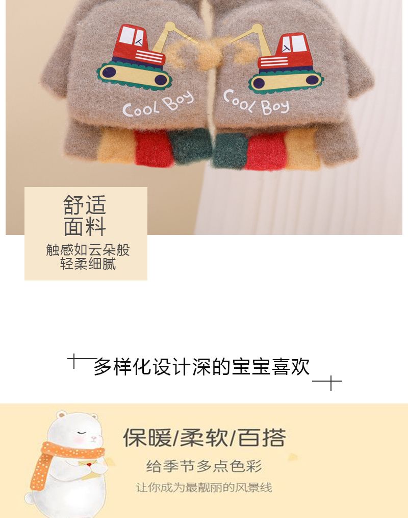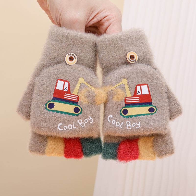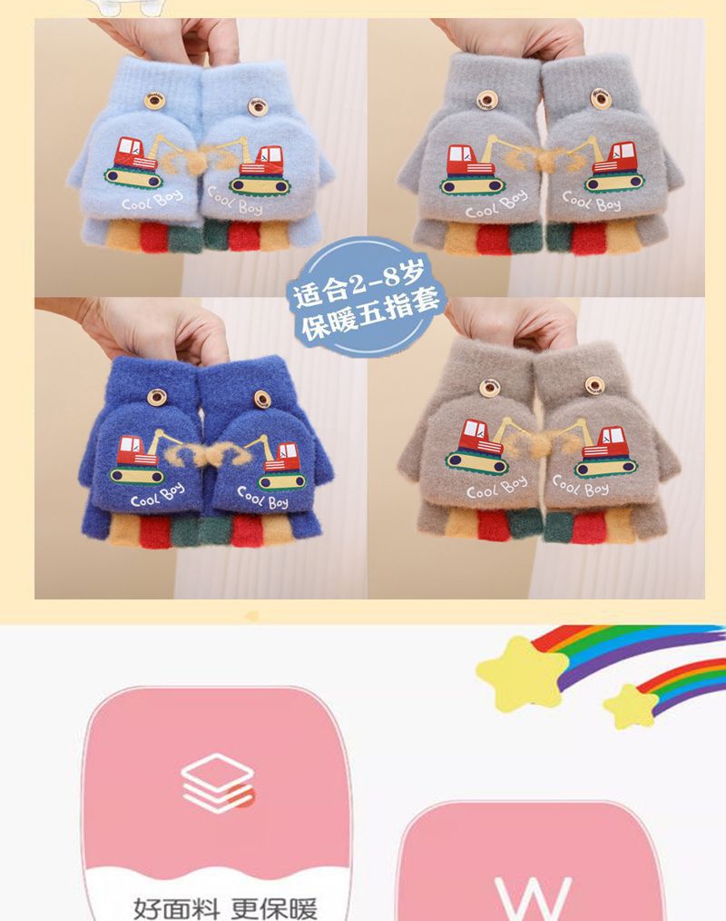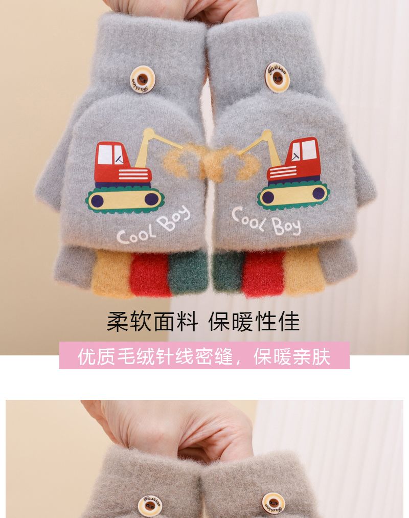 儿童手套秋冬保暖小男孩卡通可爱挖掘机半指翻盖两用写字针织毛线