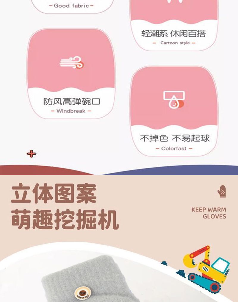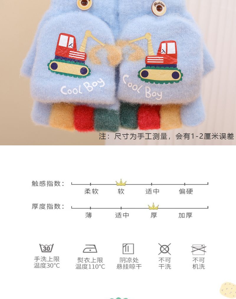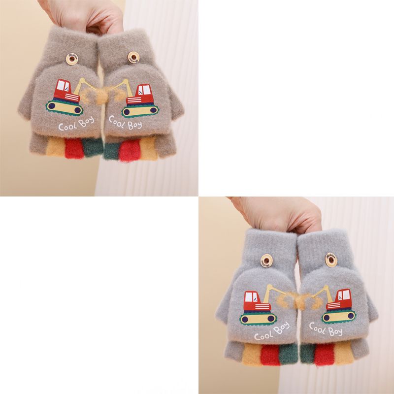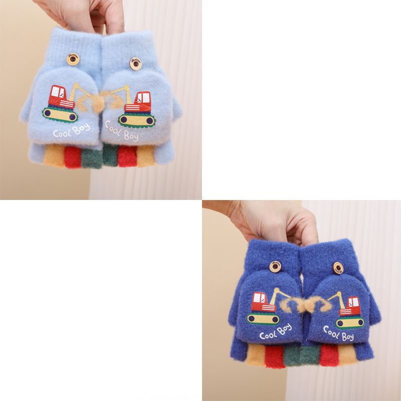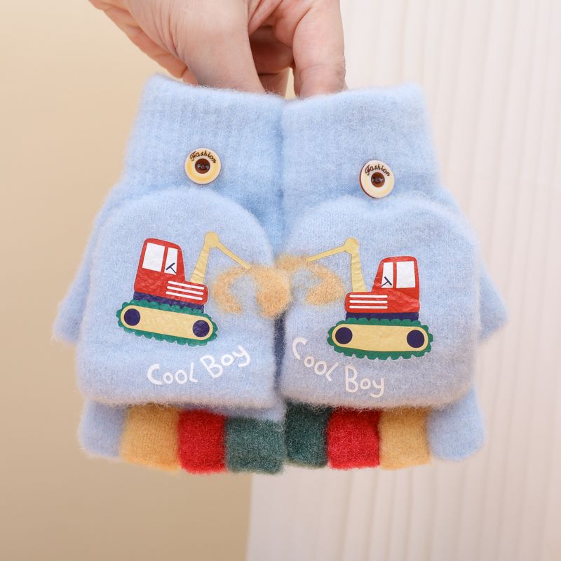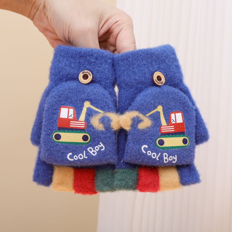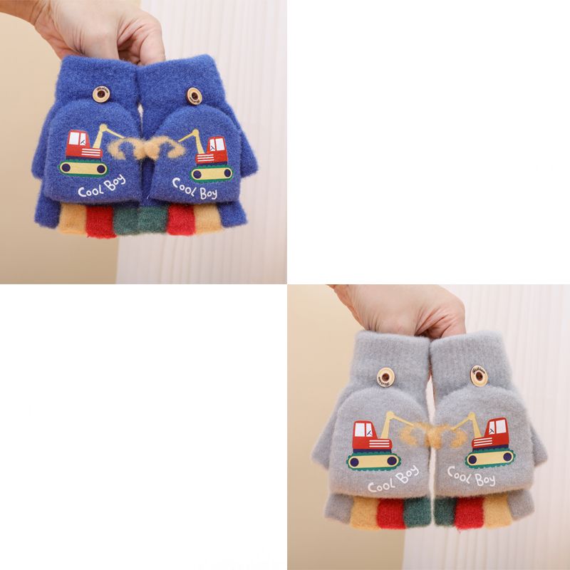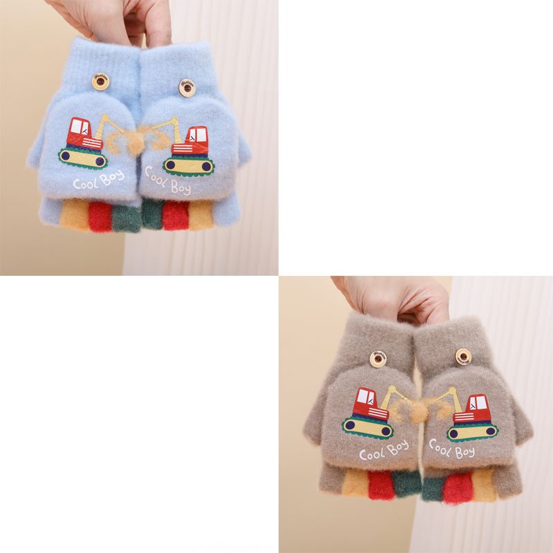 儿童手套秋冬保暖小男孩卡通可爱挖掘机半指翻盖两用写字针织毛线
