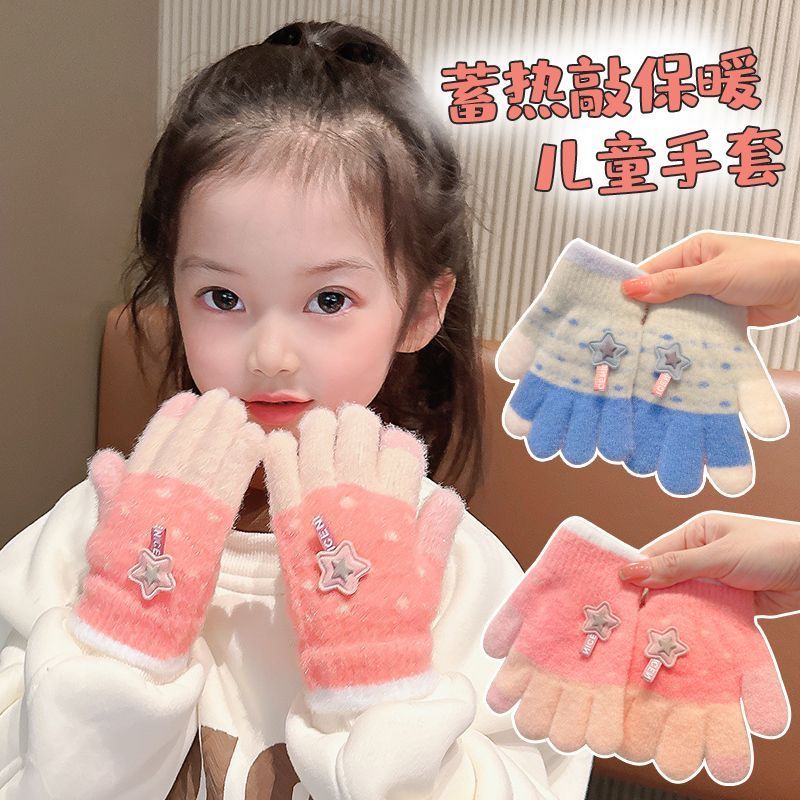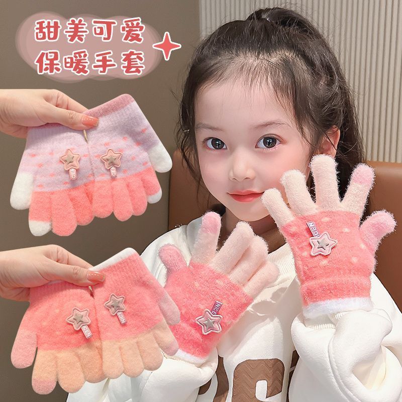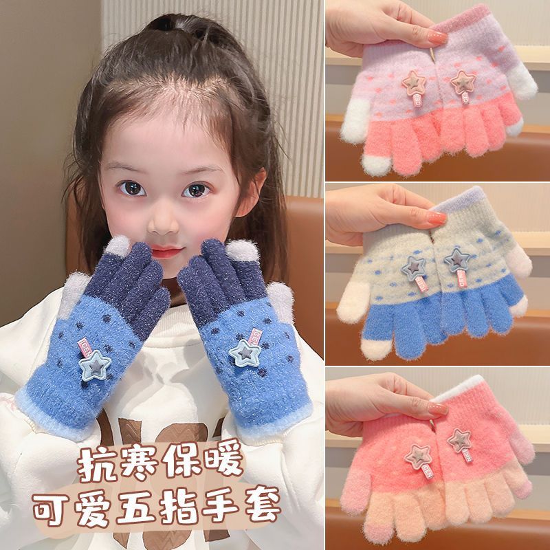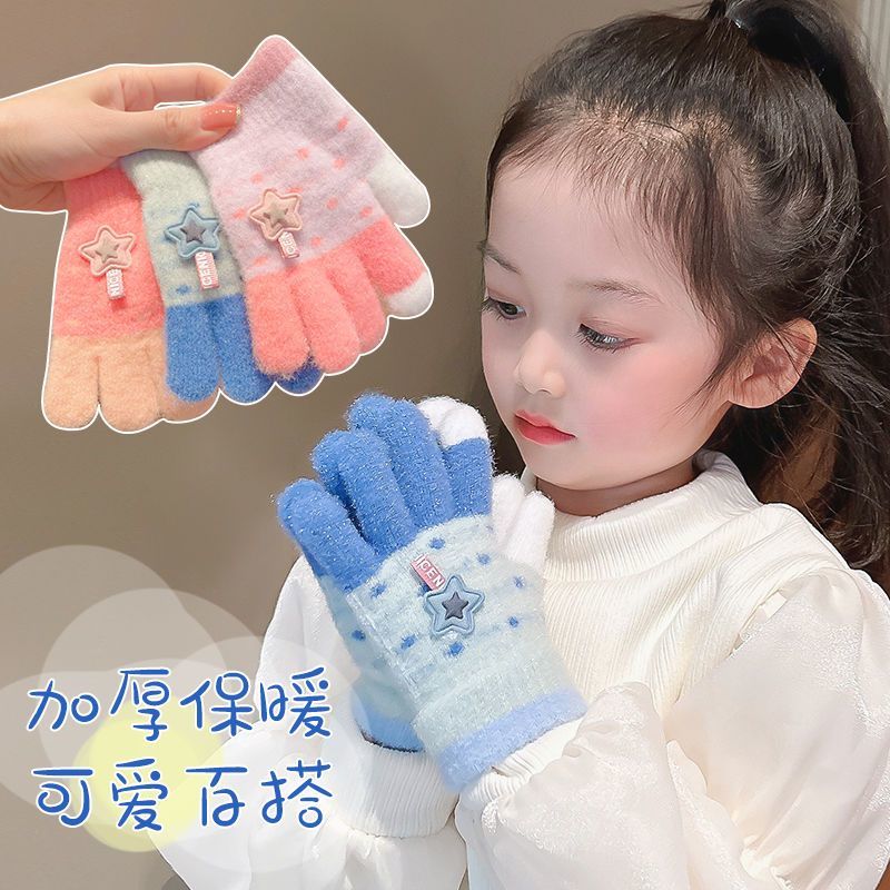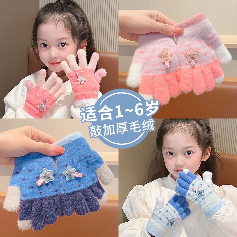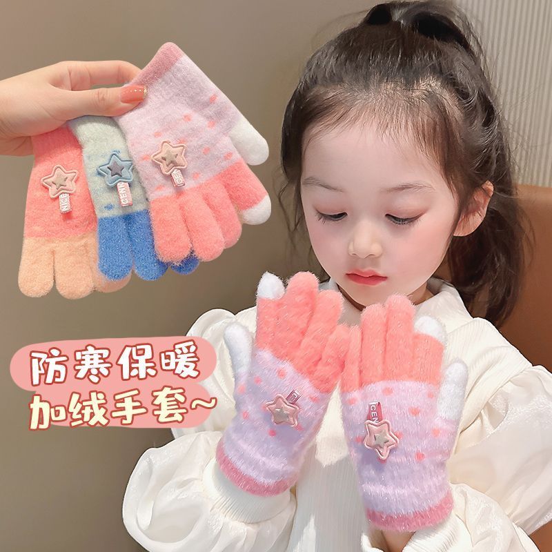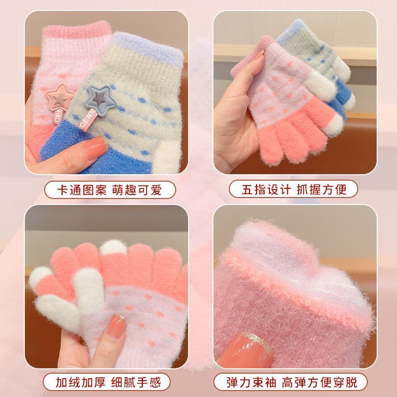 秋冬季儿童手套小孩可爱保暖女童男童加绒毛线宝宝针织五指套冬天