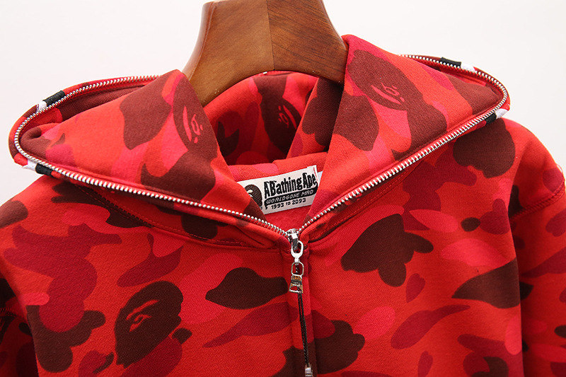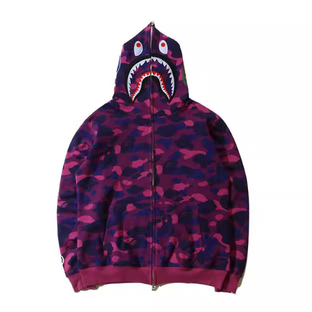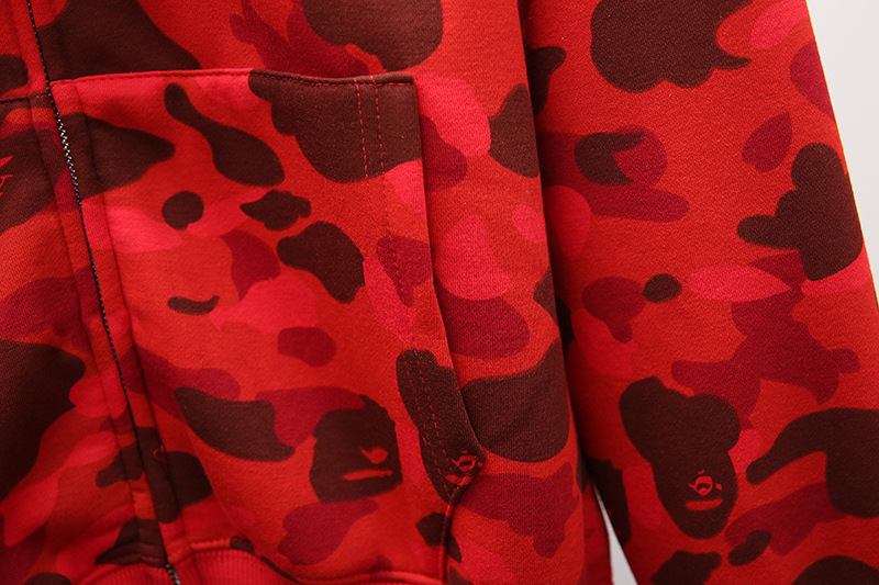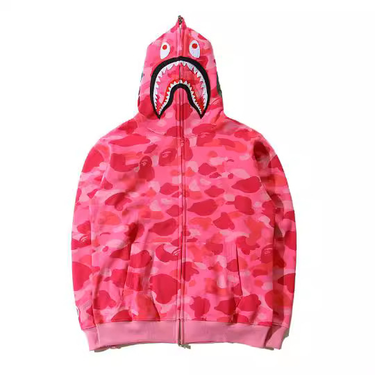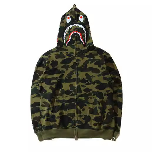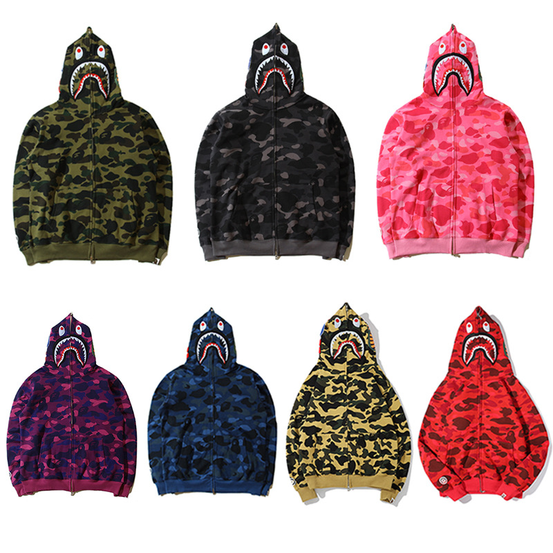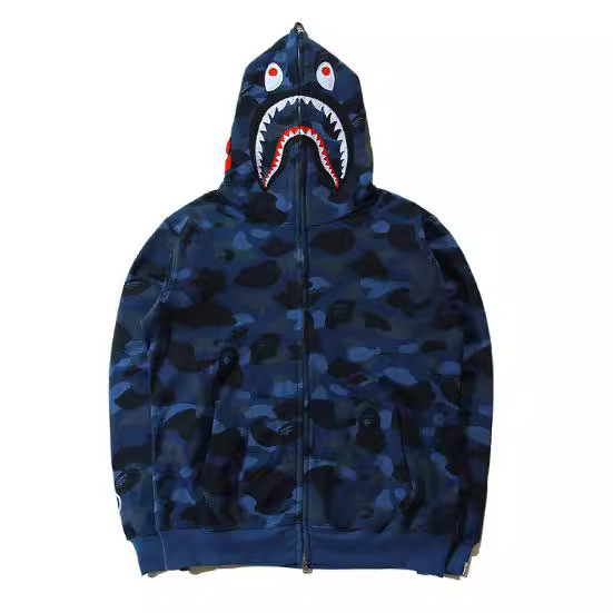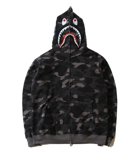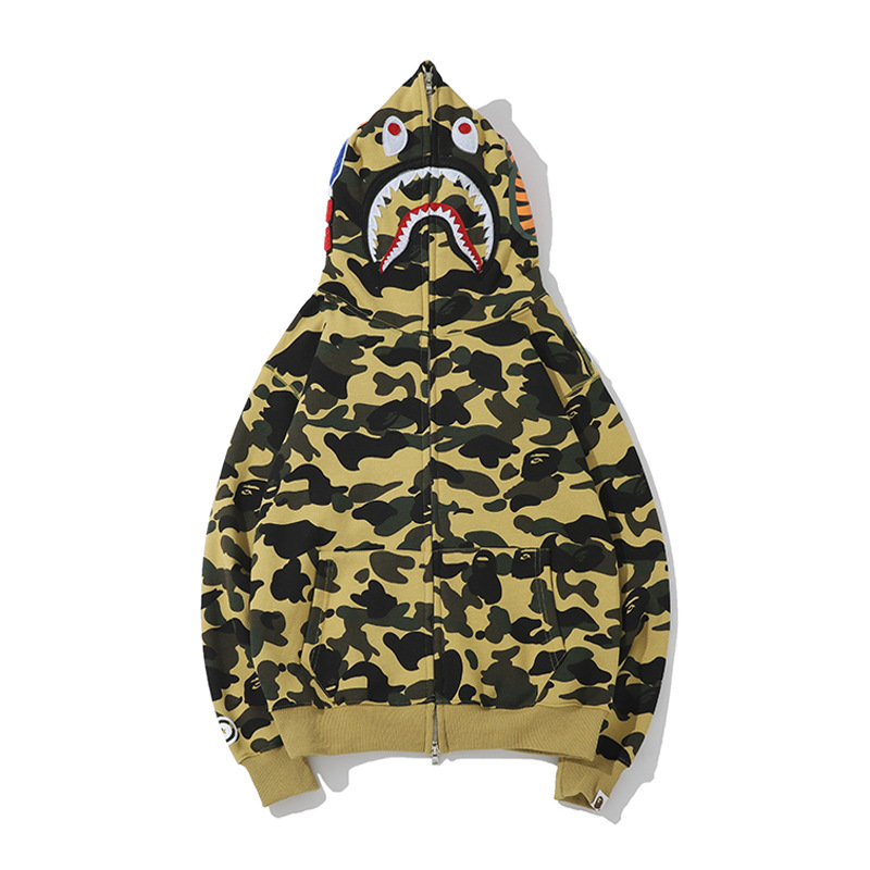 跨境外贸潮牌鲨鱼卫衣男女刺绣迷彩印花秋冬款加绒开衫连帽外套
