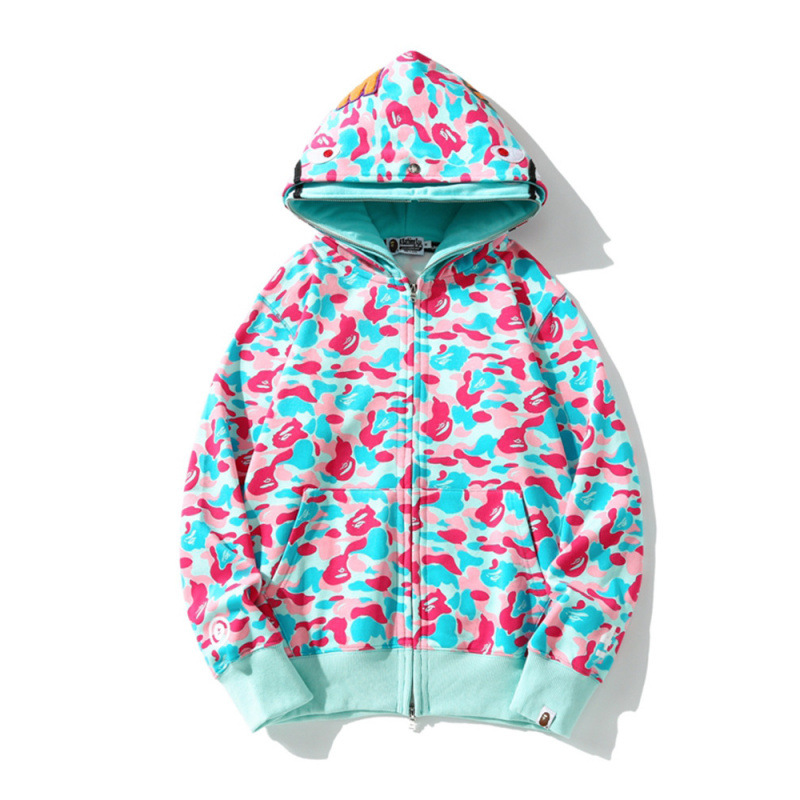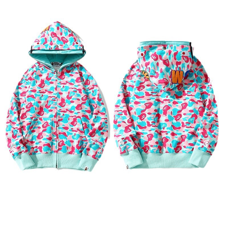 外贸跨境鲨鱼双帽卫衣男迈阿密联名迷彩刺绣徽章印花连帽开衫外套