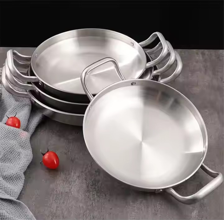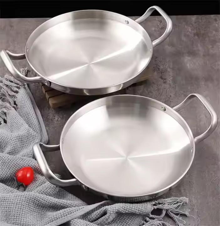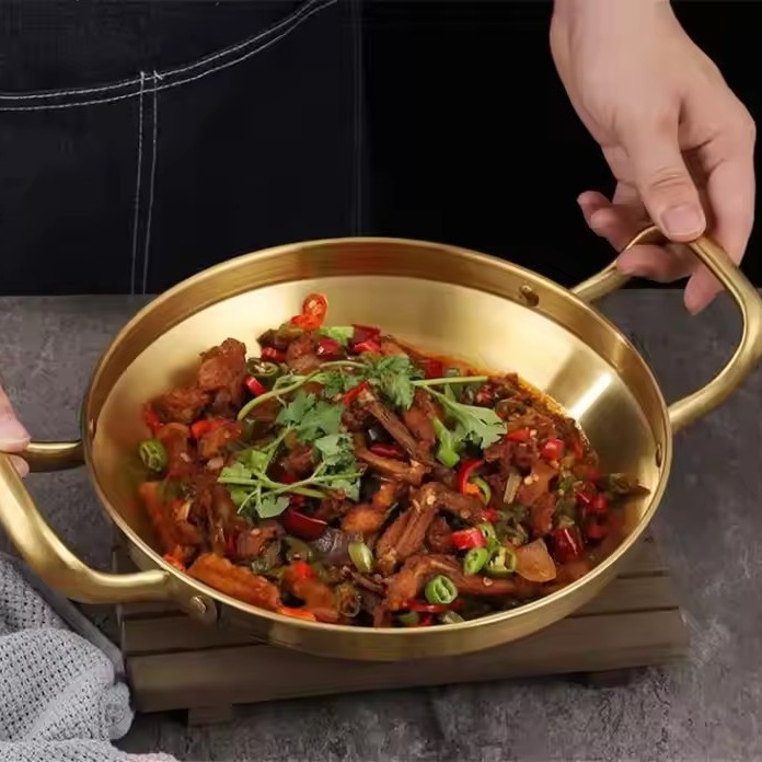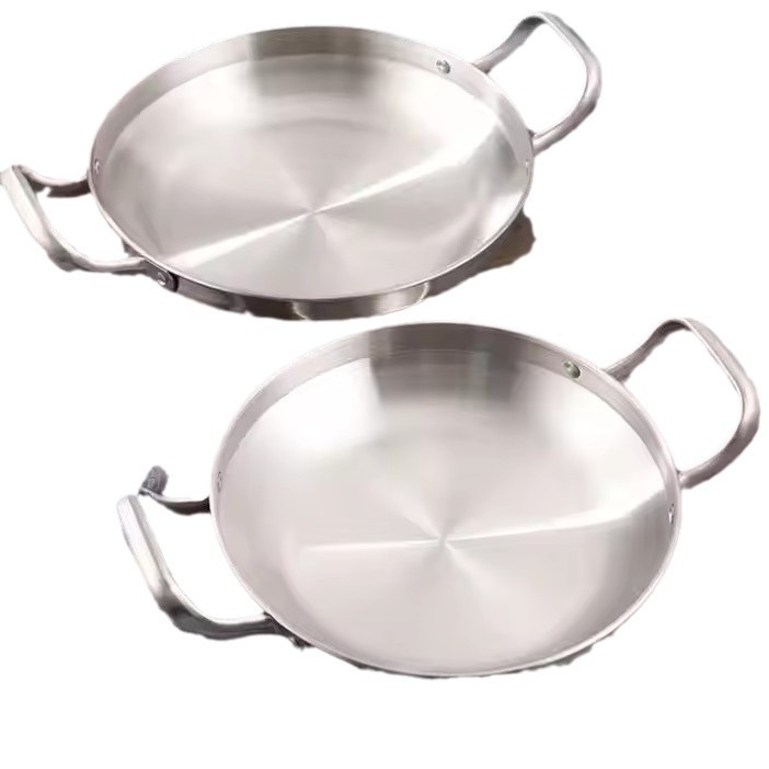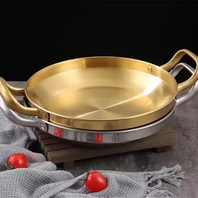 韩式不锈钢干锅海鲜锅火锅金色平底浅锅菜盘商用双耳小炒锅子加厚
