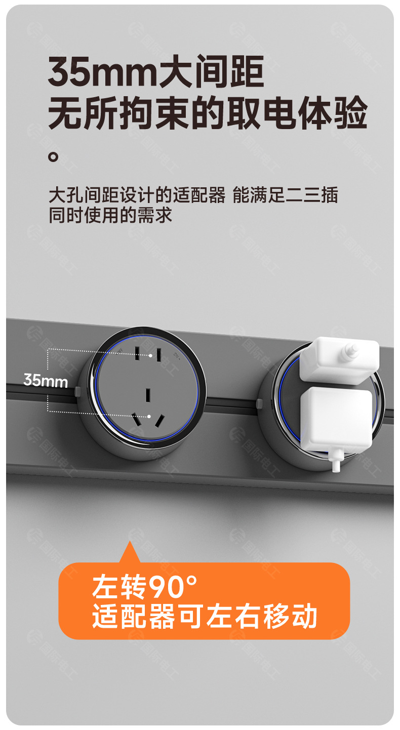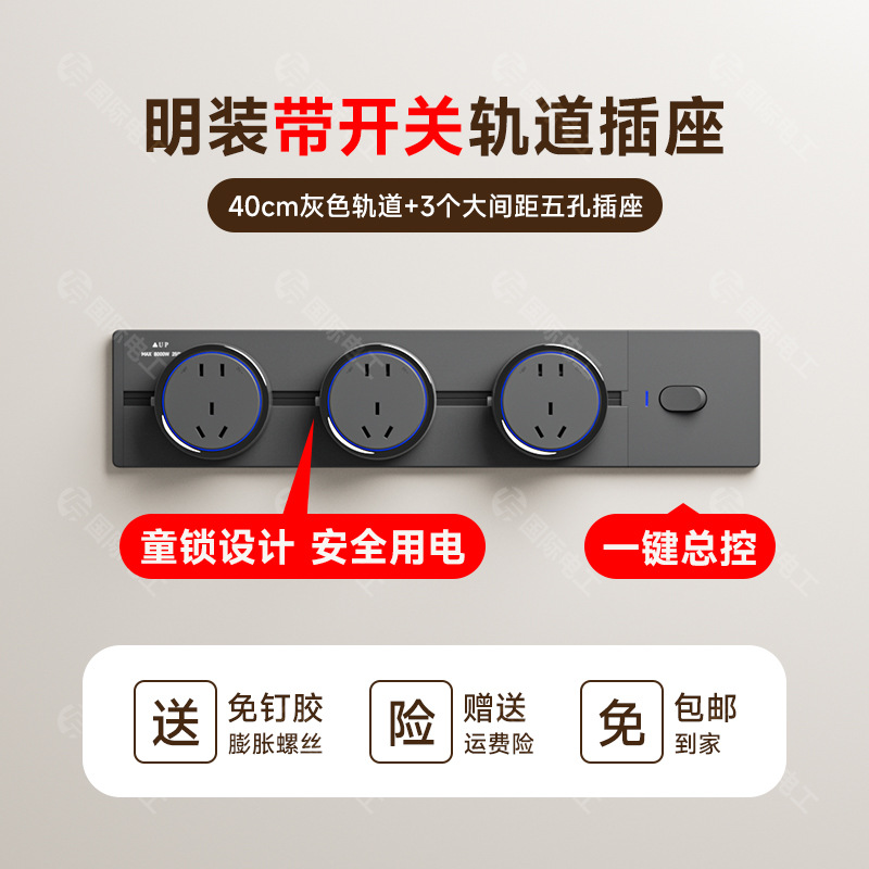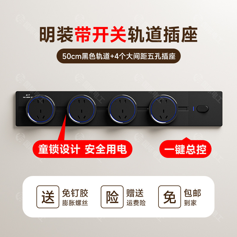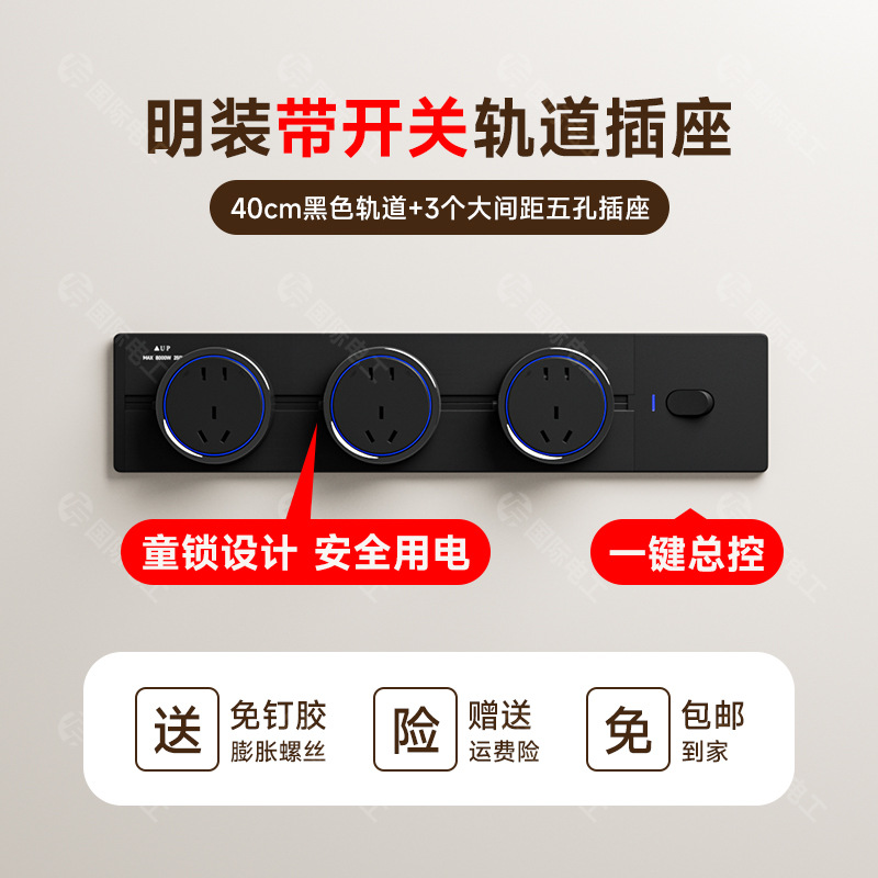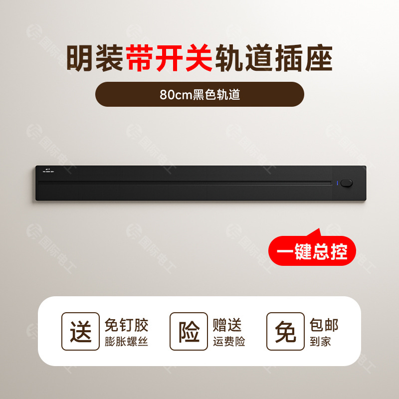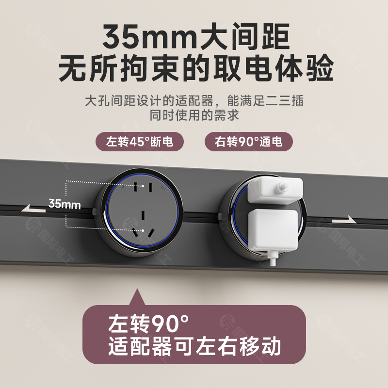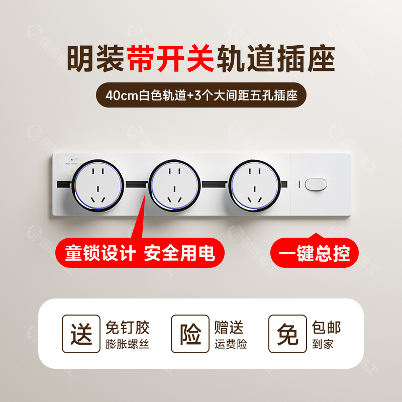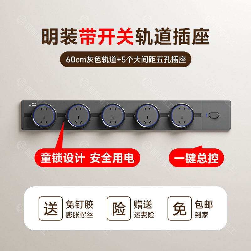 TEP国际电工明装轨道插座一键断电可移动排插橱柜大间距五孔插座