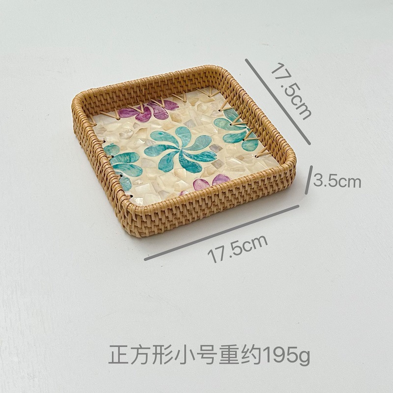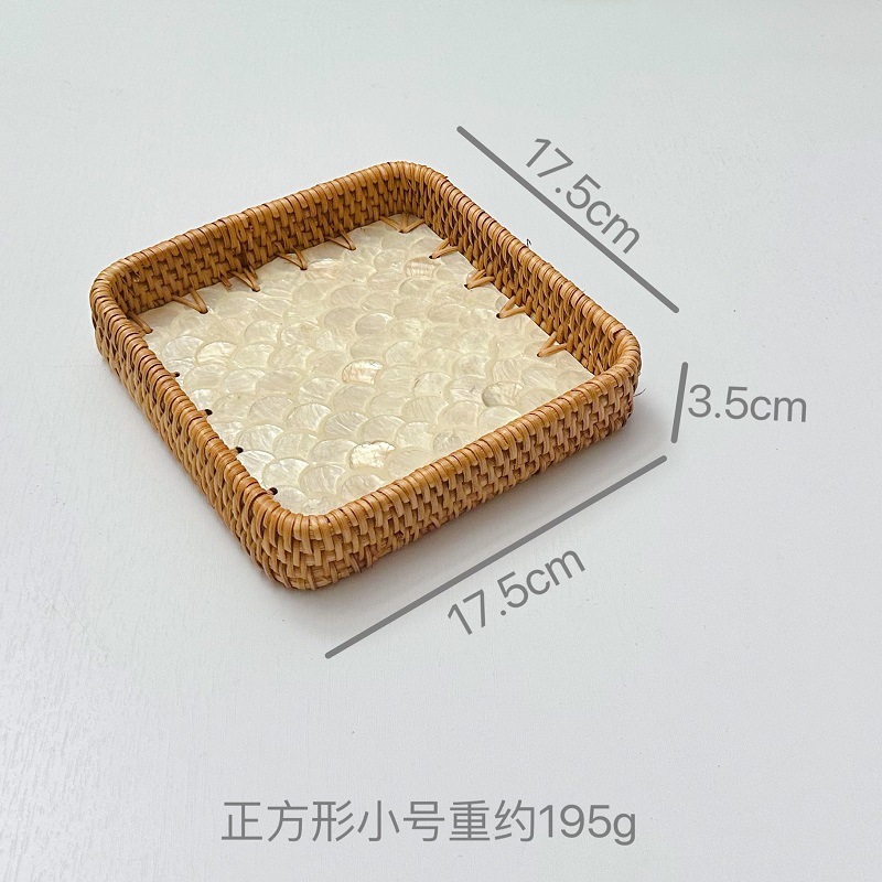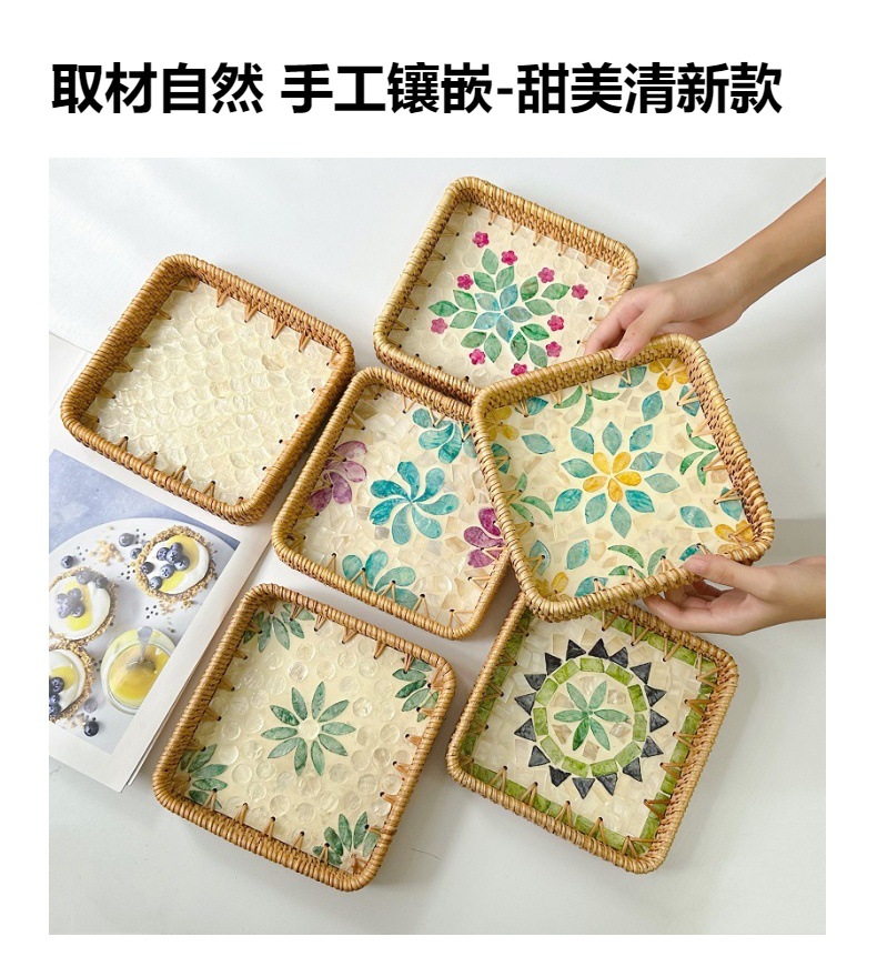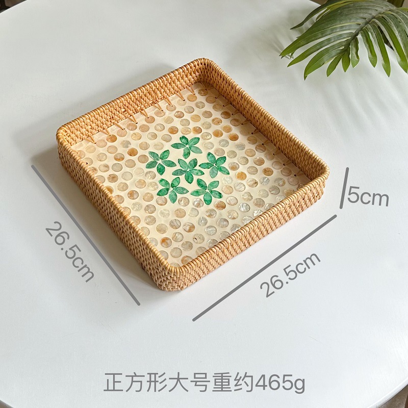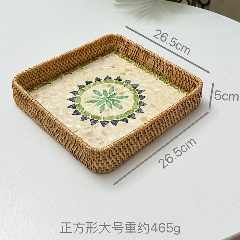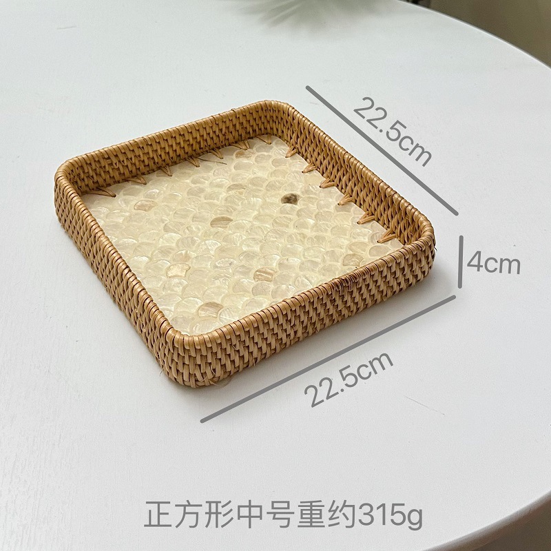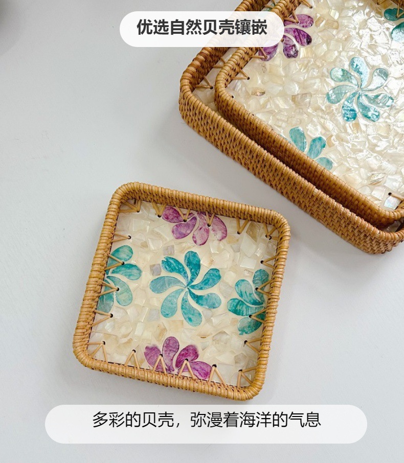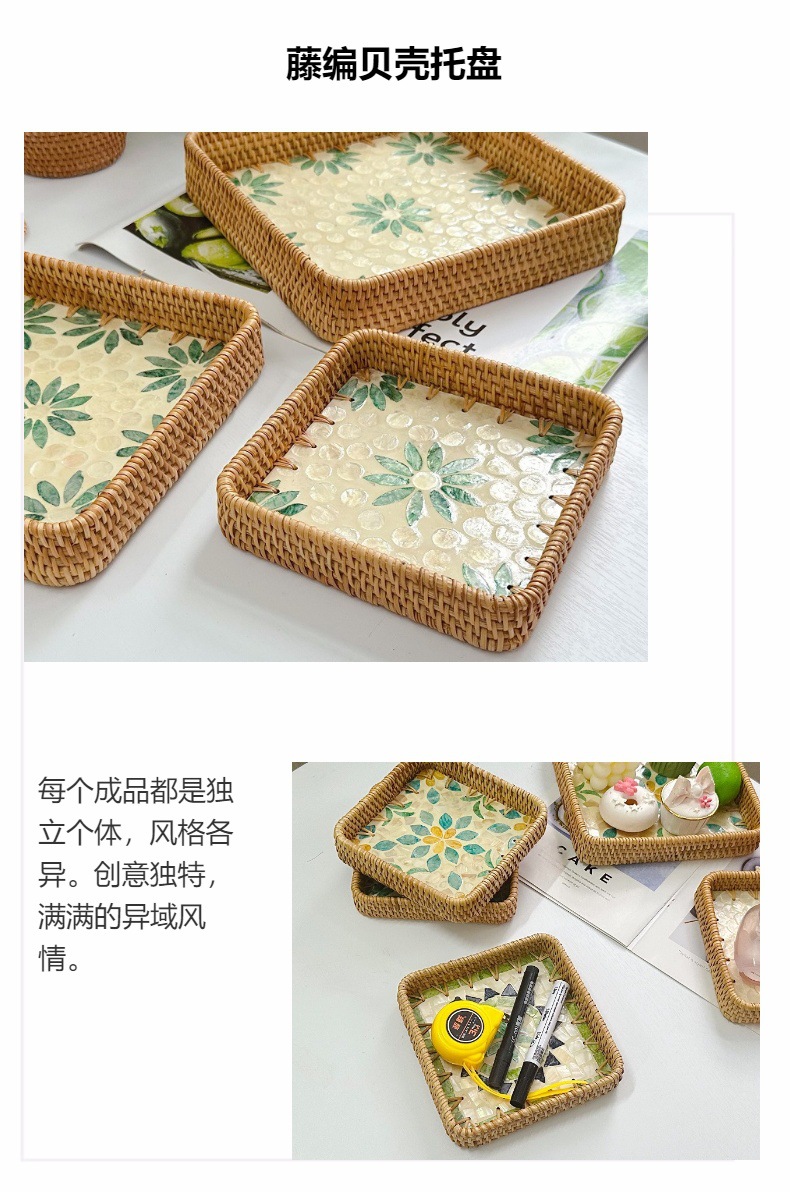 藤编彩贝壳北欧创意手工果盘装饰摆件首饰收纳托盘茶盘圆形盘
