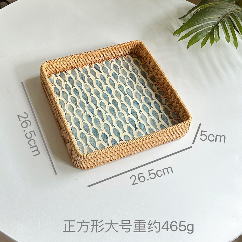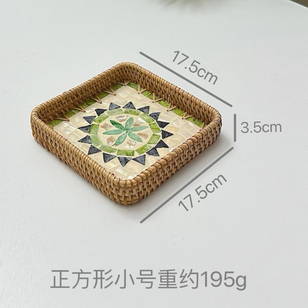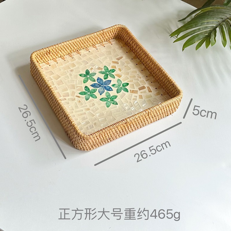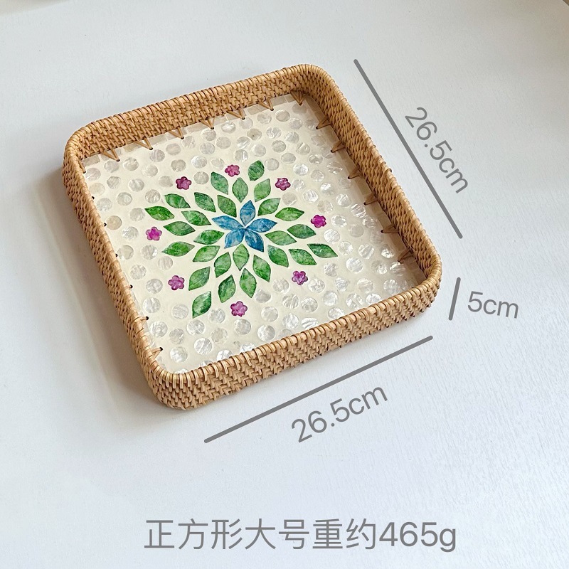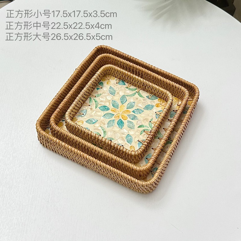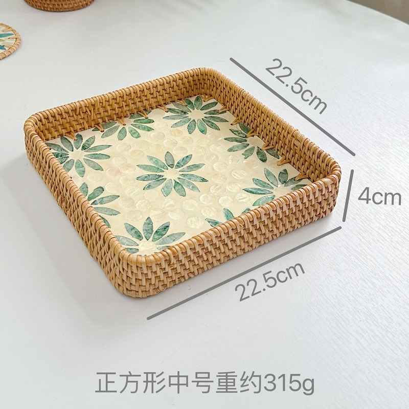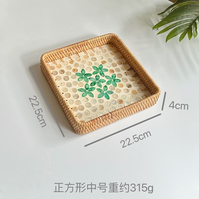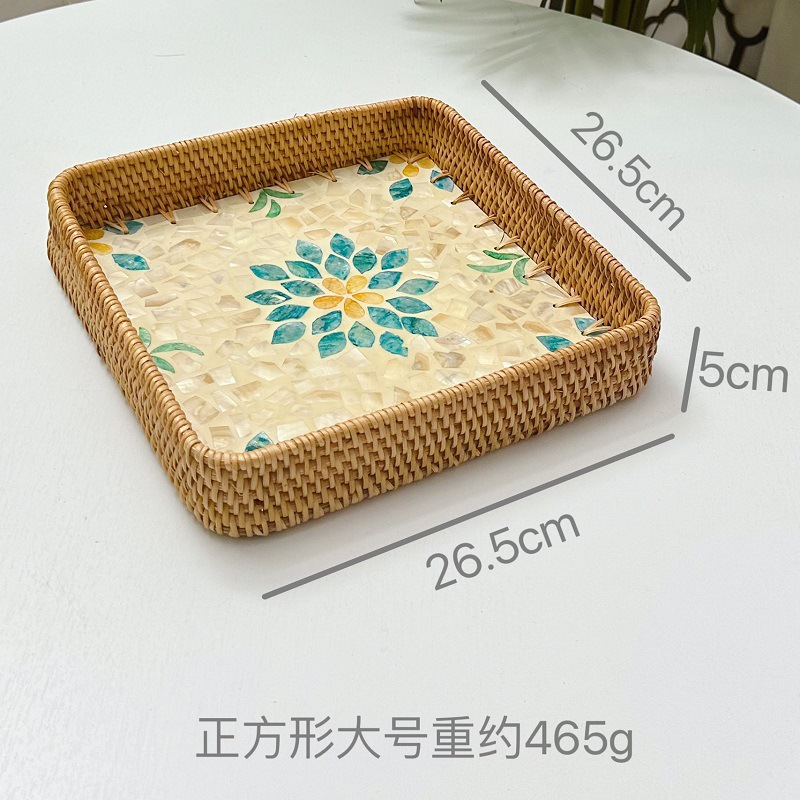 藤编彩贝壳北欧创意手工果盘装饰摆件首饰收纳托盘茶盘圆形盘