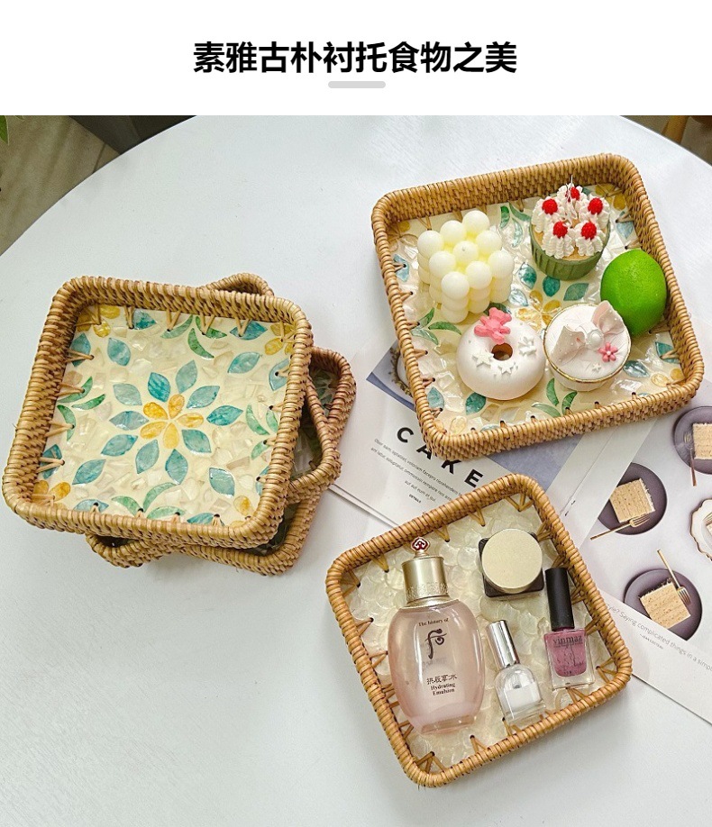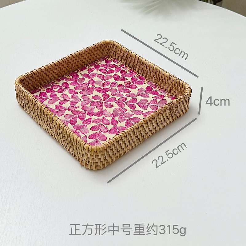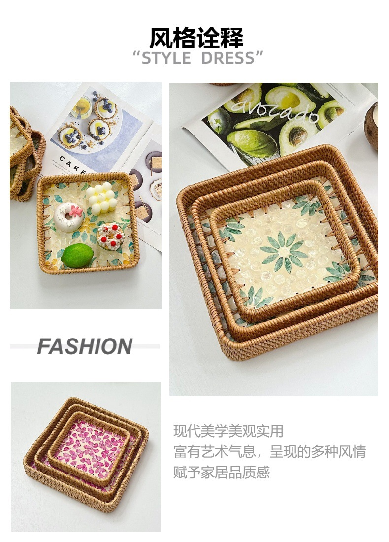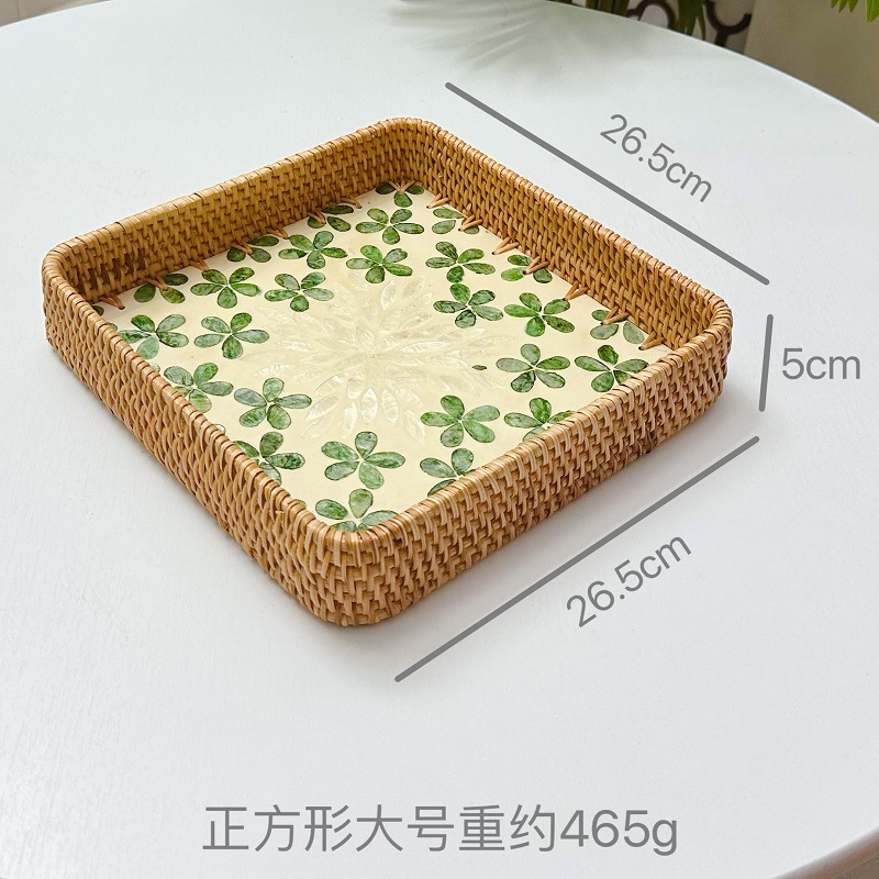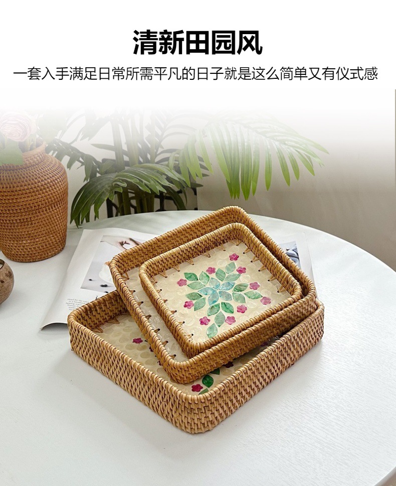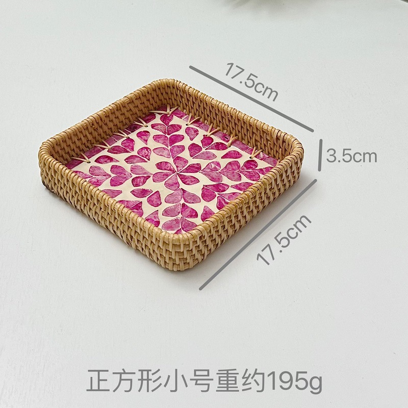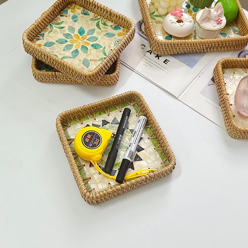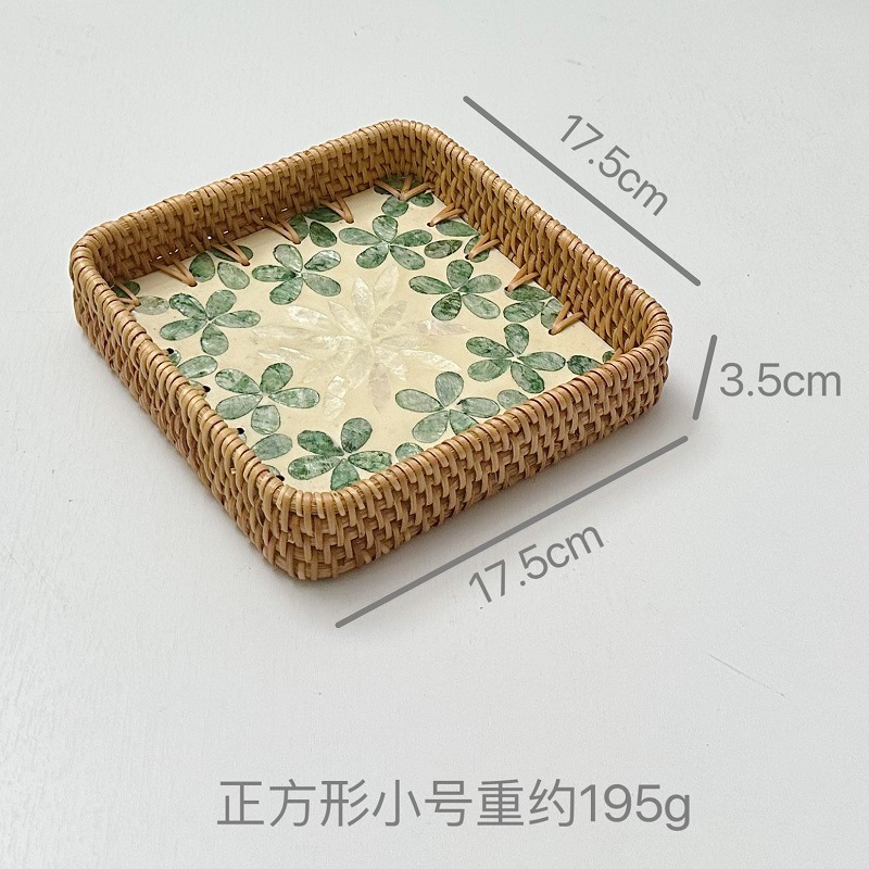 藤编彩贝壳北欧创意手工果盘装饰摆件首饰收纳托盘茶盘圆形盘