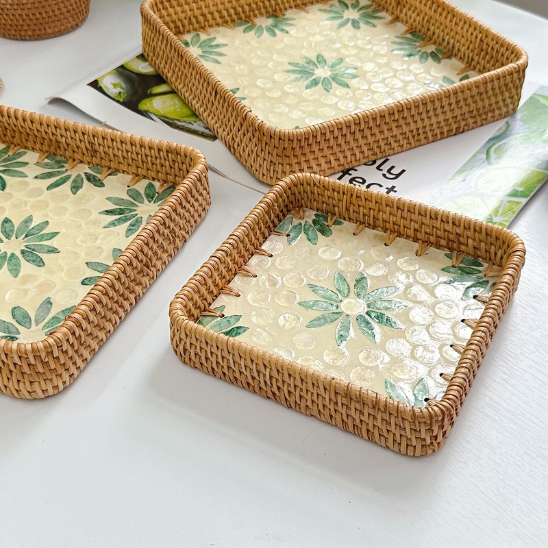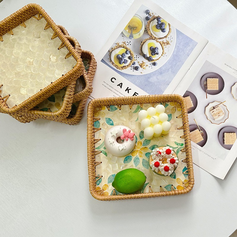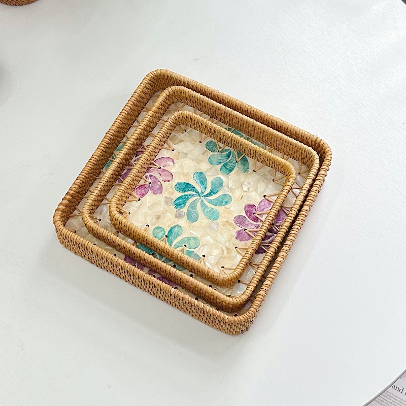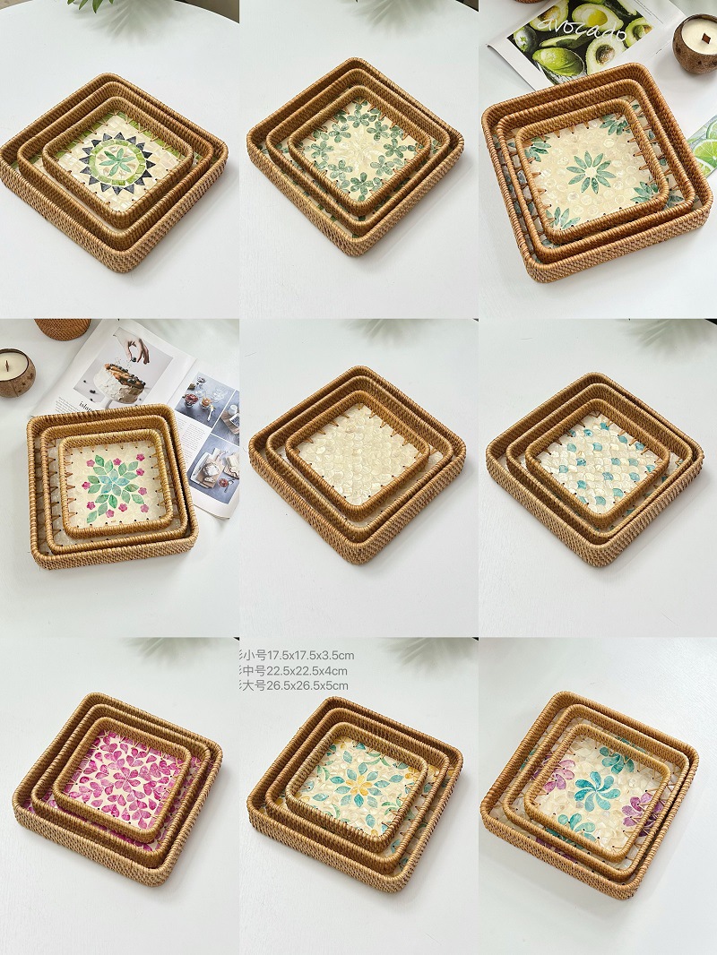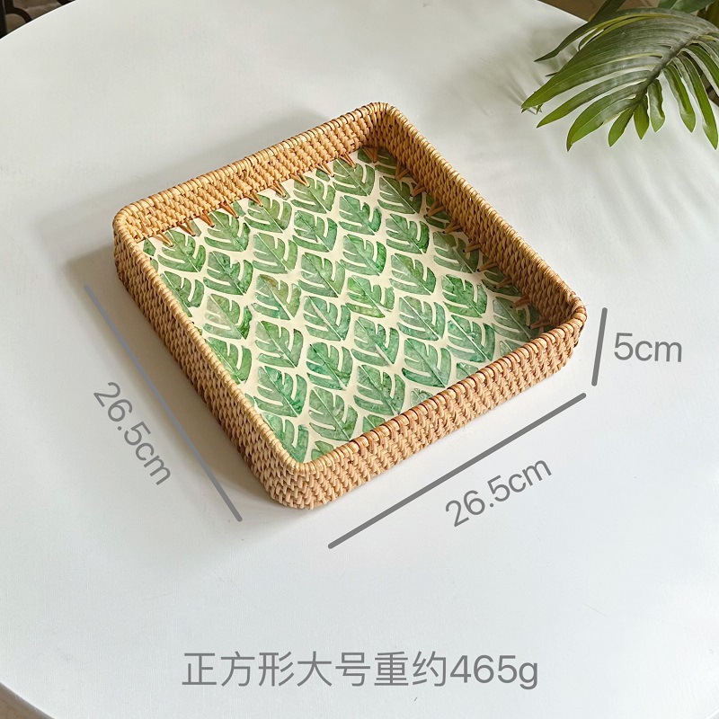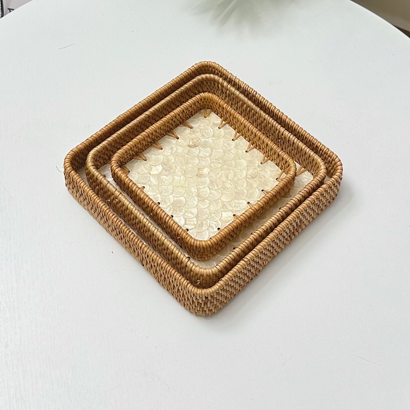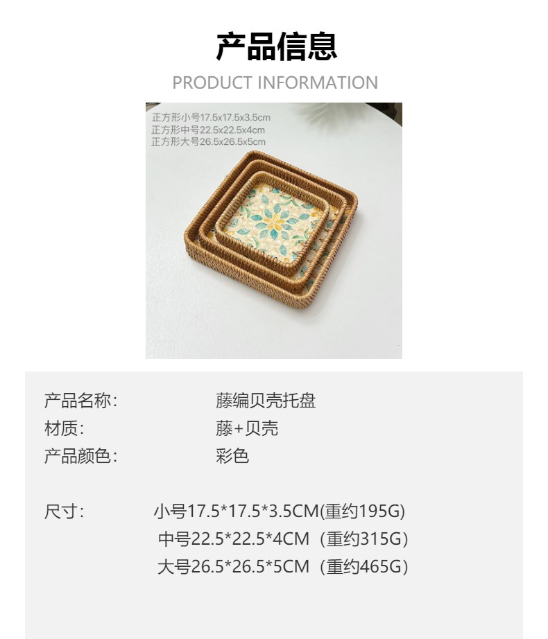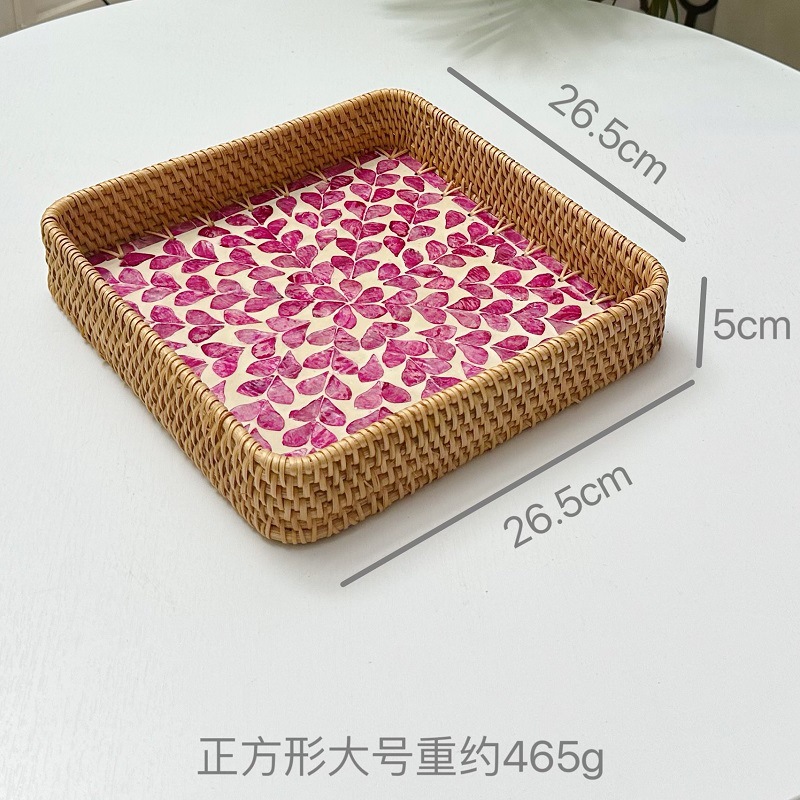 藤编彩贝壳北欧创意手工果盘装饰摆件首饰收纳托盘茶盘圆形盘