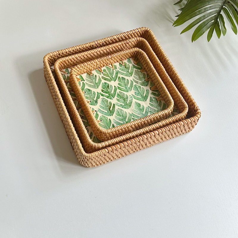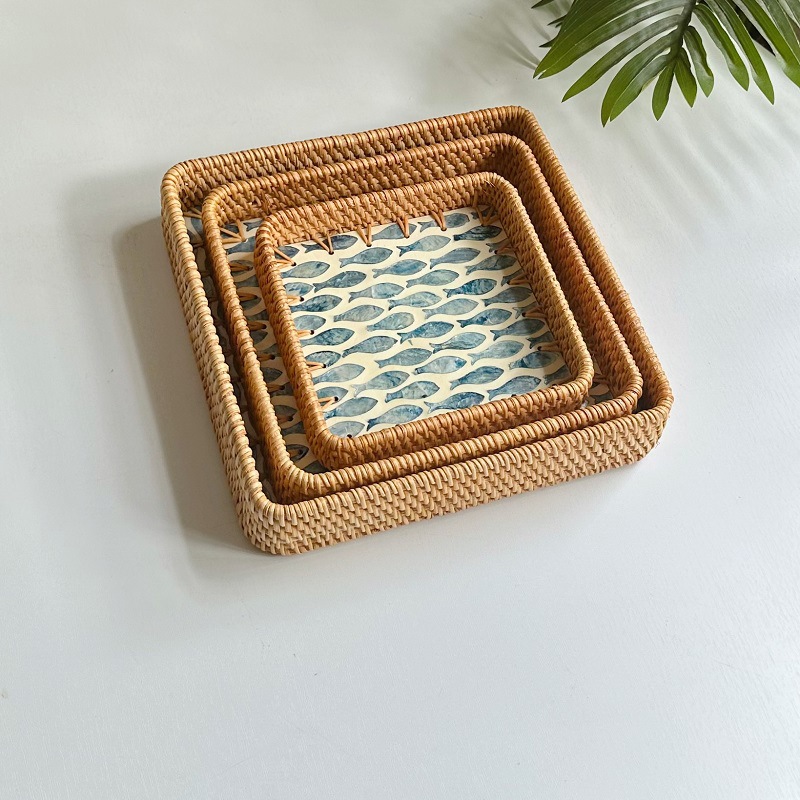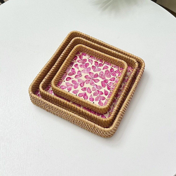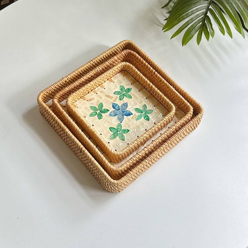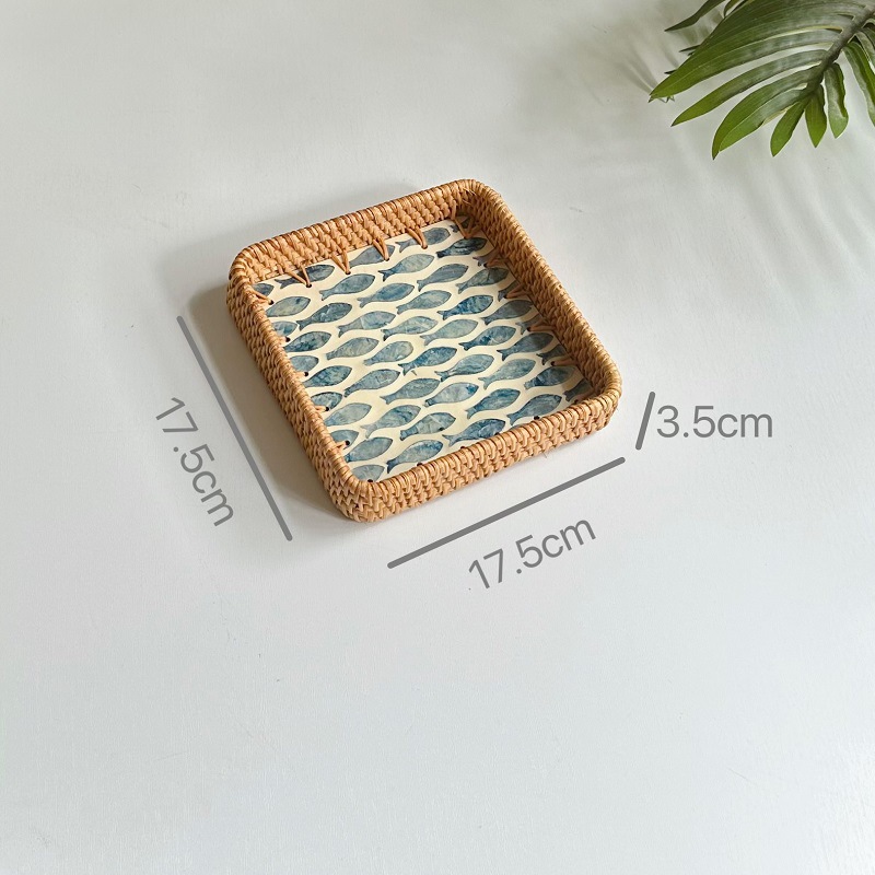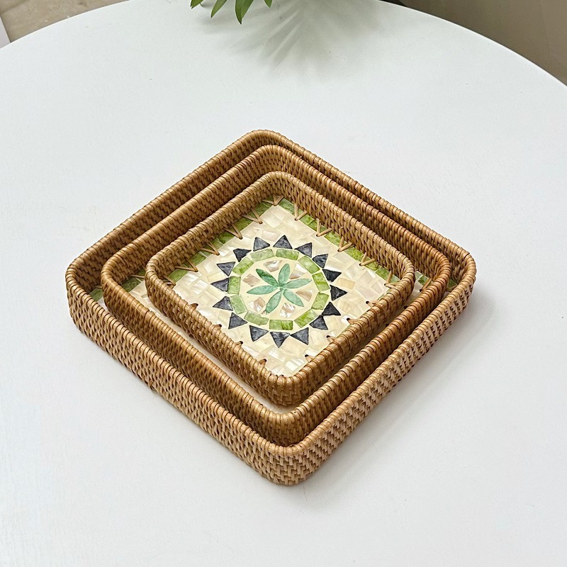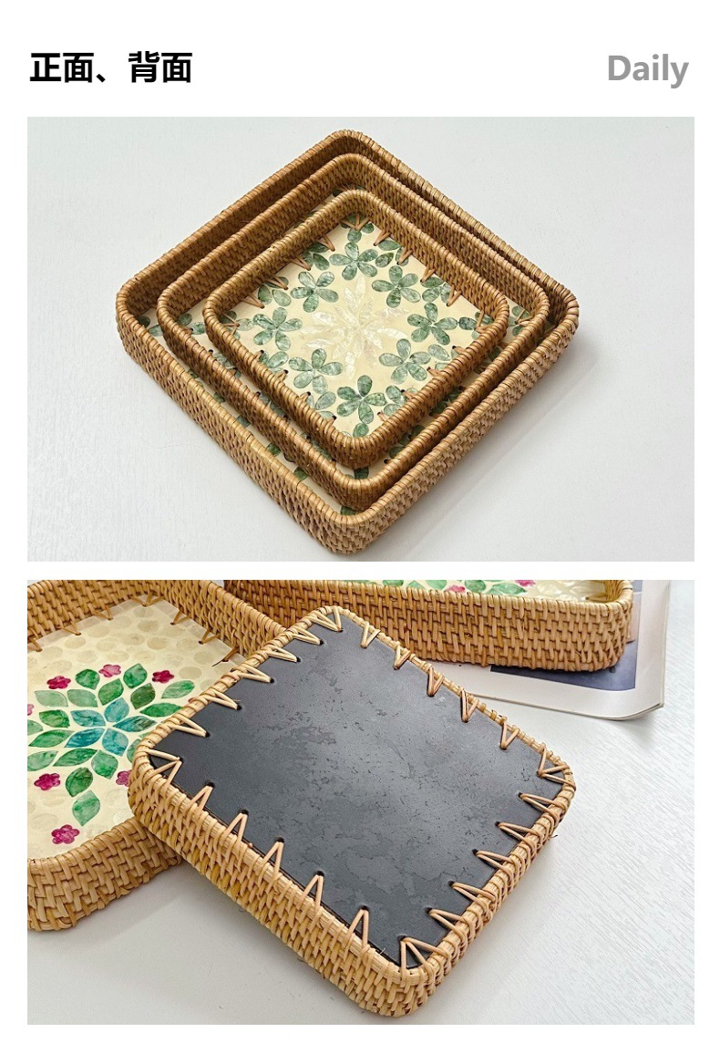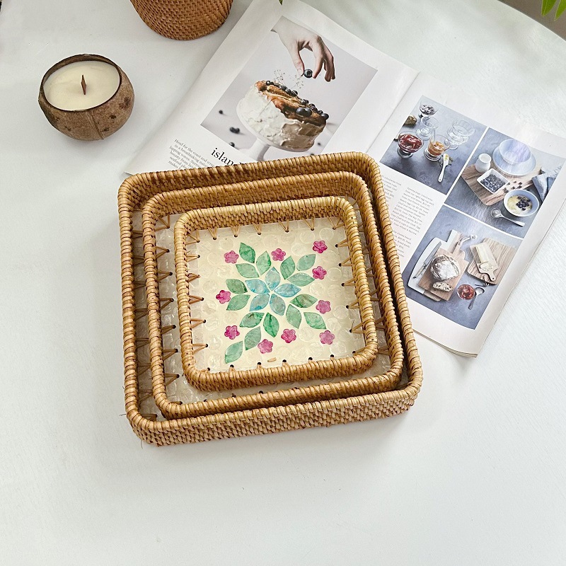 藤编彩贝壳北欧创意手工果盘装饰摆件首饰收纳托盘茶盘圆形盘