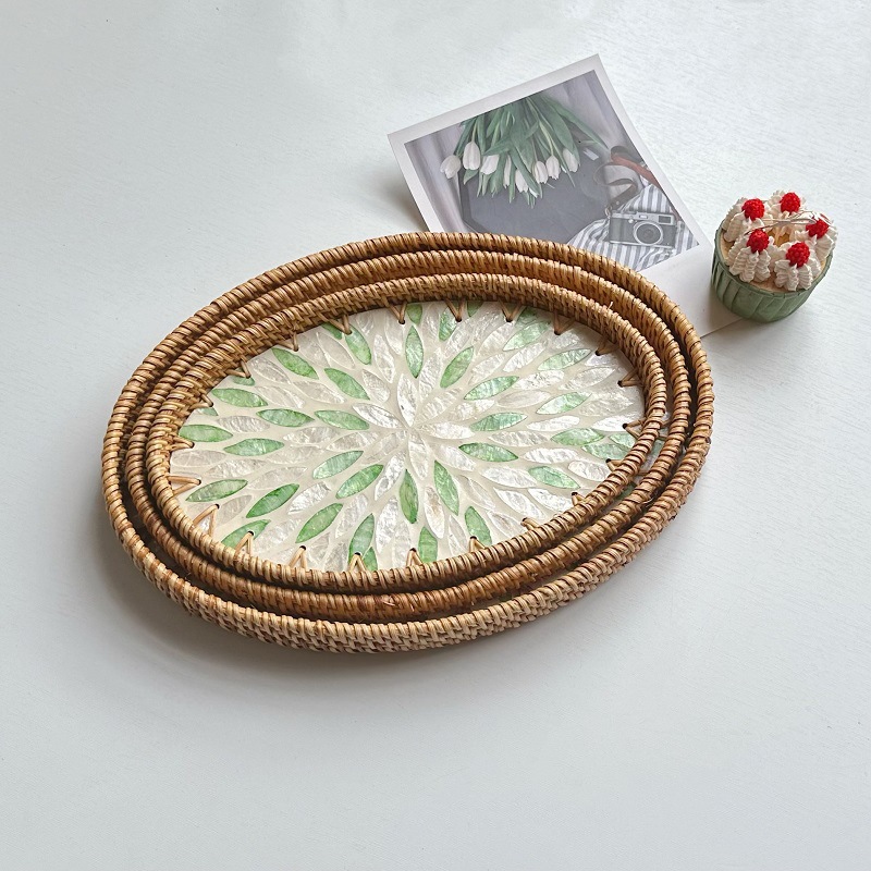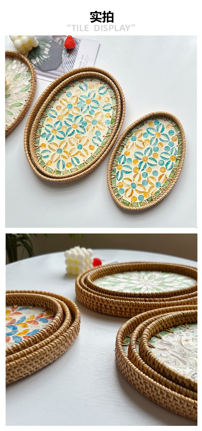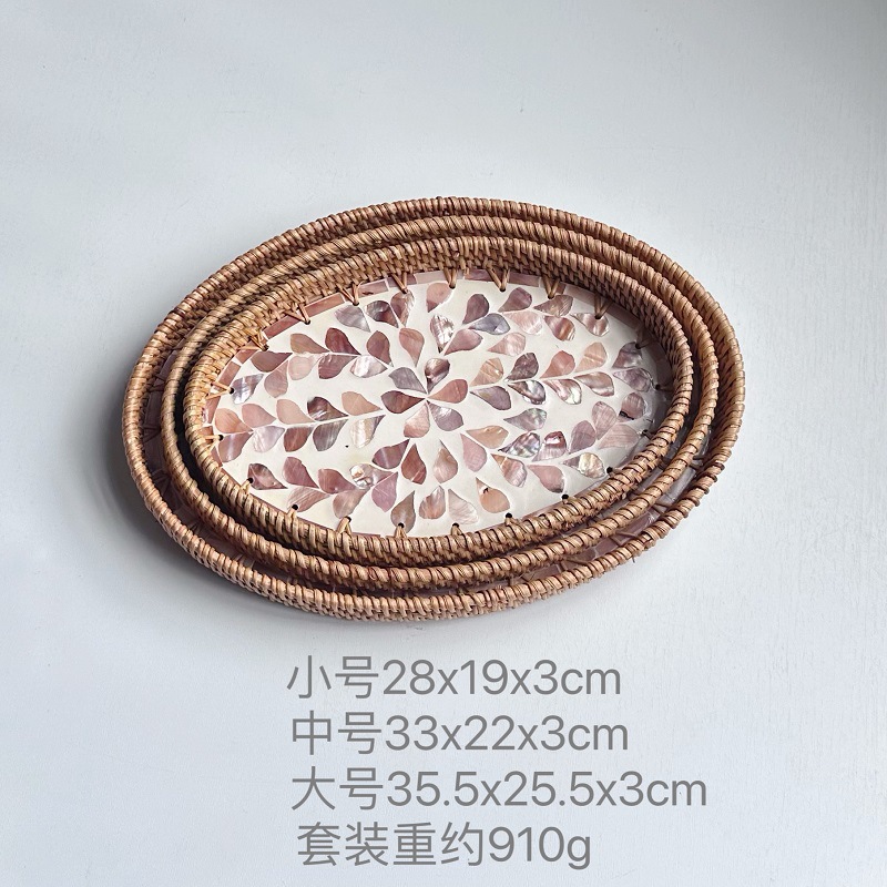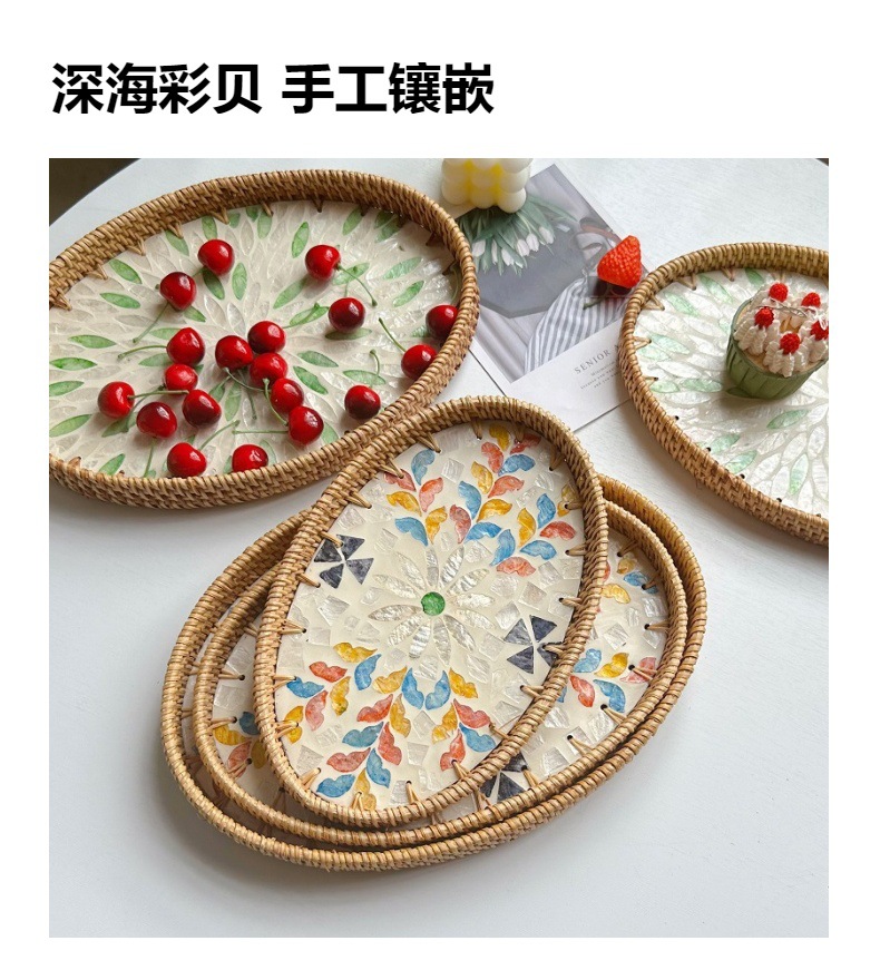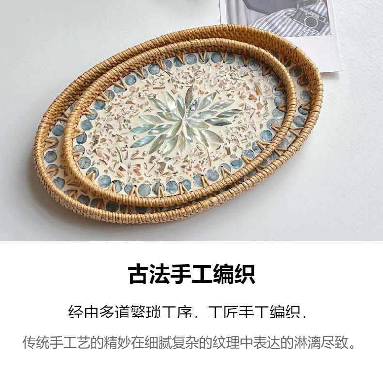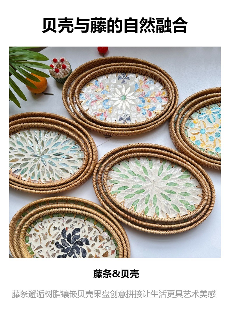 秋藤北欧创意藤编彩贝壳果盘装饰摆件首饰收纳托盘茶盘置物盘