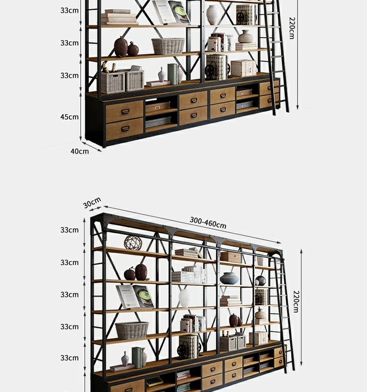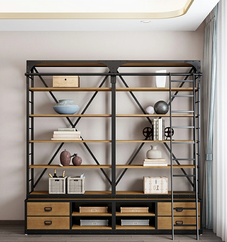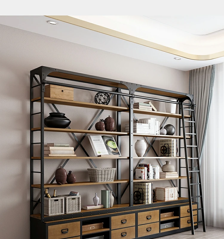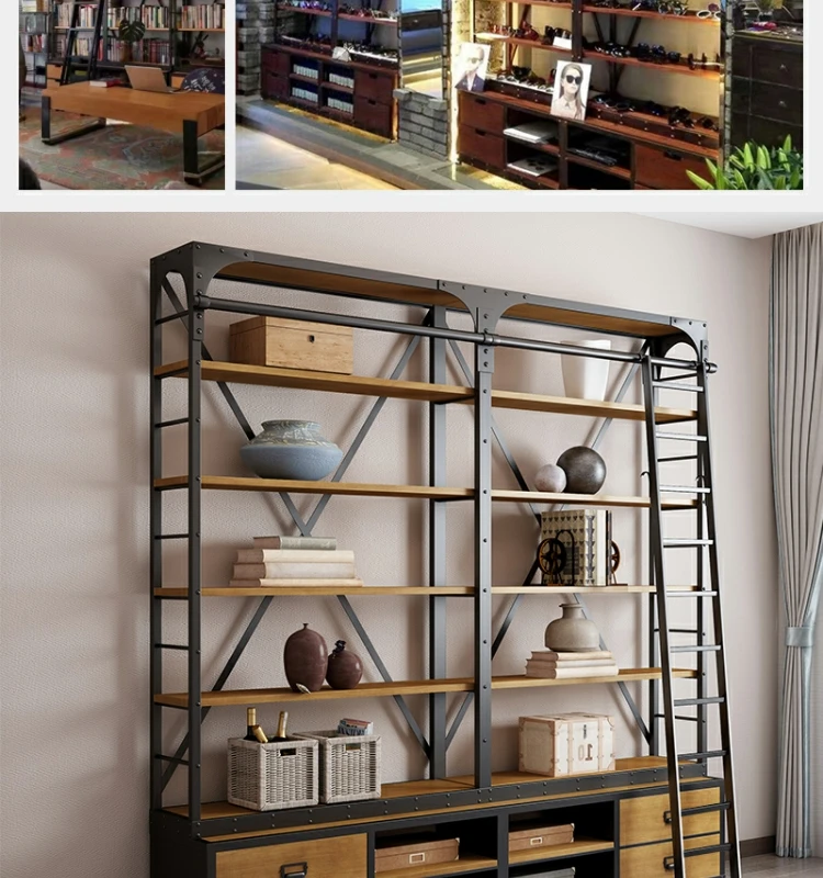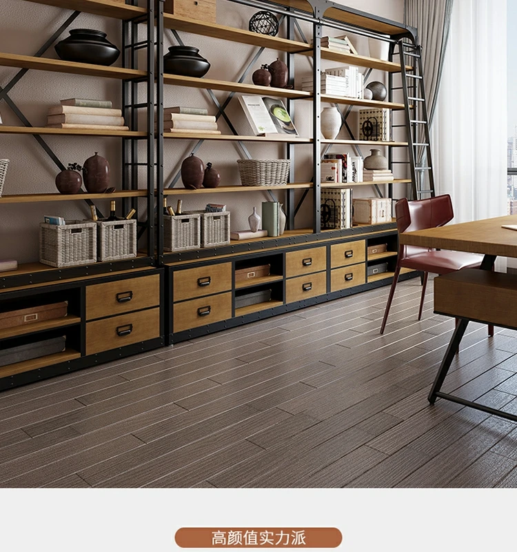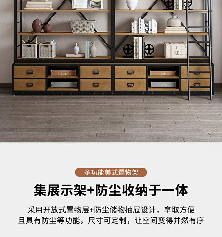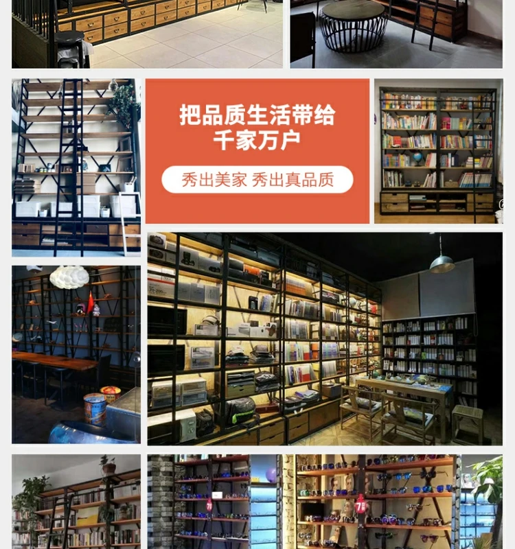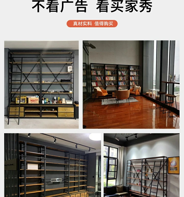 loft美式工业风家具铁艺书架置物架落地实木收纳客厅满墙书柜定制