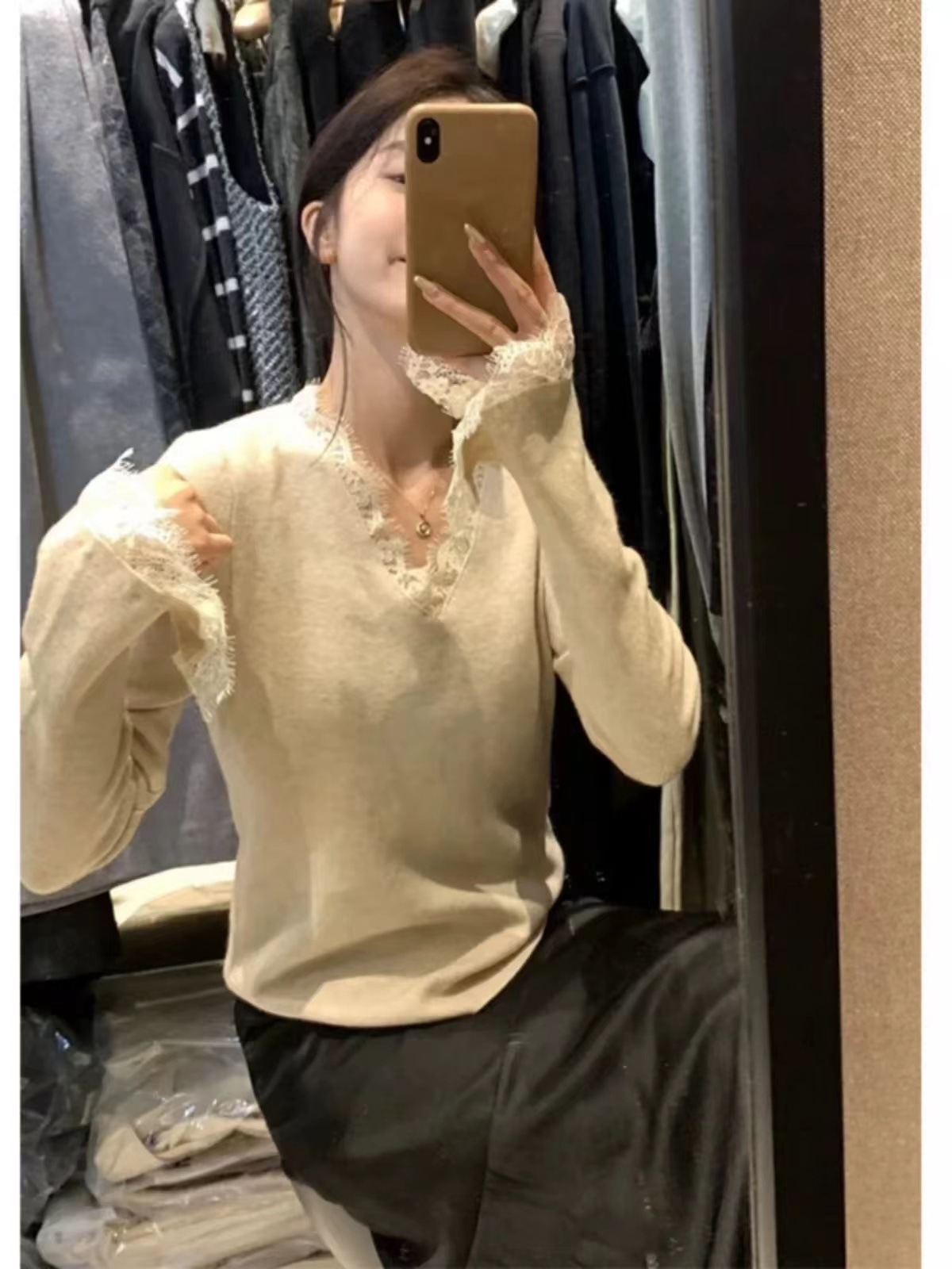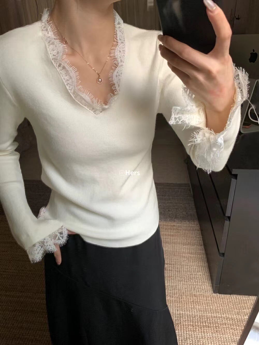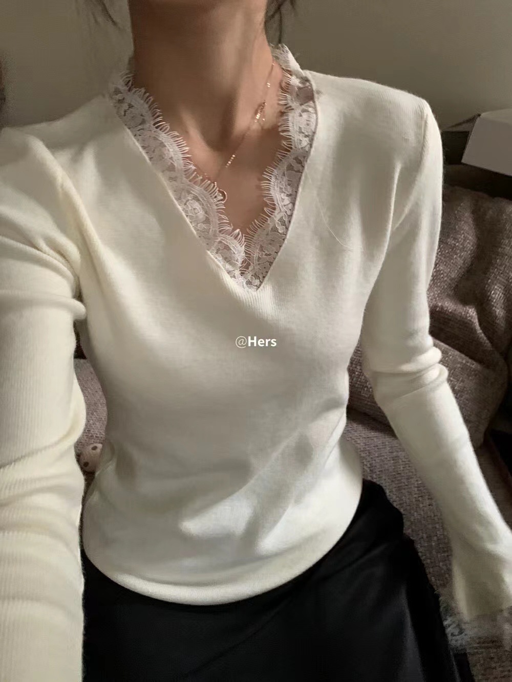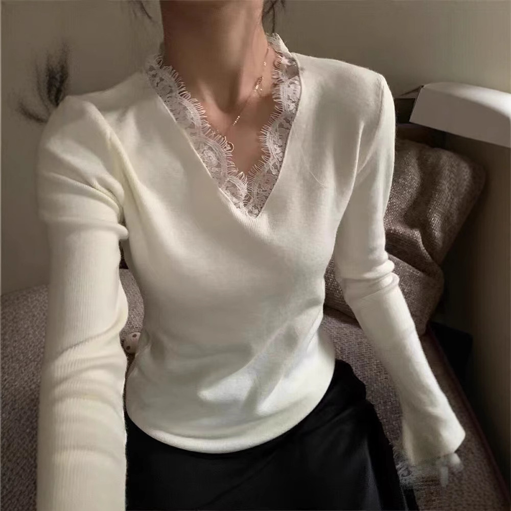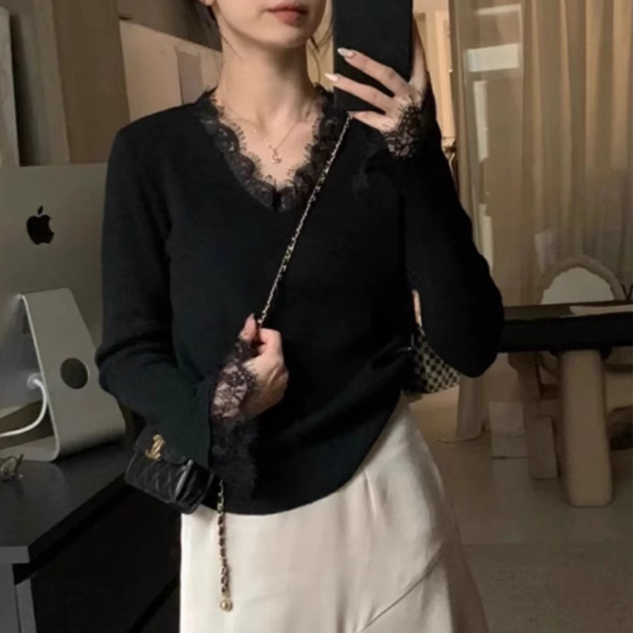 女装2024秋冬新款气质简约别致显瘦蕾丝拼接V领针织衫打底上衣女