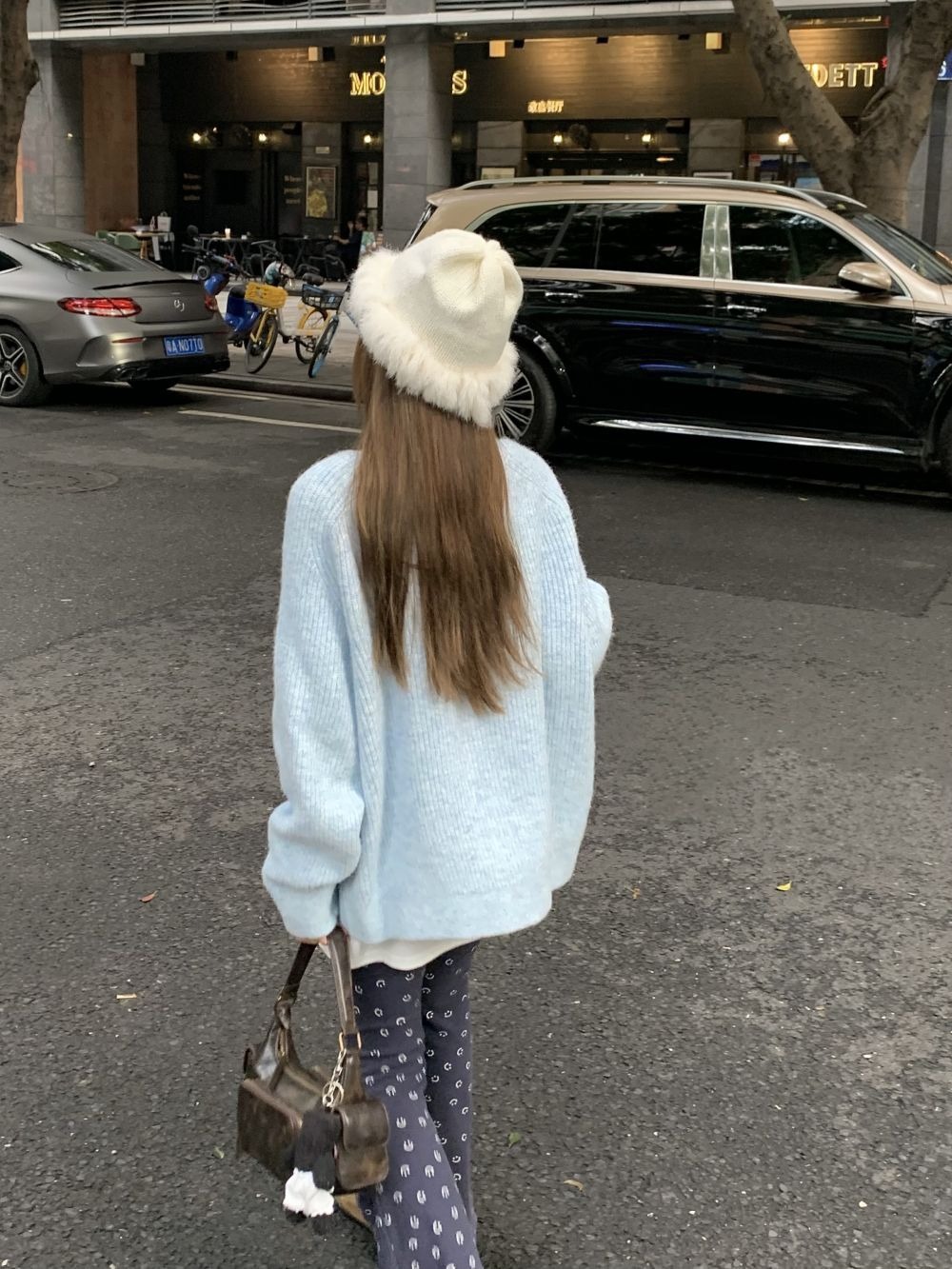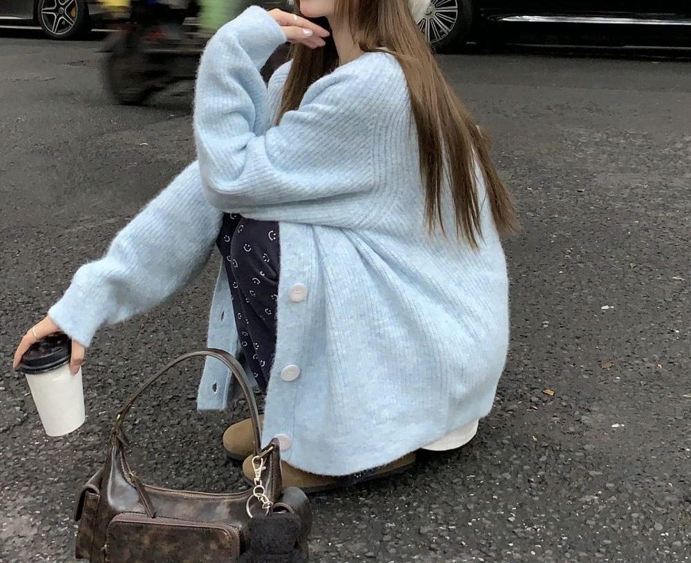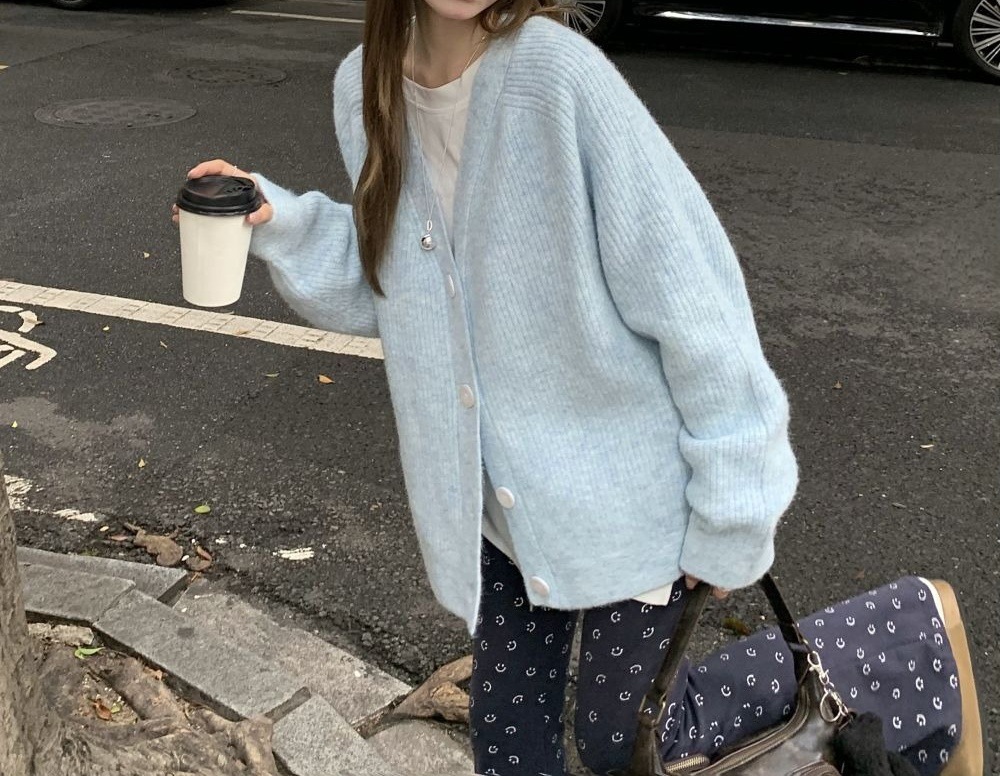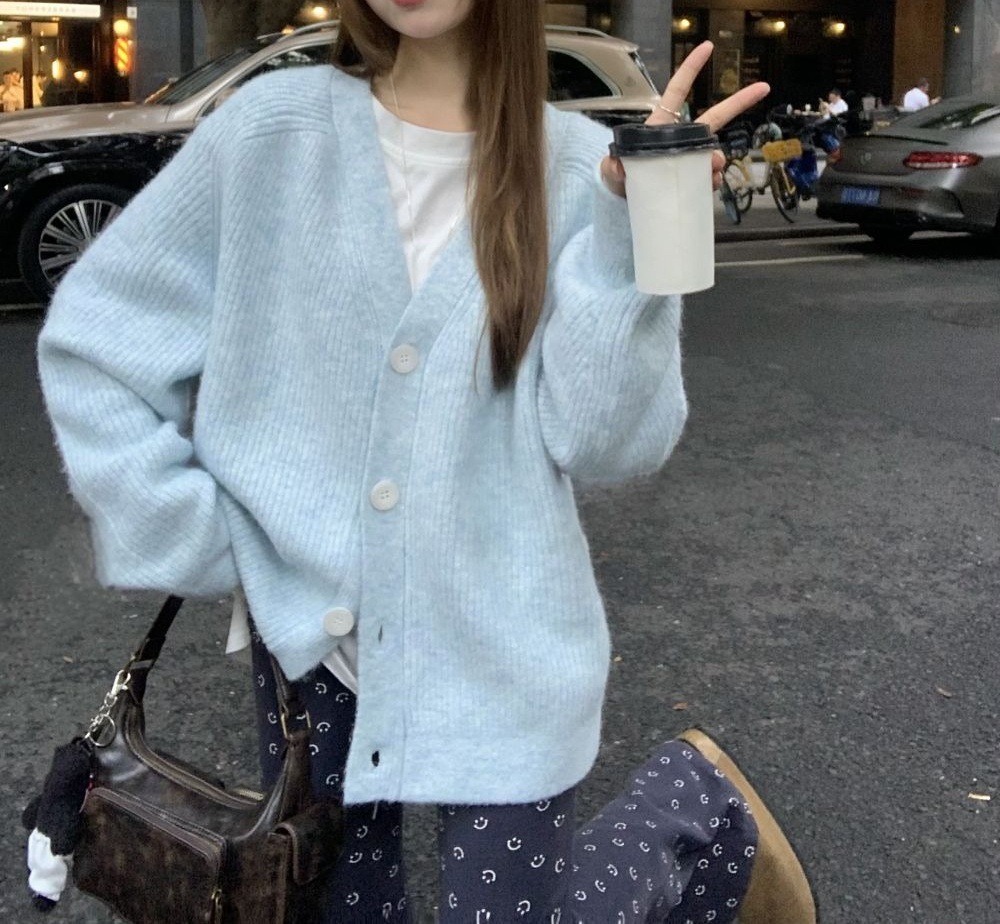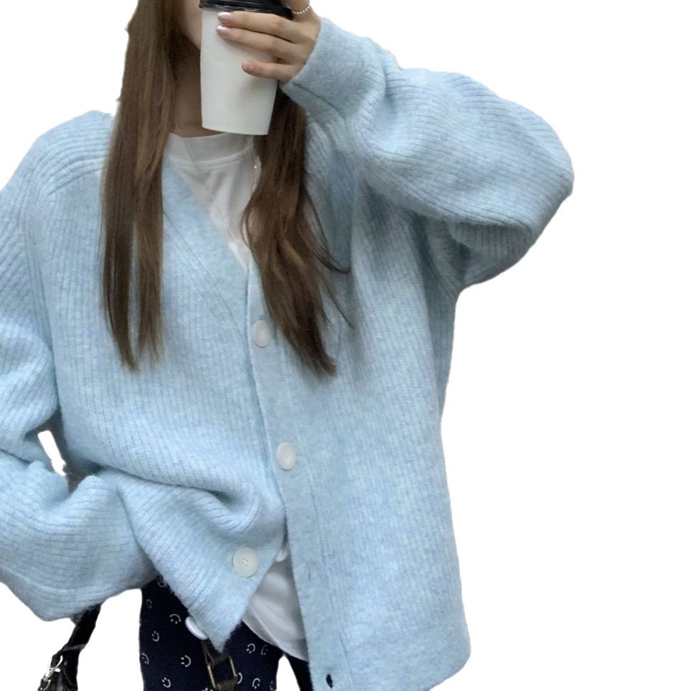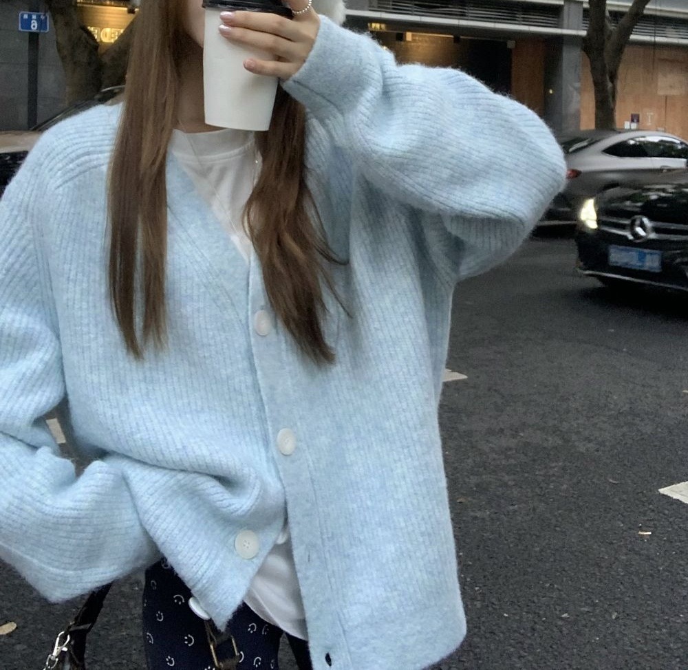 软糯软奶蓝色v领毛衣开衫女2024秋冬外套温柔慵懒风宽松针织外套