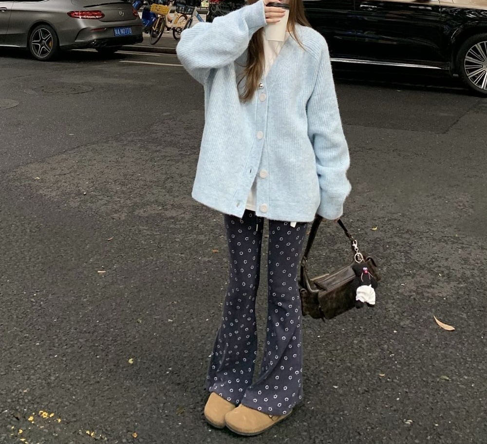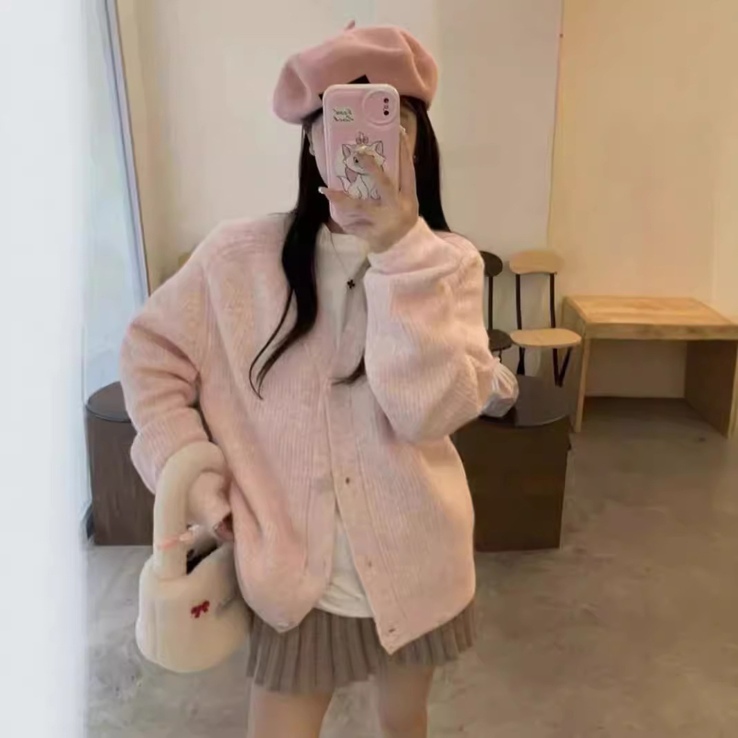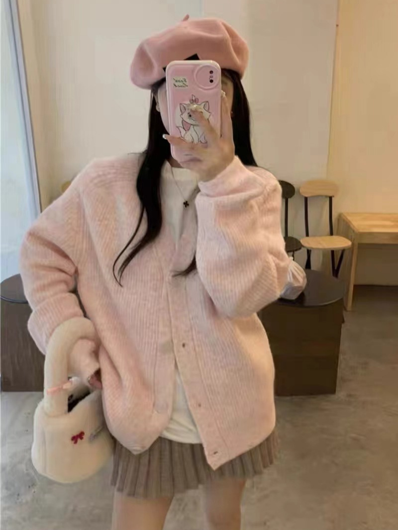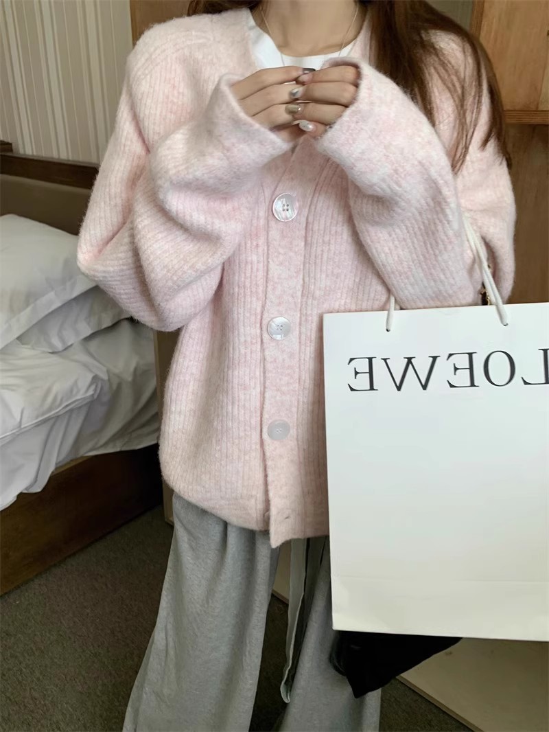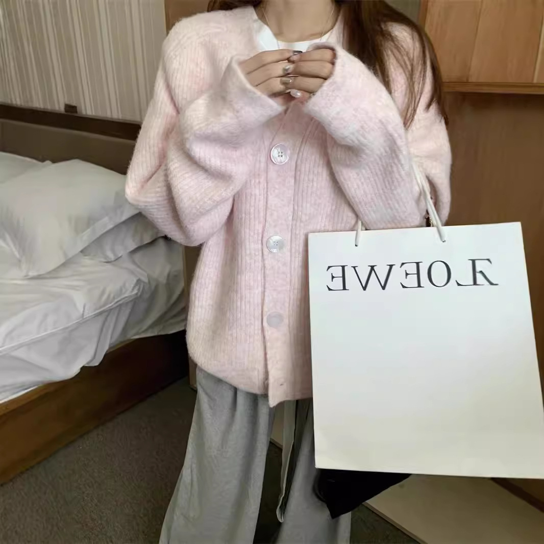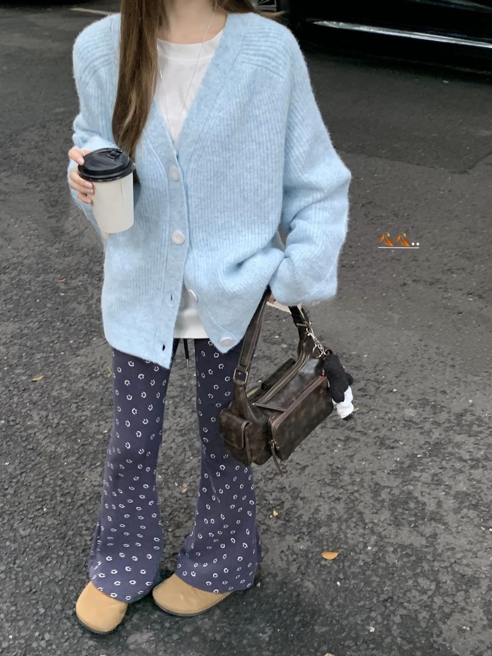 软糯软奶蓝色v领毛衣开衫女2024秋冬外套温柔慵懒风宽松针织外套