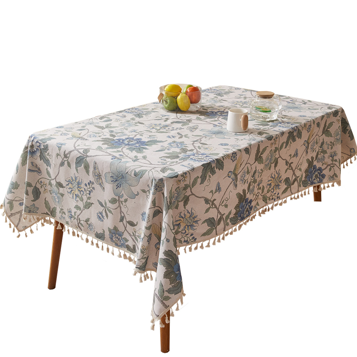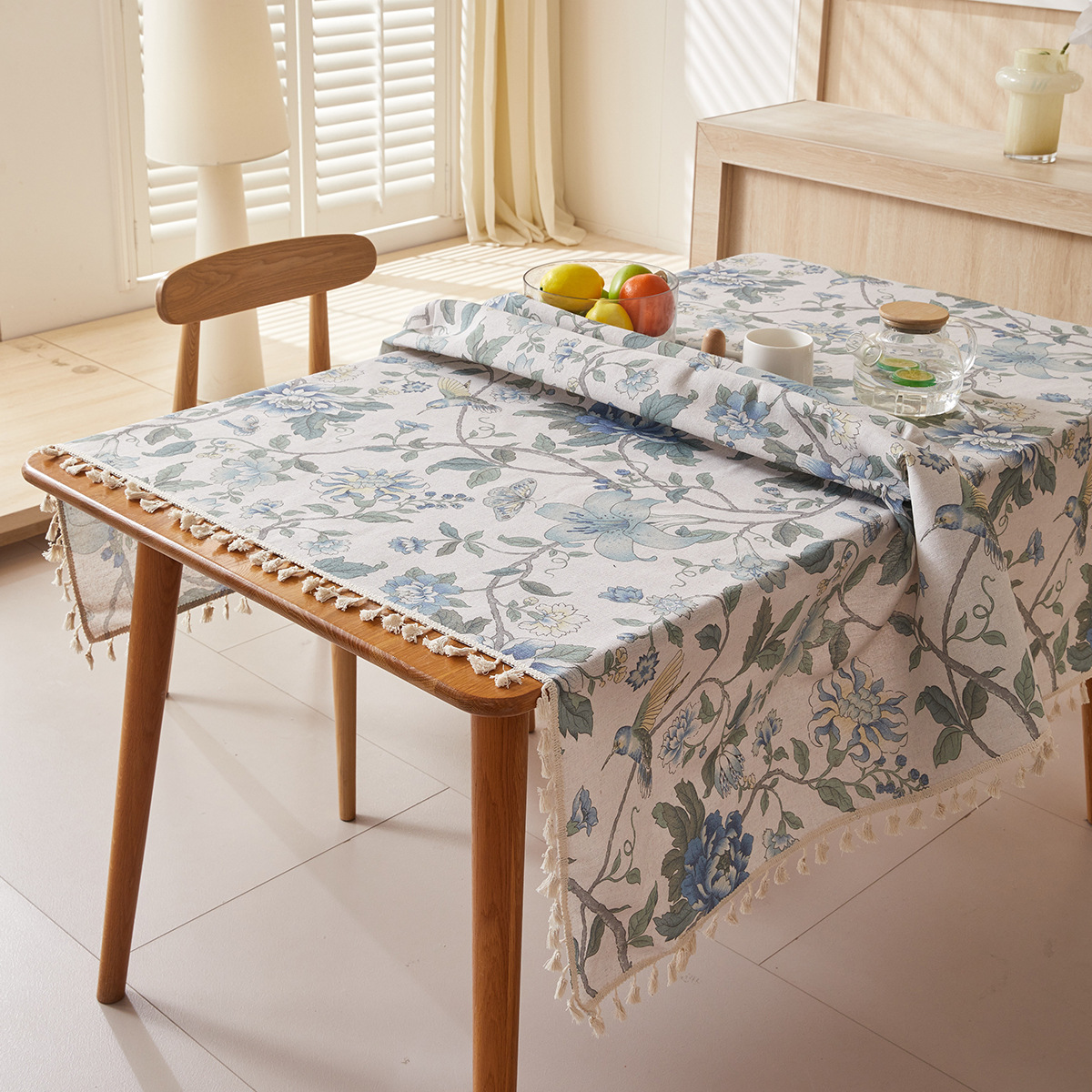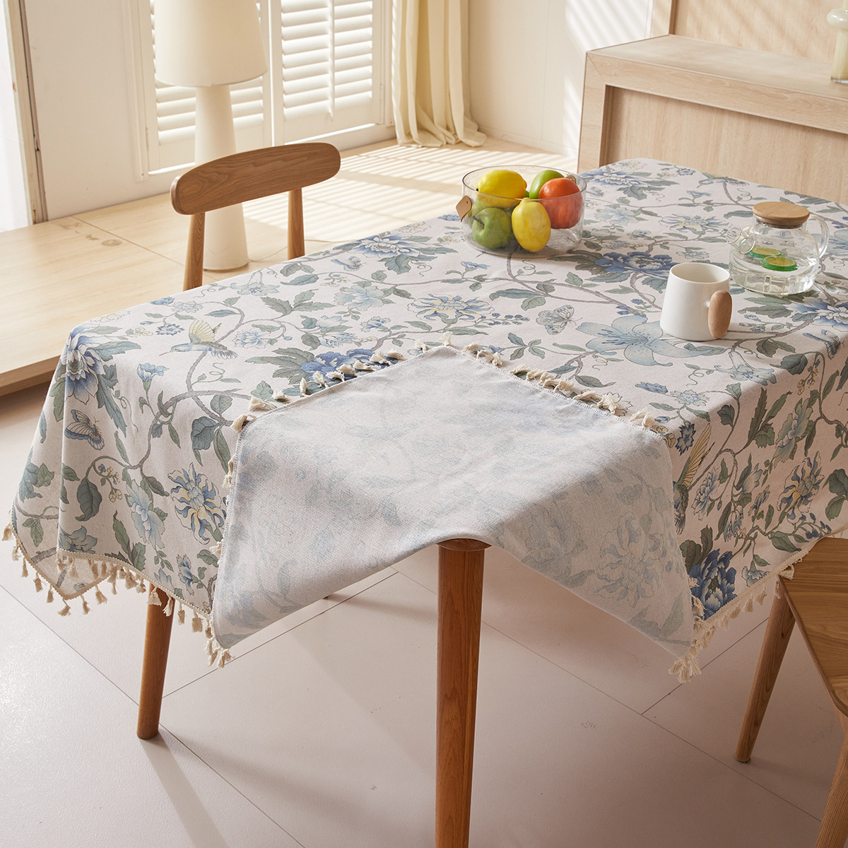 桌布小清新田园风印花款蓝色花朵餐桌布餐厅厨房防尘布艺流苏台布