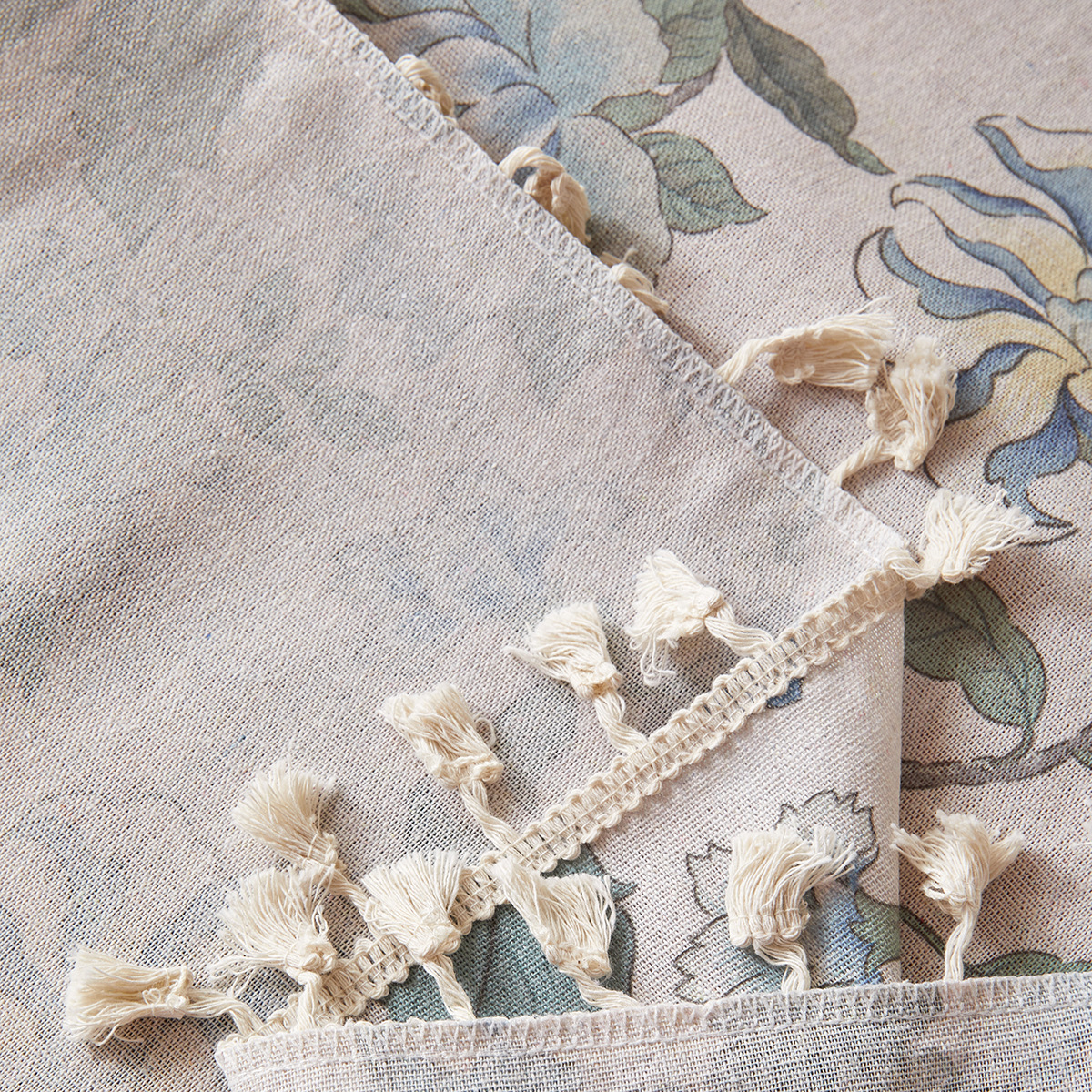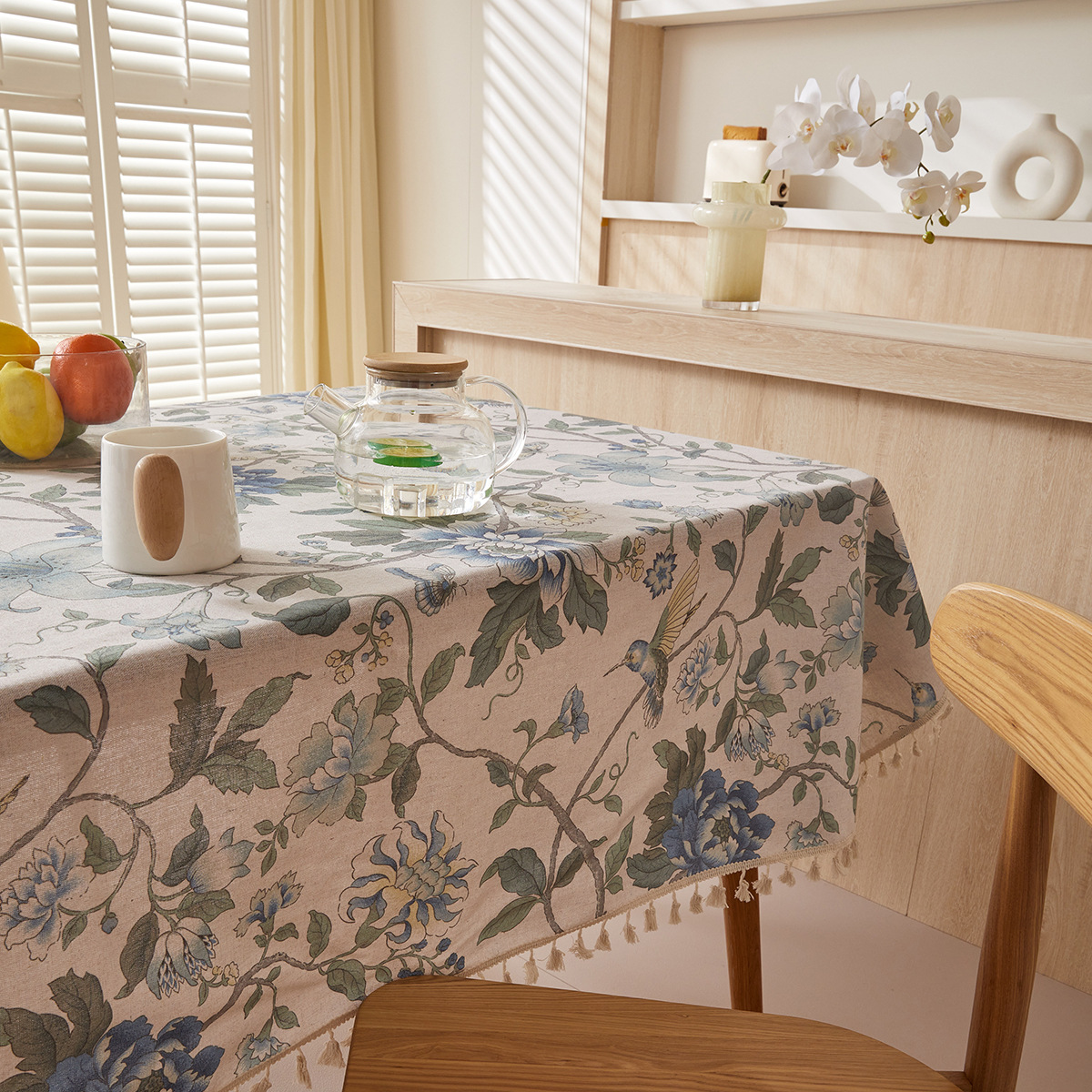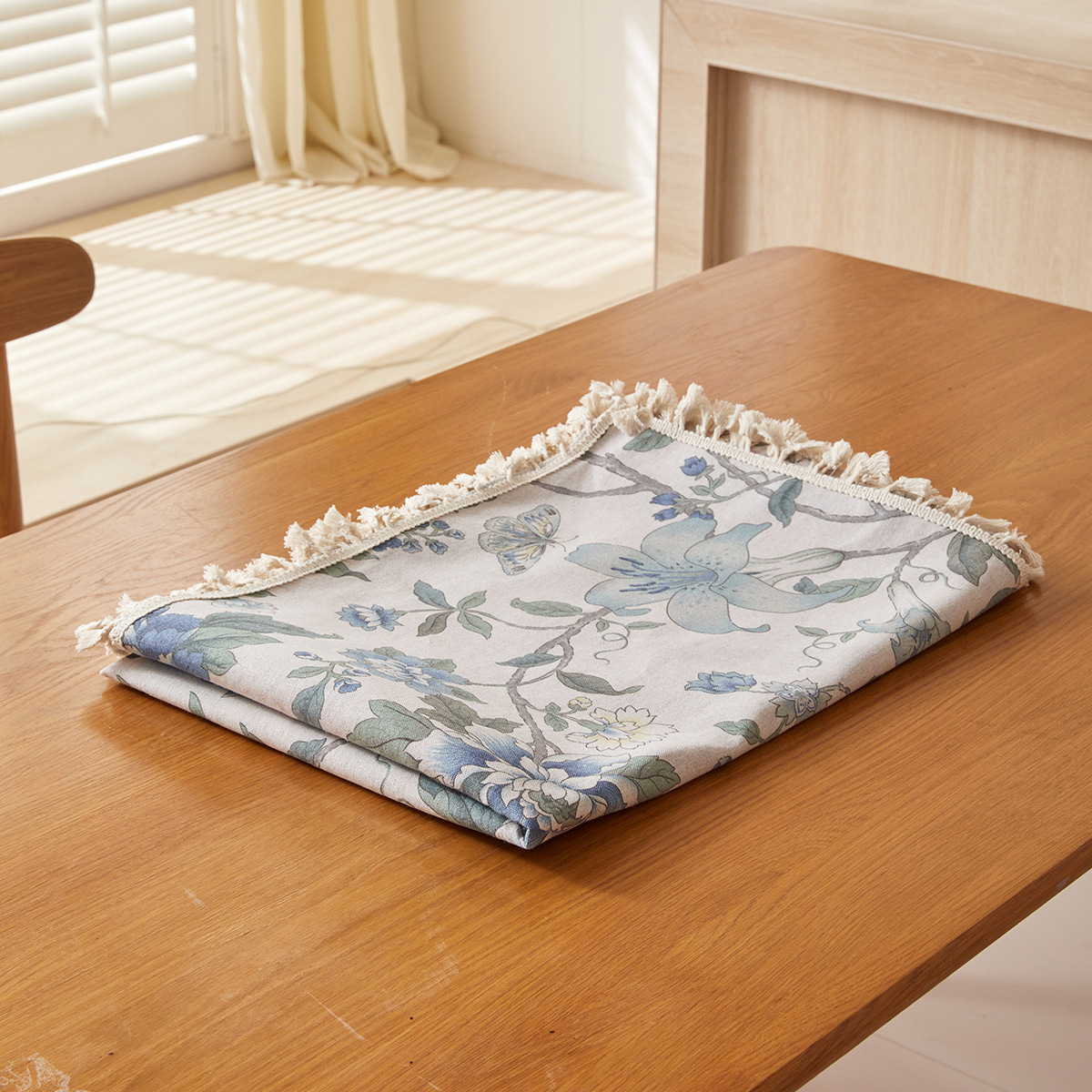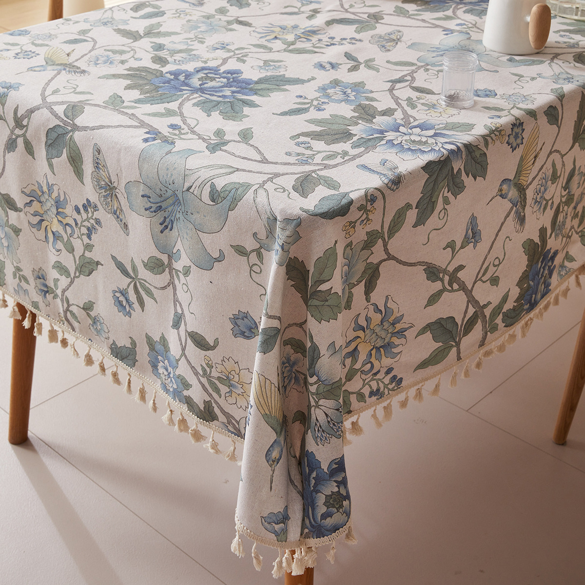 桌布小清新田园风印花款蓝色花朵餐桌布餐厅厨房防尘布艺流苏台布
