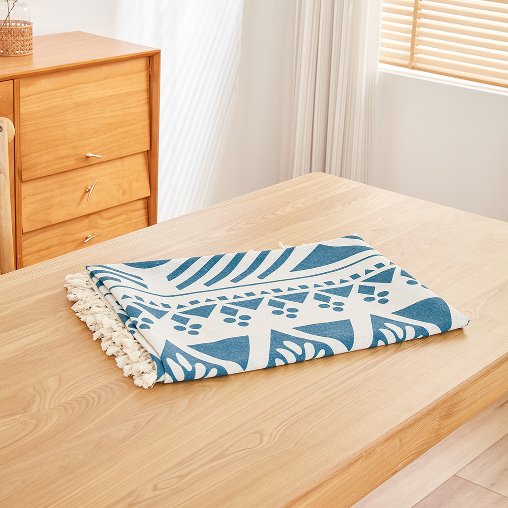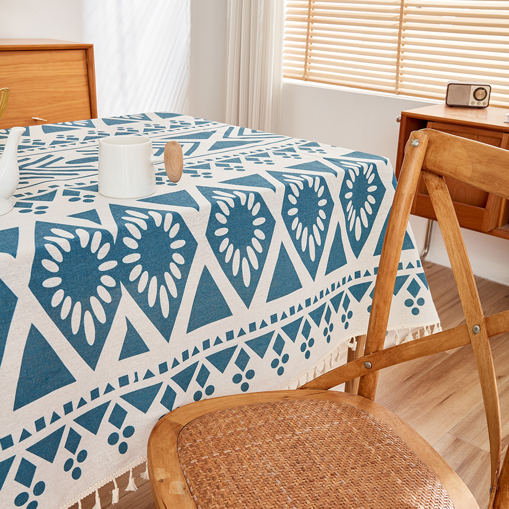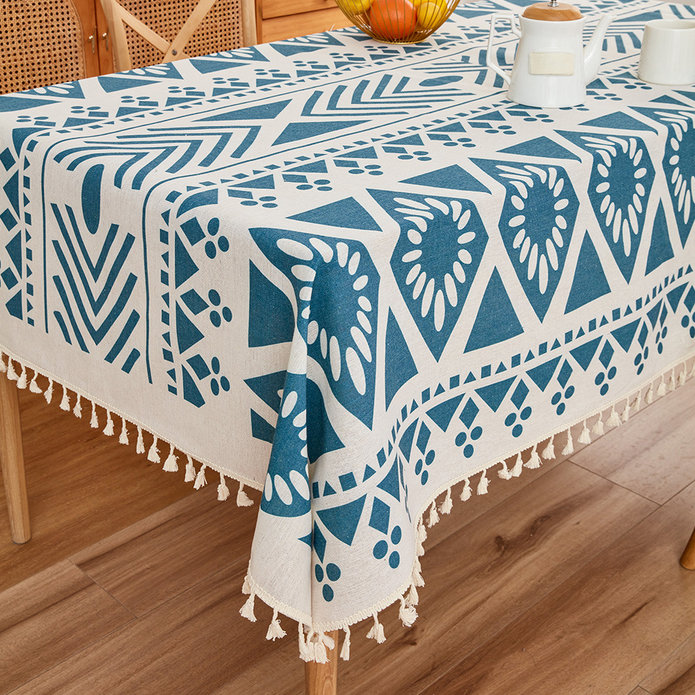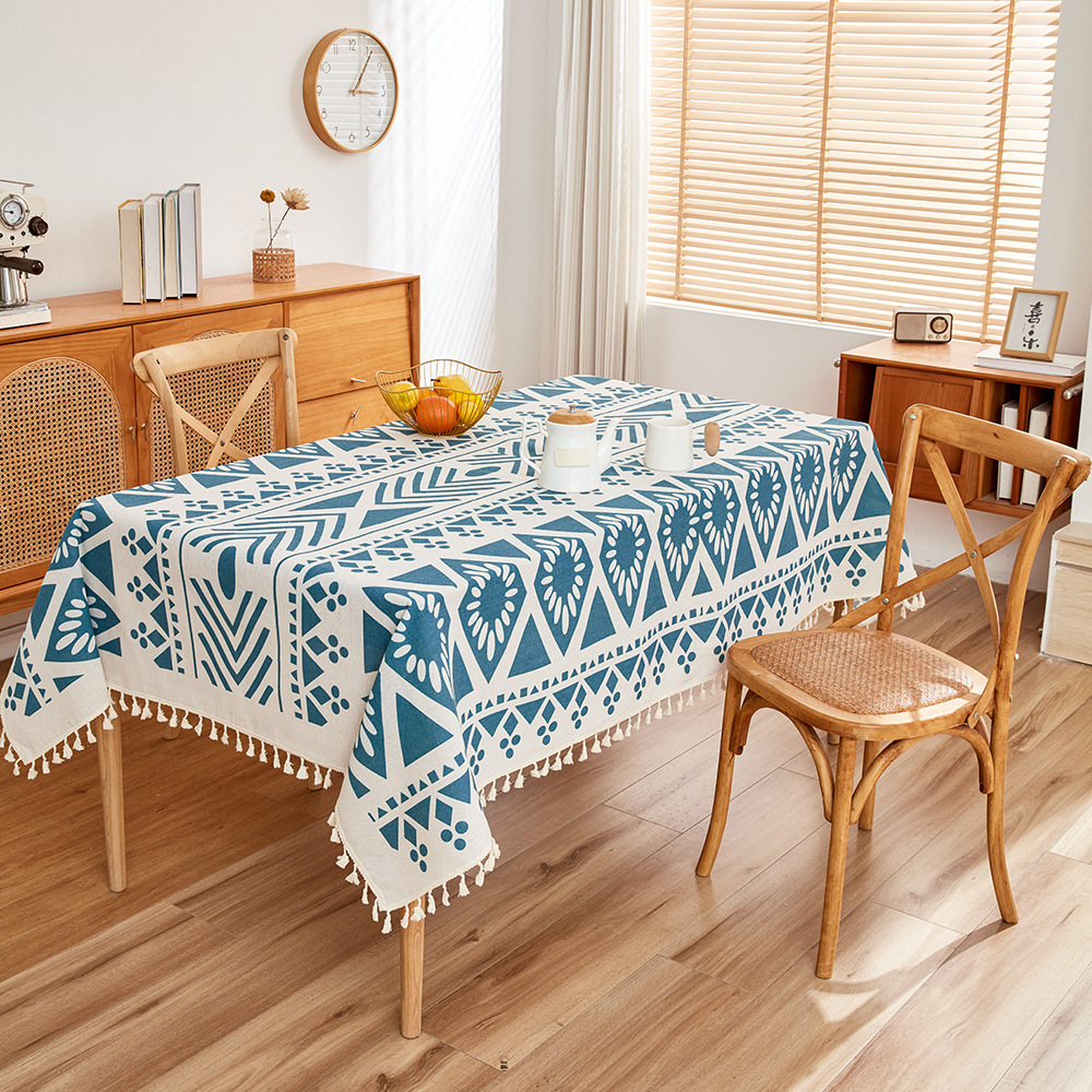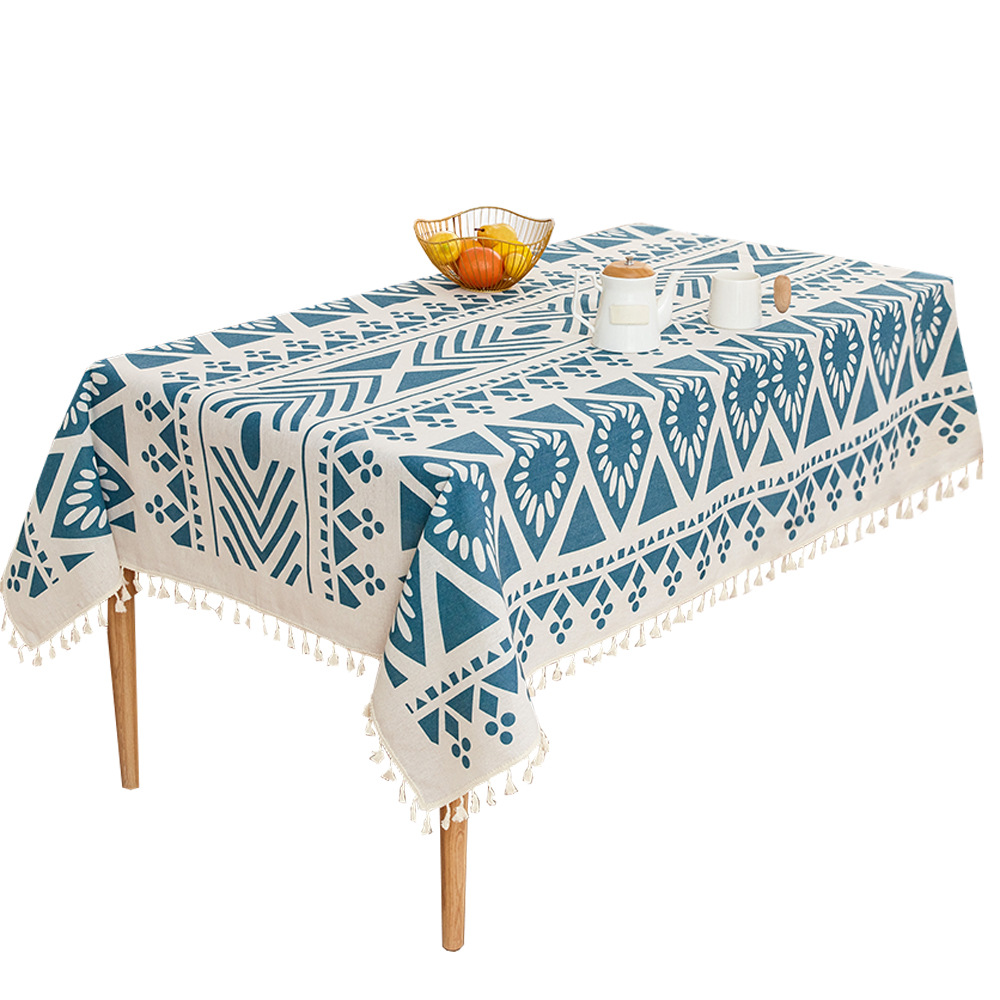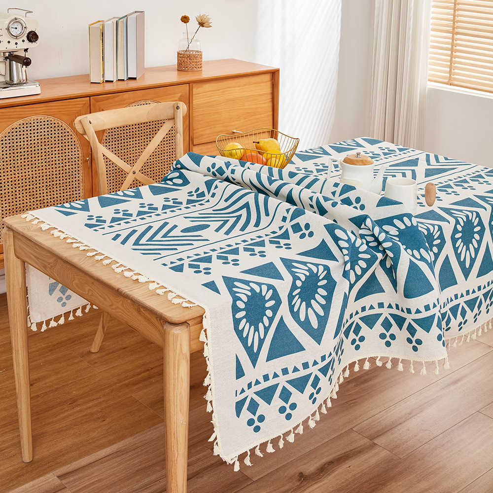 波西米亚风桌布小清新蓝绿色几何图案印花长方形餐桌垫布流苏台布
