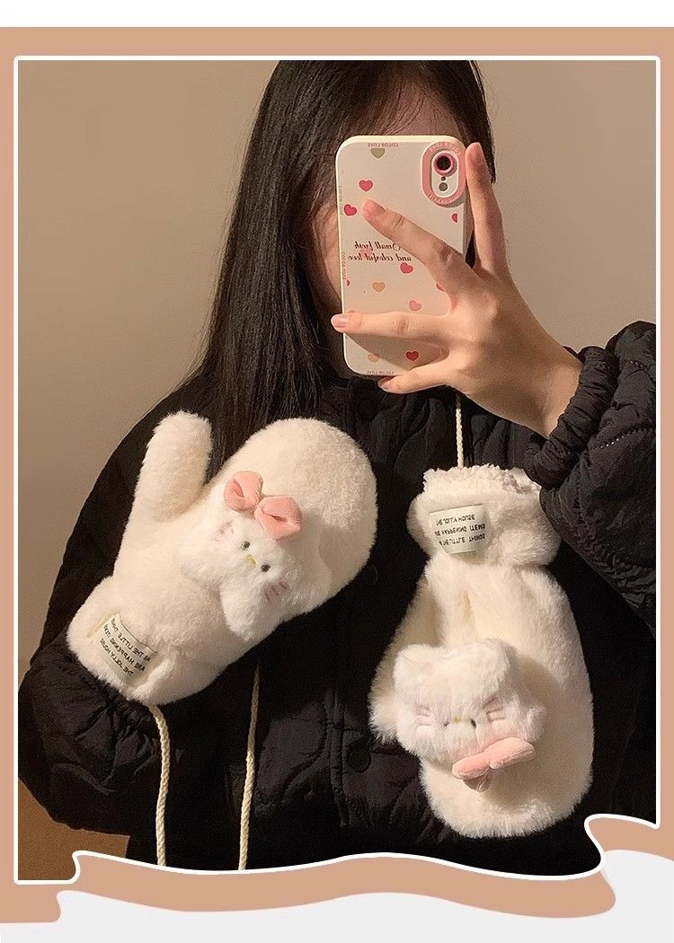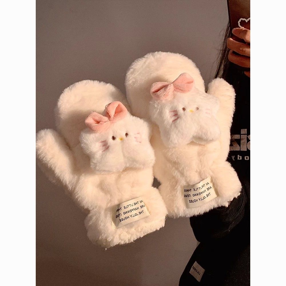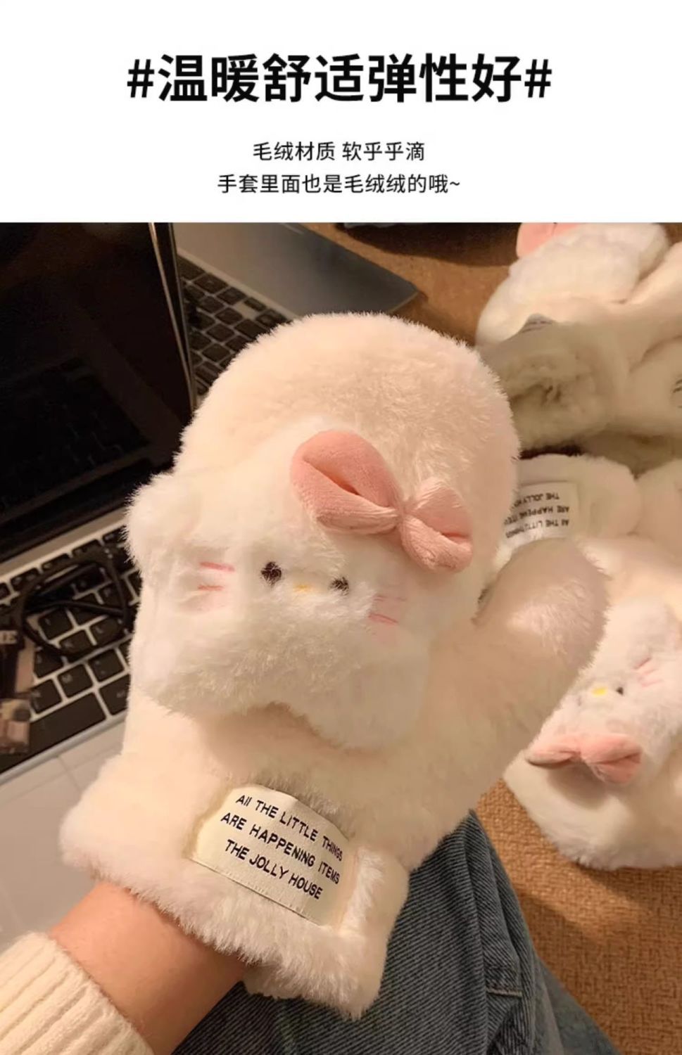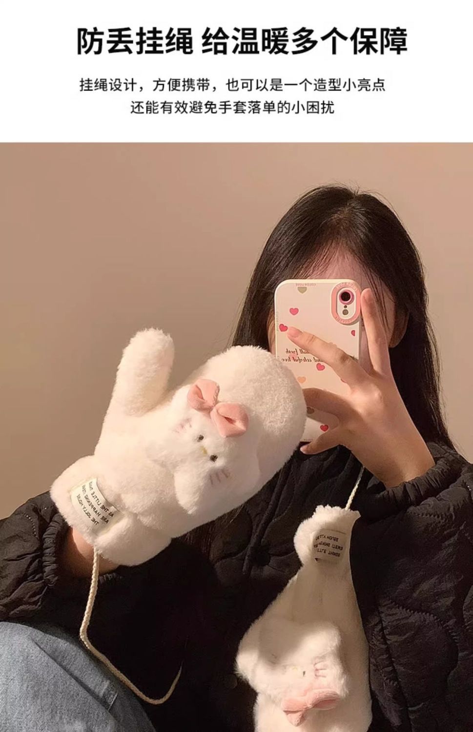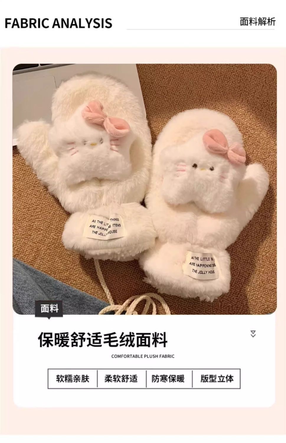 可爱五角星猫咪毛绒手套女冬季保暖挂脖加厚学生全包连指防寒骑车