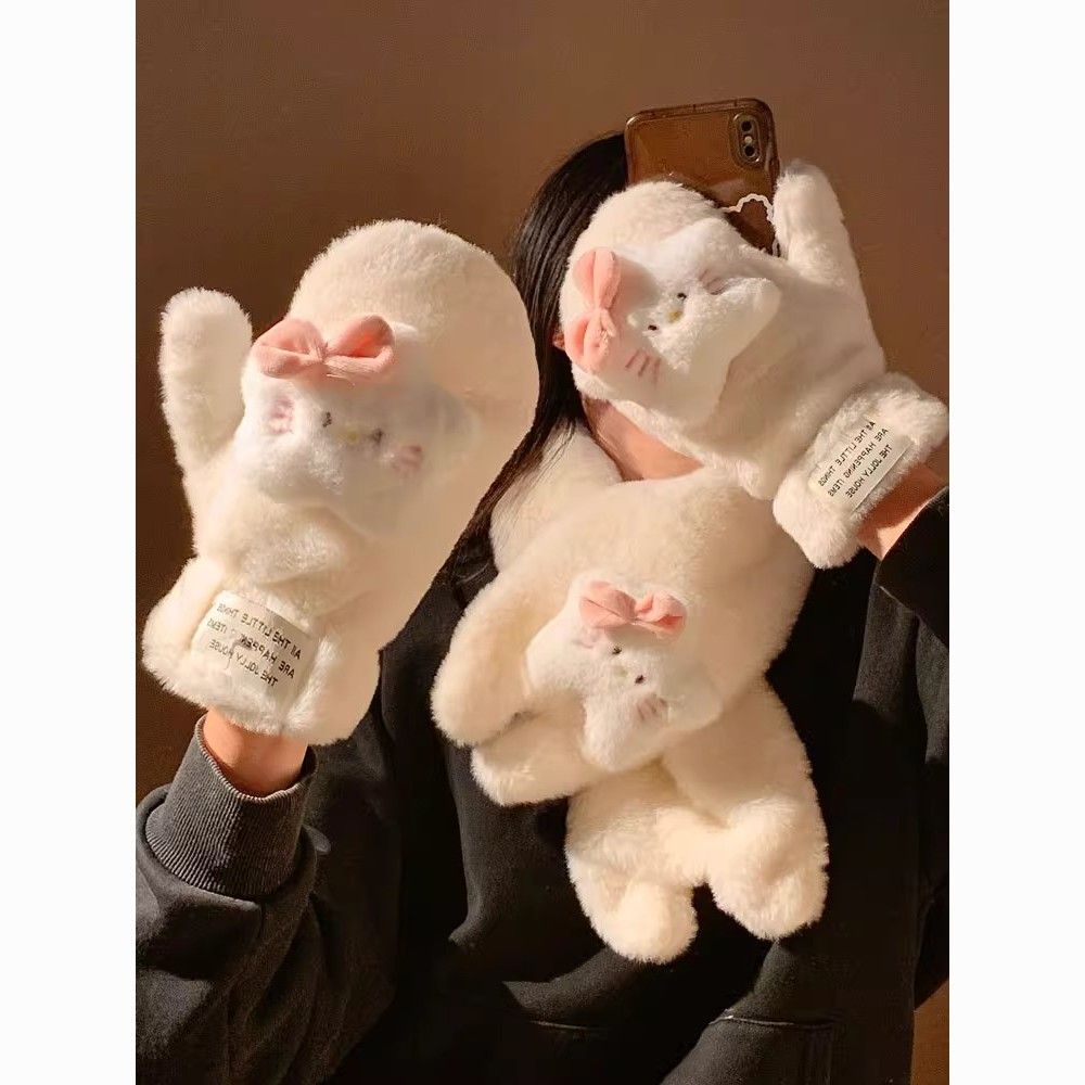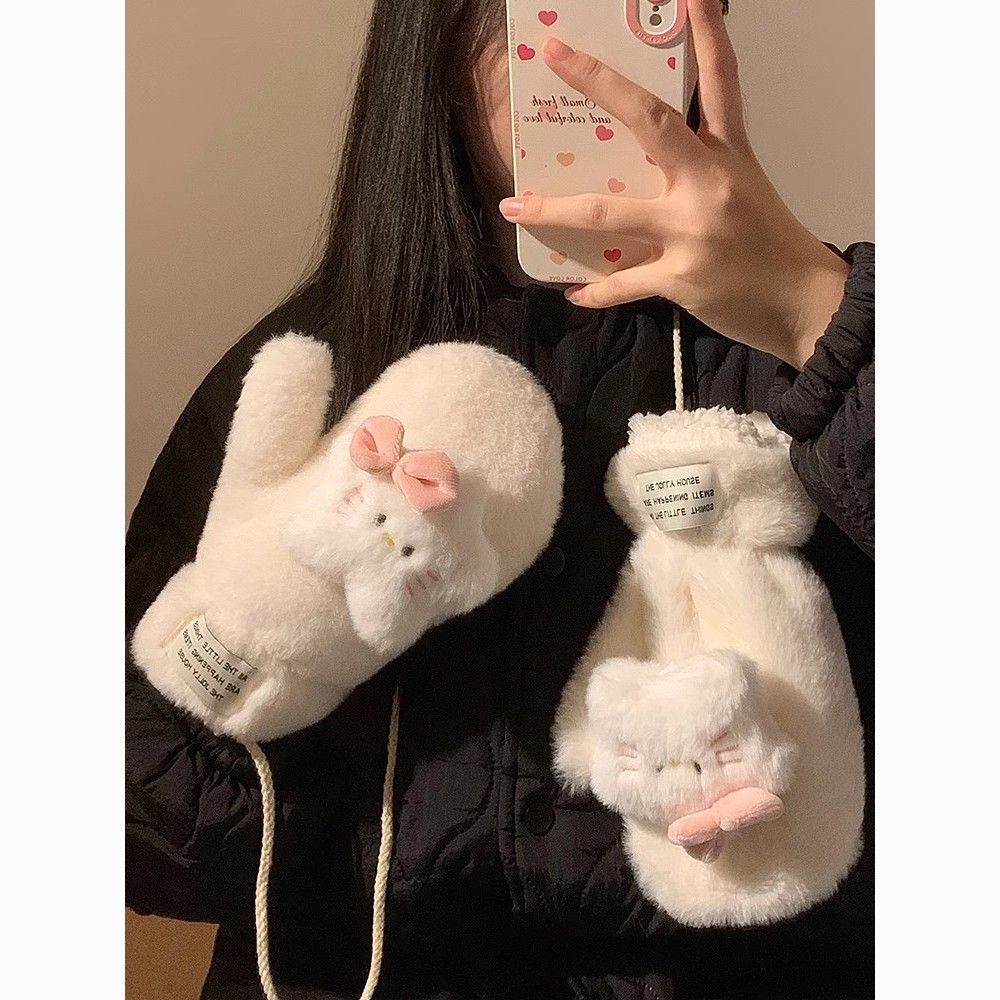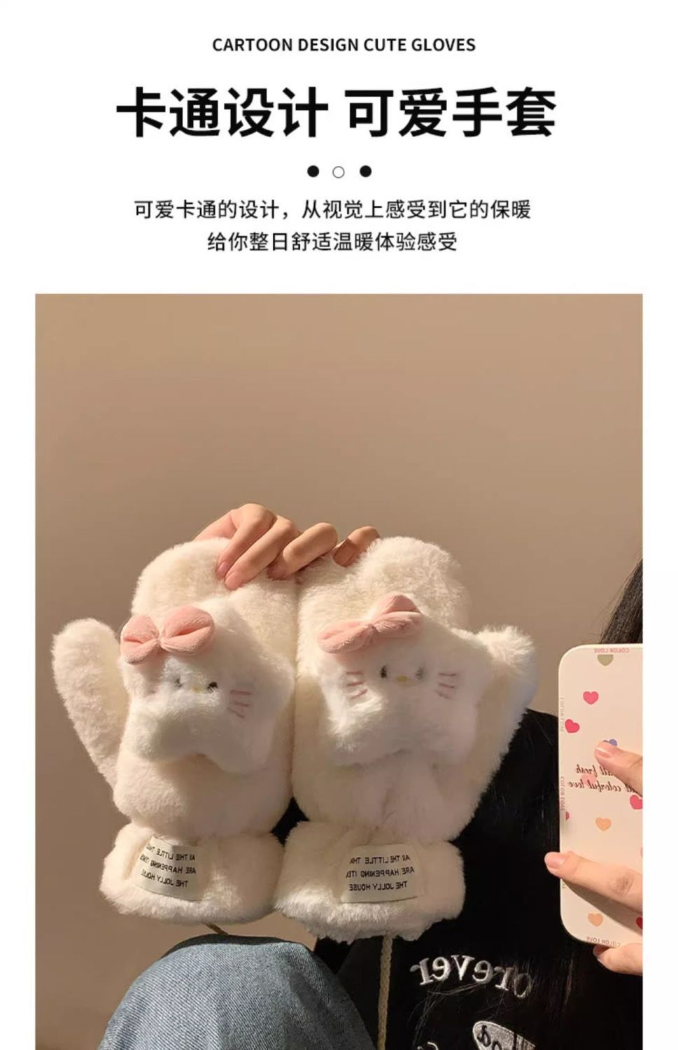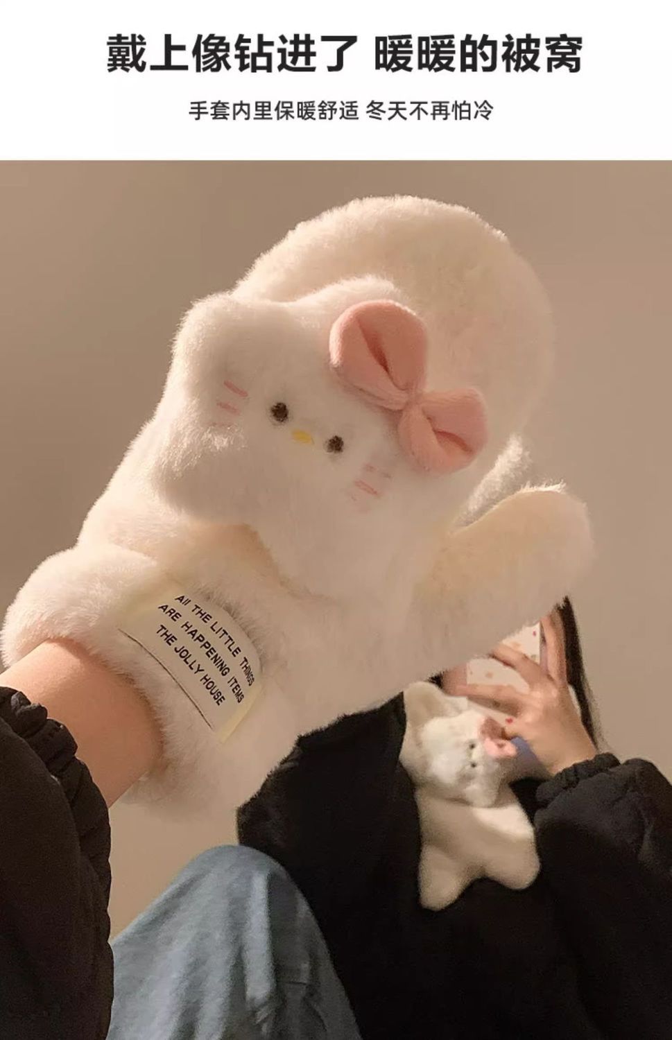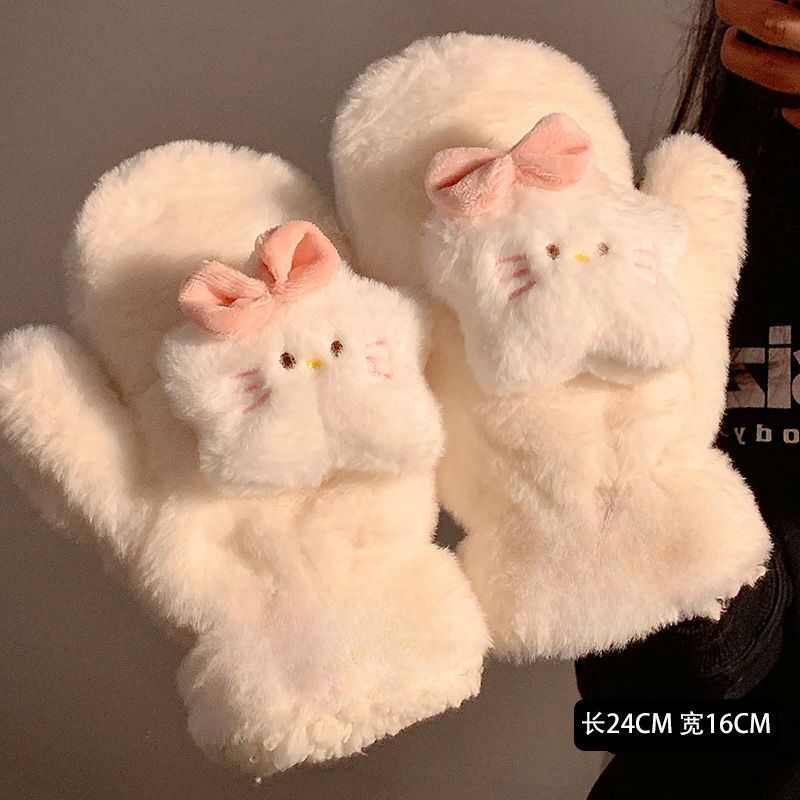 可爱五角星猫咪毛绒手套女冬季保暖挂脖加厚学生全包连指防寒骑车