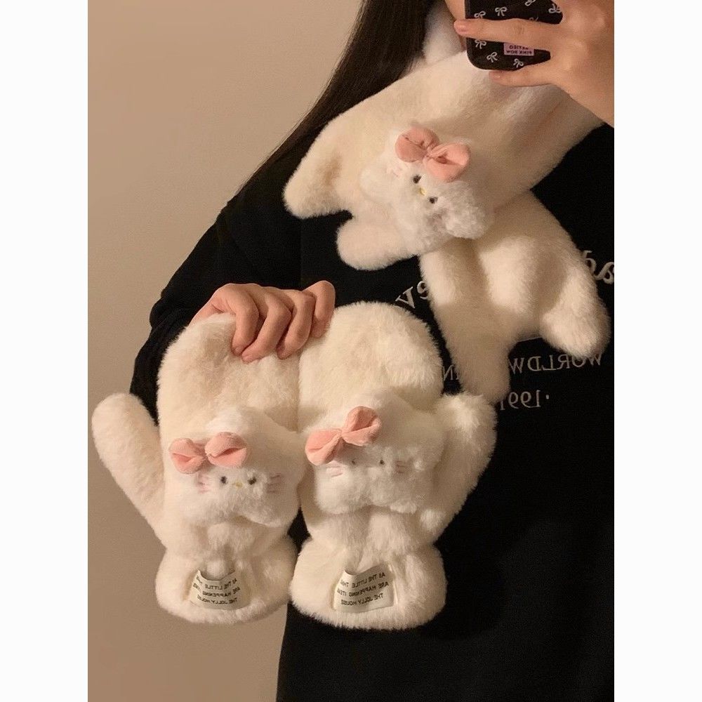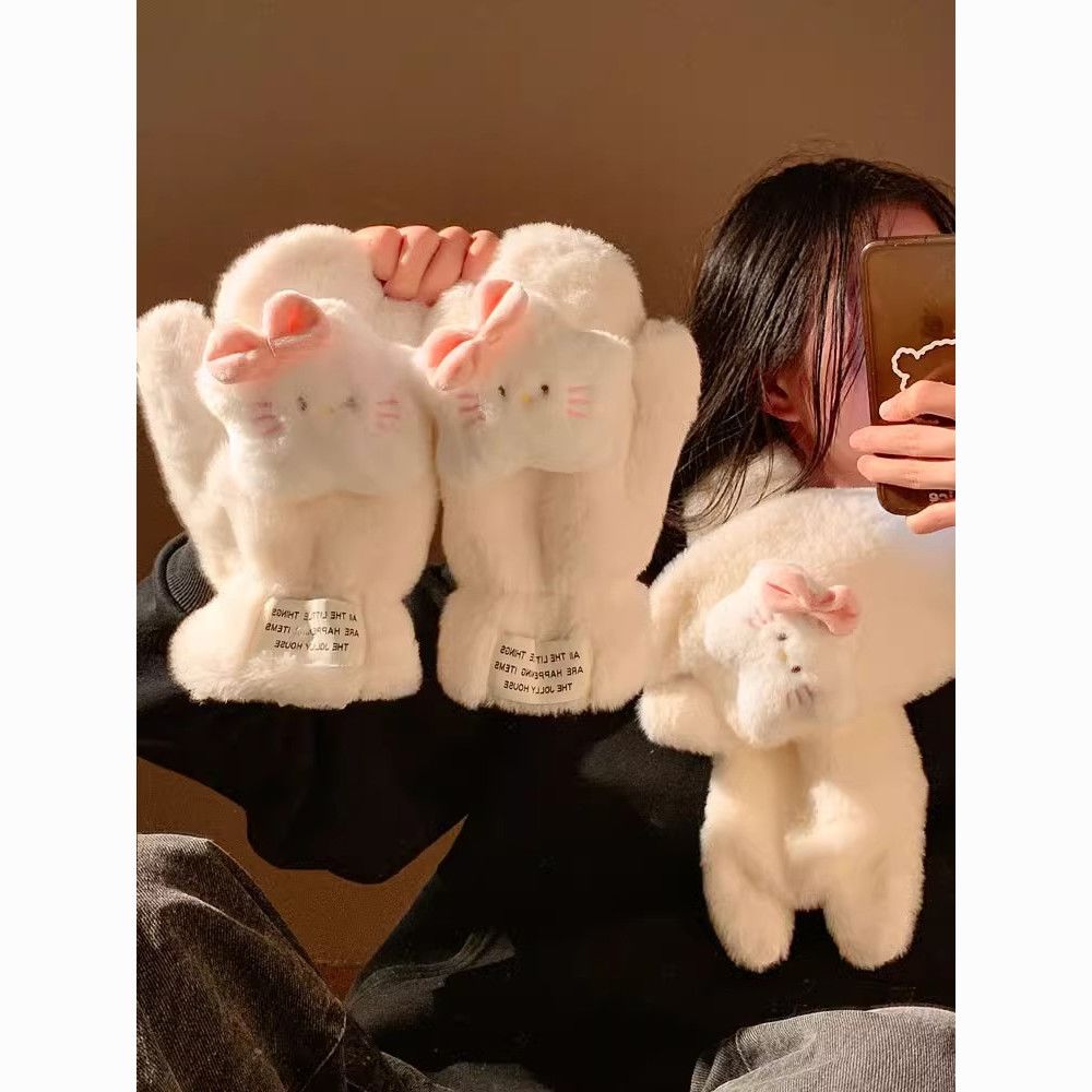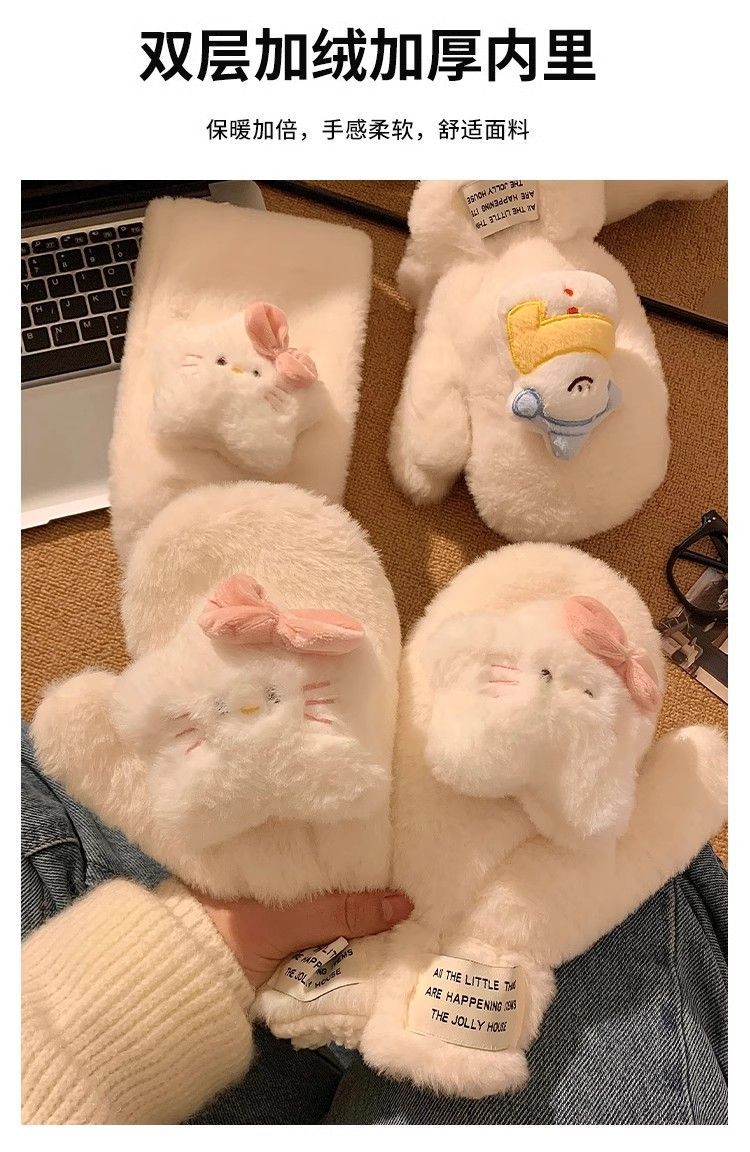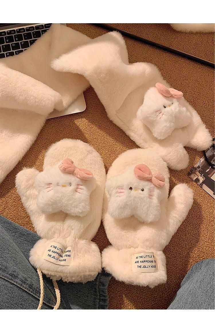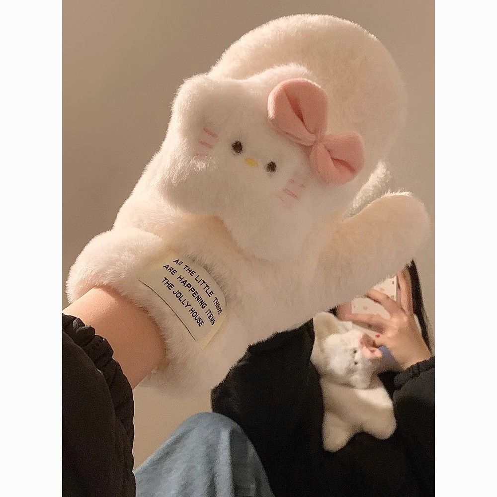 可爱五角星猫咪毛绒手套女冬季保暖挂脖加厚学生全包连指防寒骑车