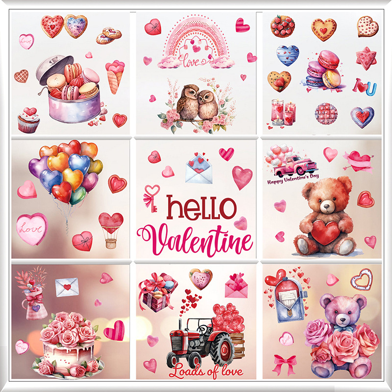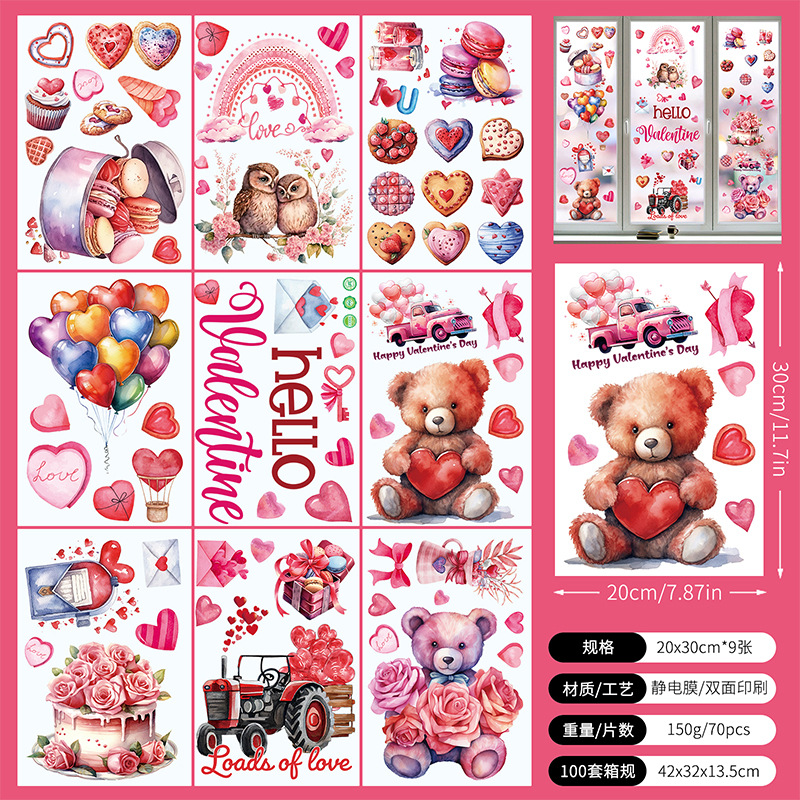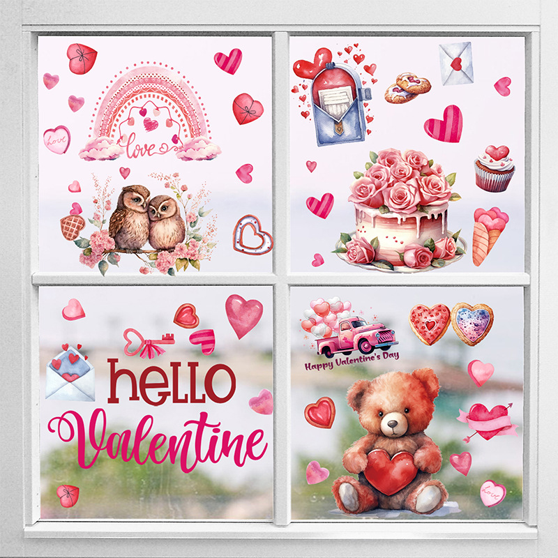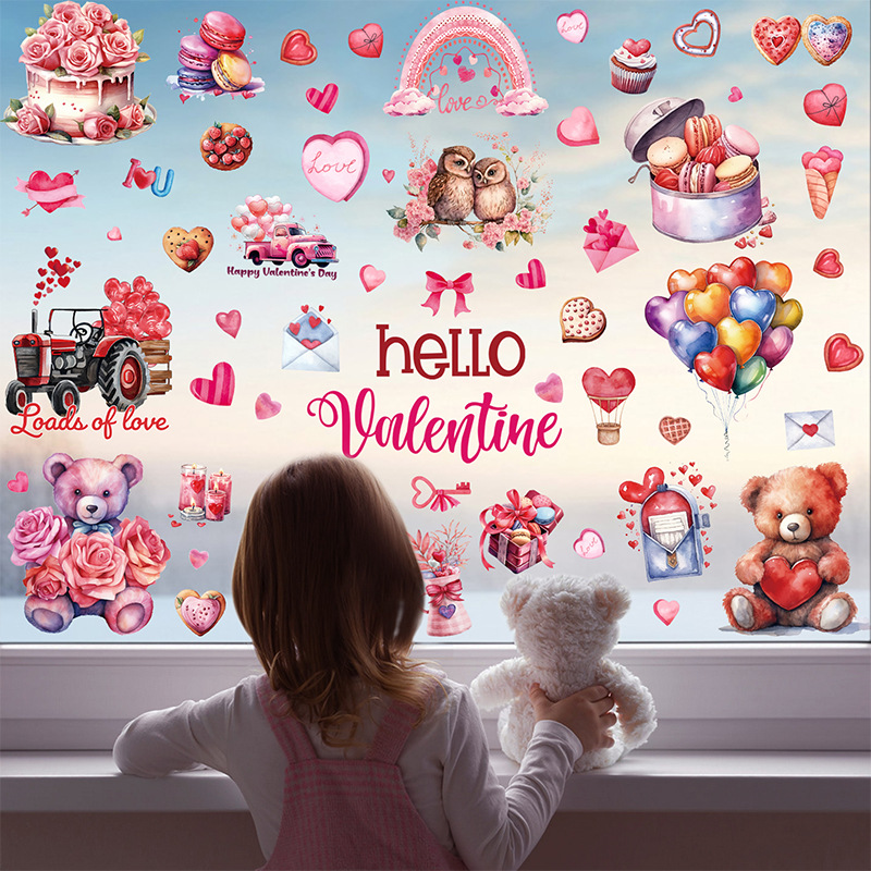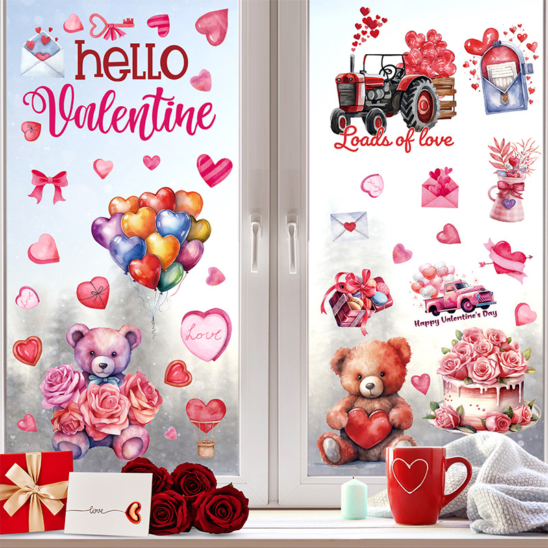 2025跨境情人节静电窗贴卡通小熊爱心橱窗玻璃贴画pvc门窗美化贴