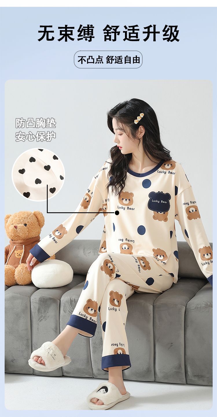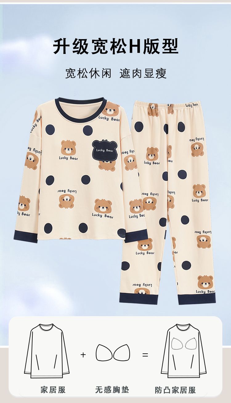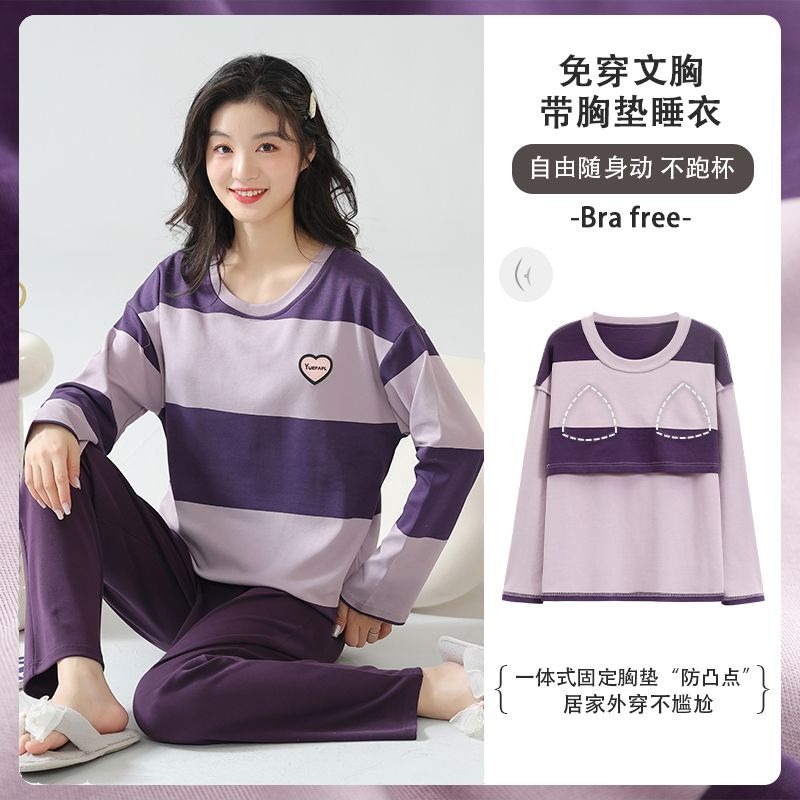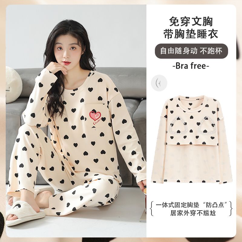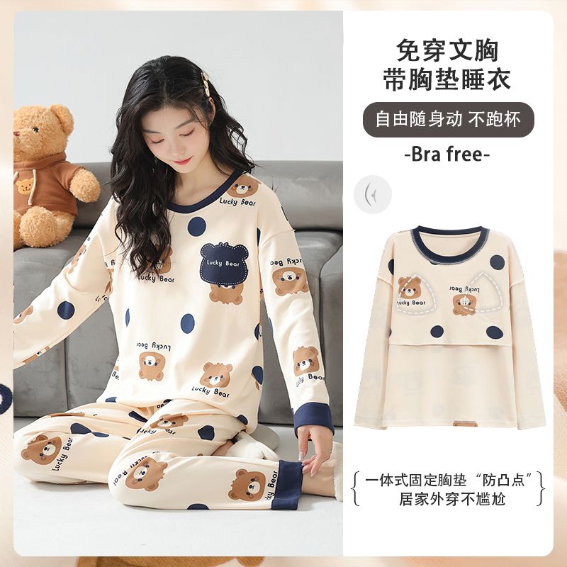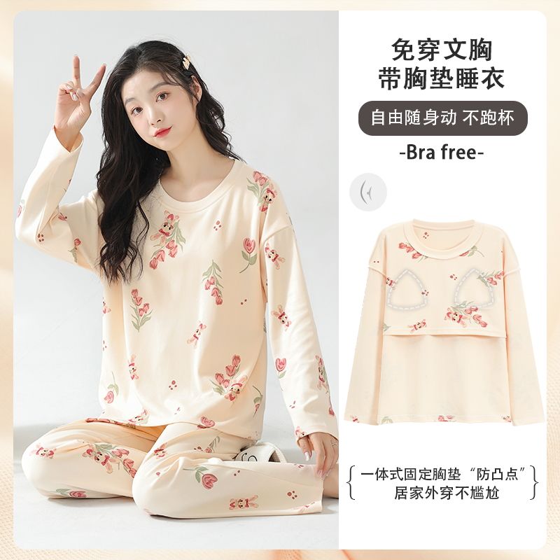 100%纯棉带胸垫睡衣女秋季长袖新款学生ins全棉春秋天家居服套装