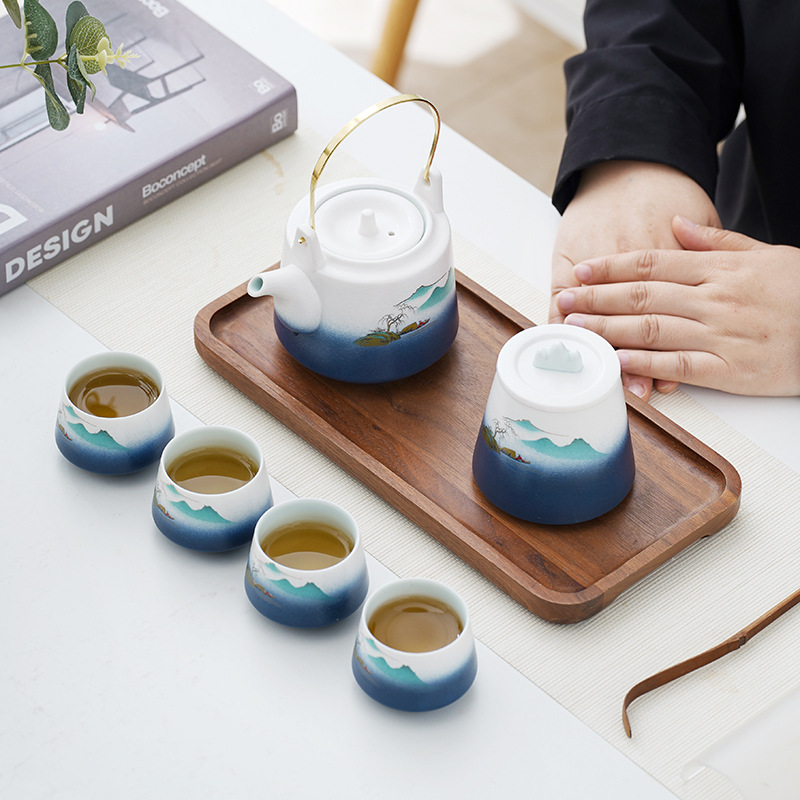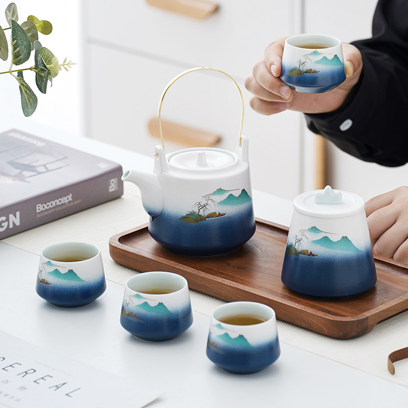 日式山水提梁壶功夫茶具套装一壶四杯带罐公司开业活动送礼品套装