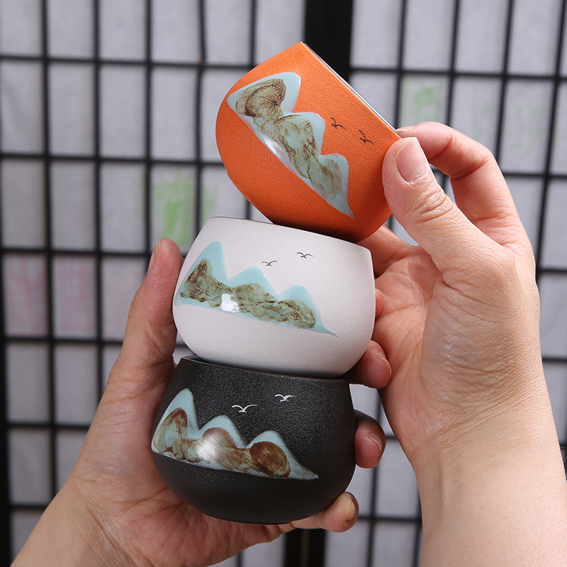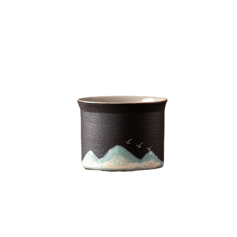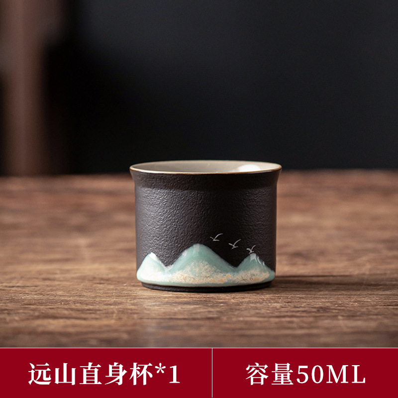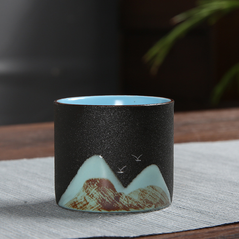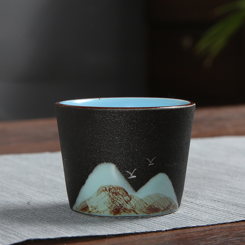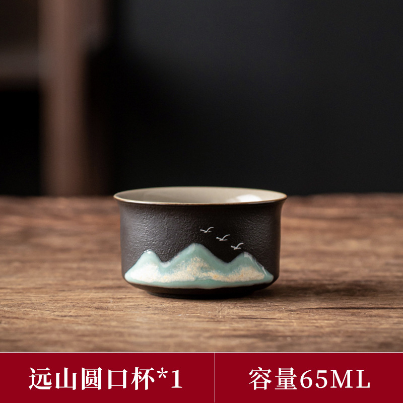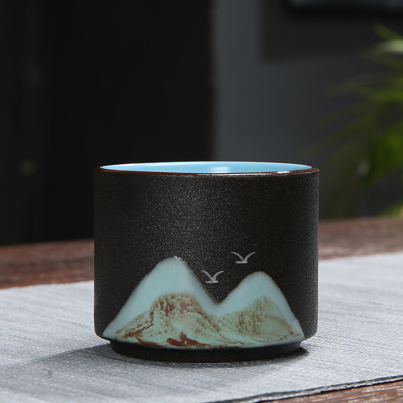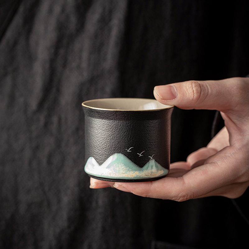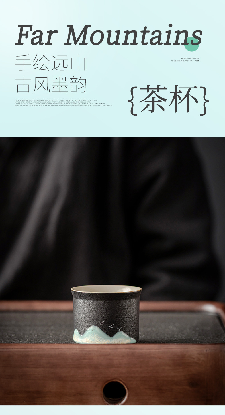 黑陶手绘远山茶杯禅意复古主人杯功夫茶具陶瓷品茗杯家用待客喝茶