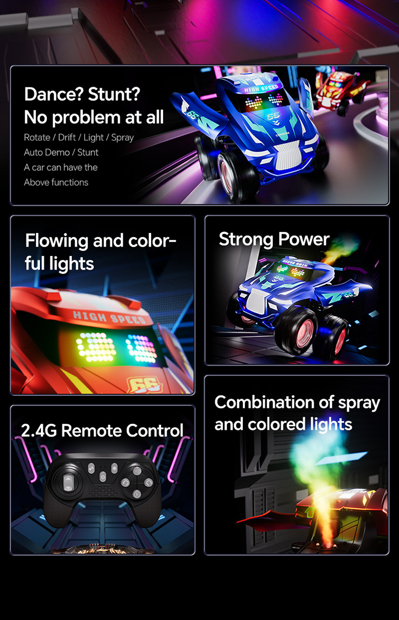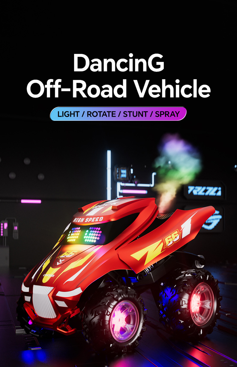 厂家跨境亚马逊儿童遥控车灯光音乐喷雾跳舞车漂移越野车玩具车
