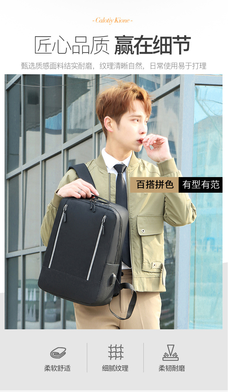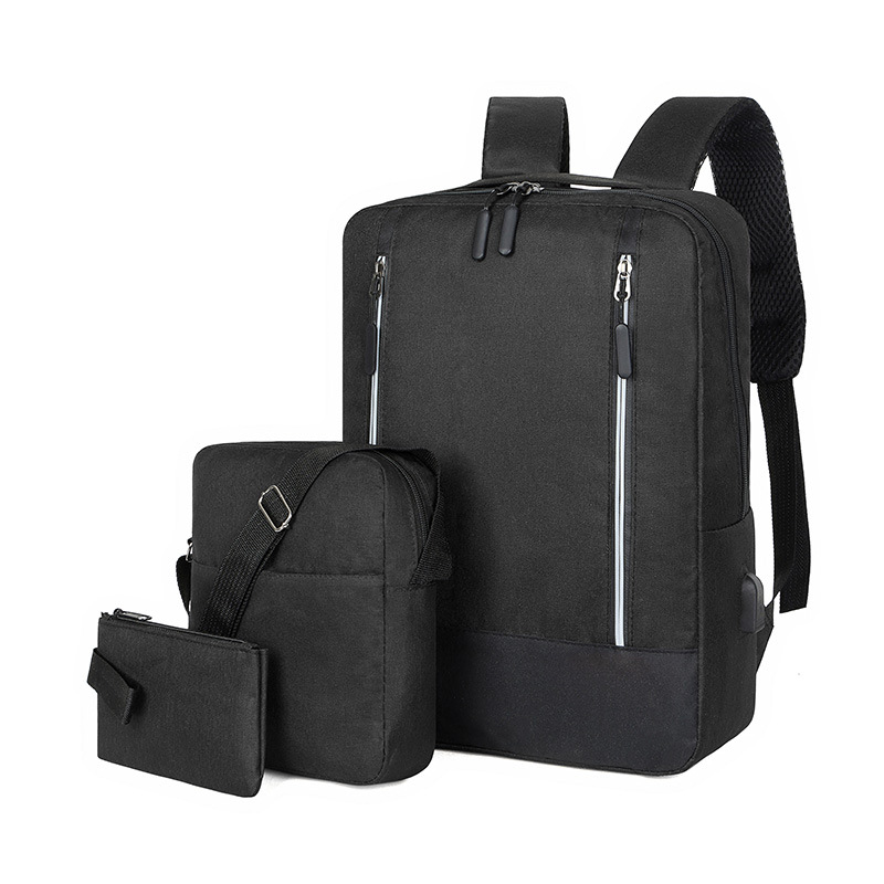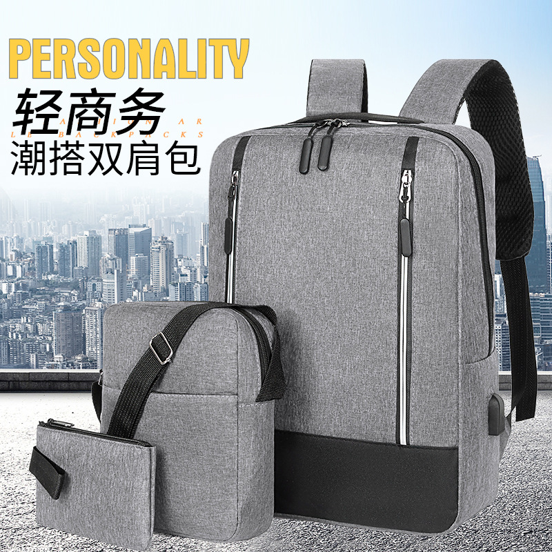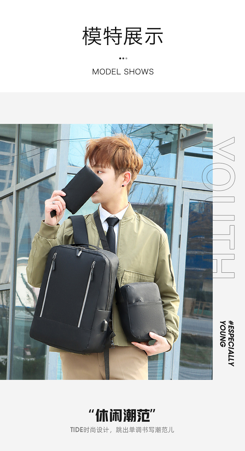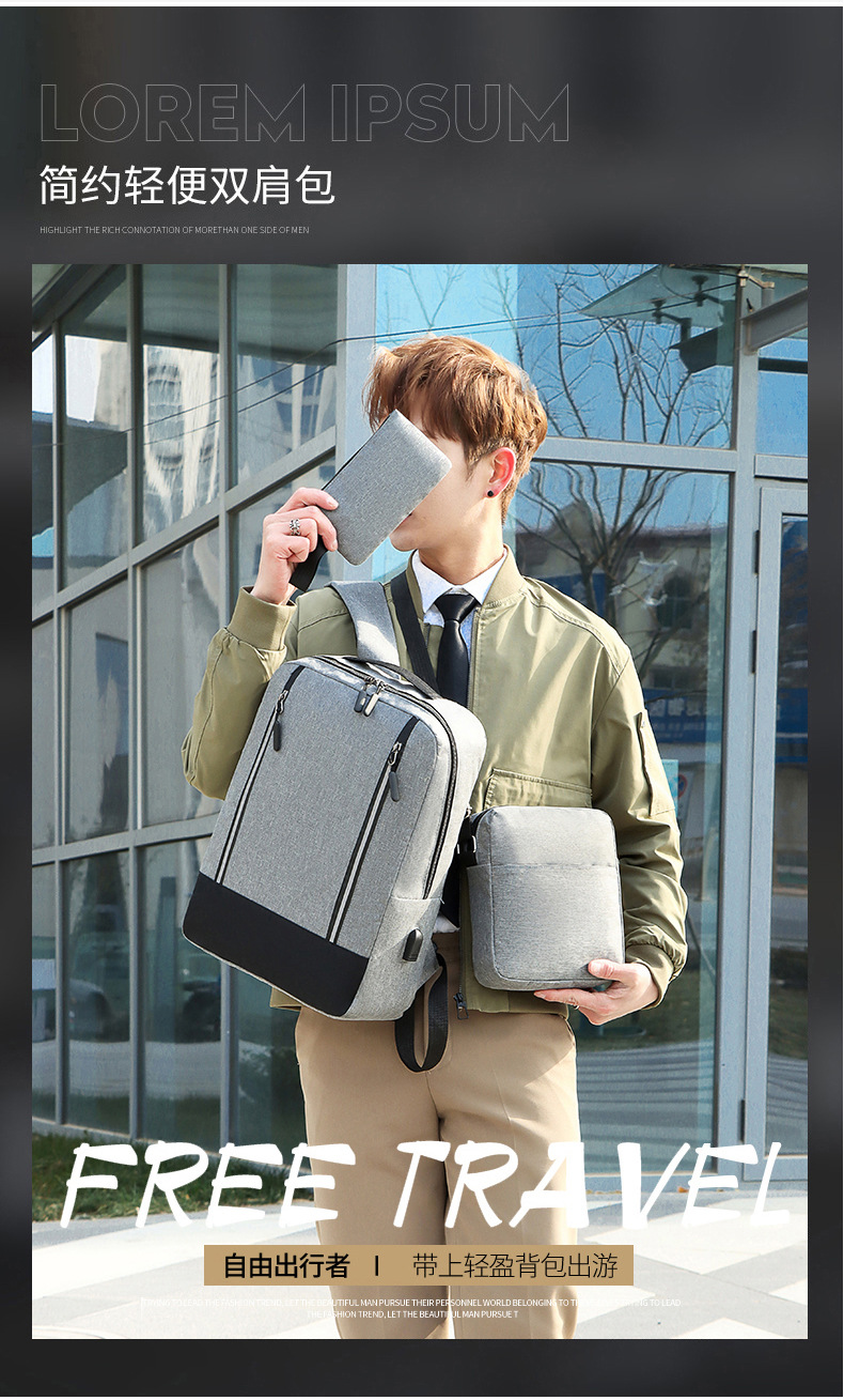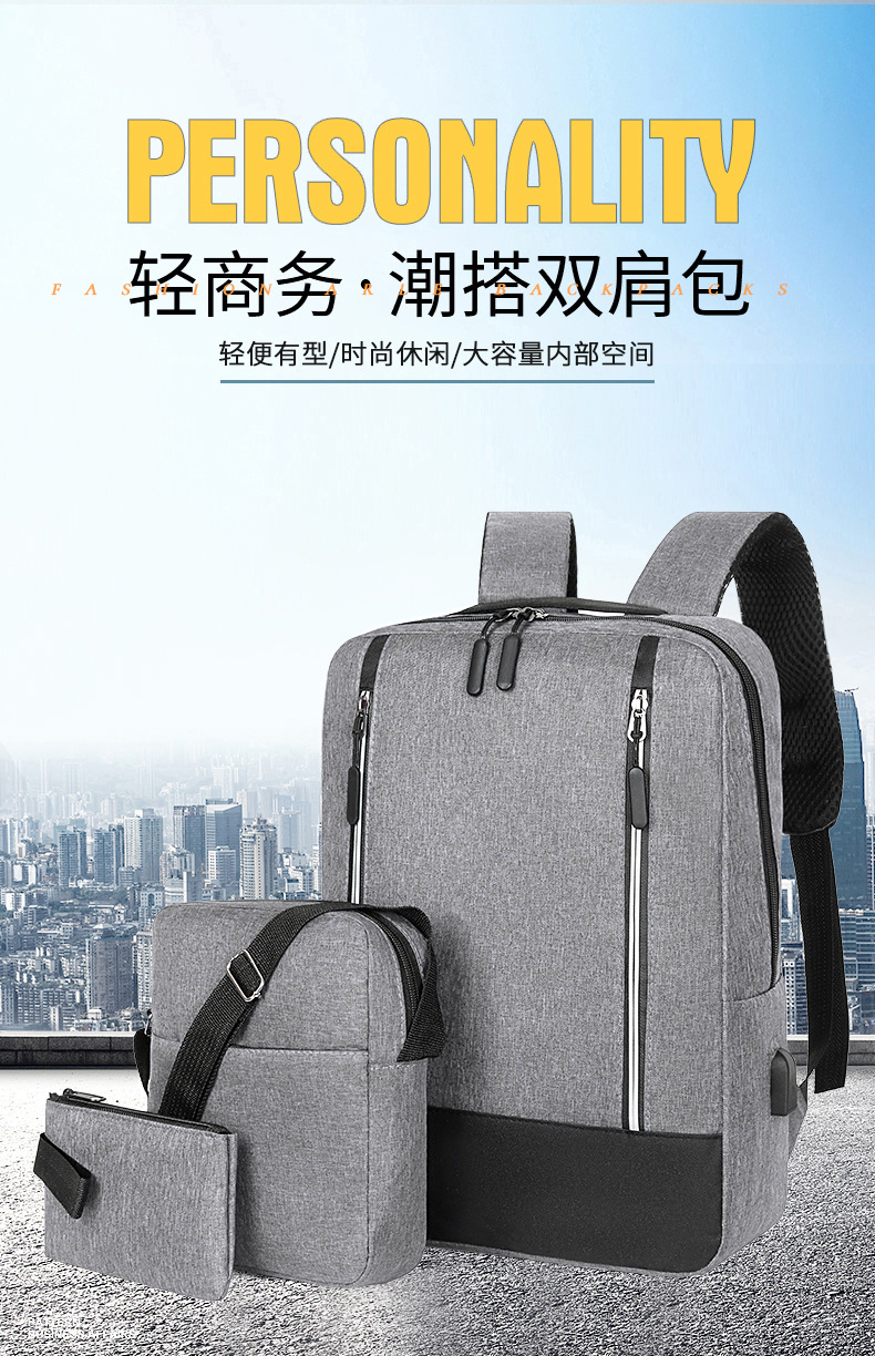 双肩背包跨境新款男士16寸电脑背包休闲商务USB充电纯色三件套