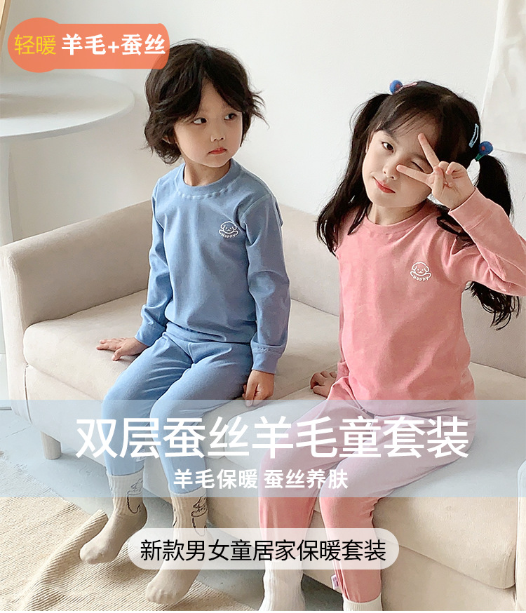 双面羊毛蚕丝儿童保暖内衣套装男宝秋冬季中大童秋衣秋裤女童睡衣