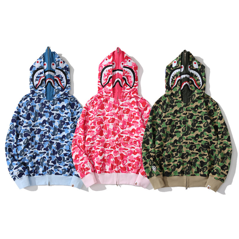 外贸跨境批发鲨鱼头迷彩双帽卫衣男士街头潮牌刺绣印花宽松女外套