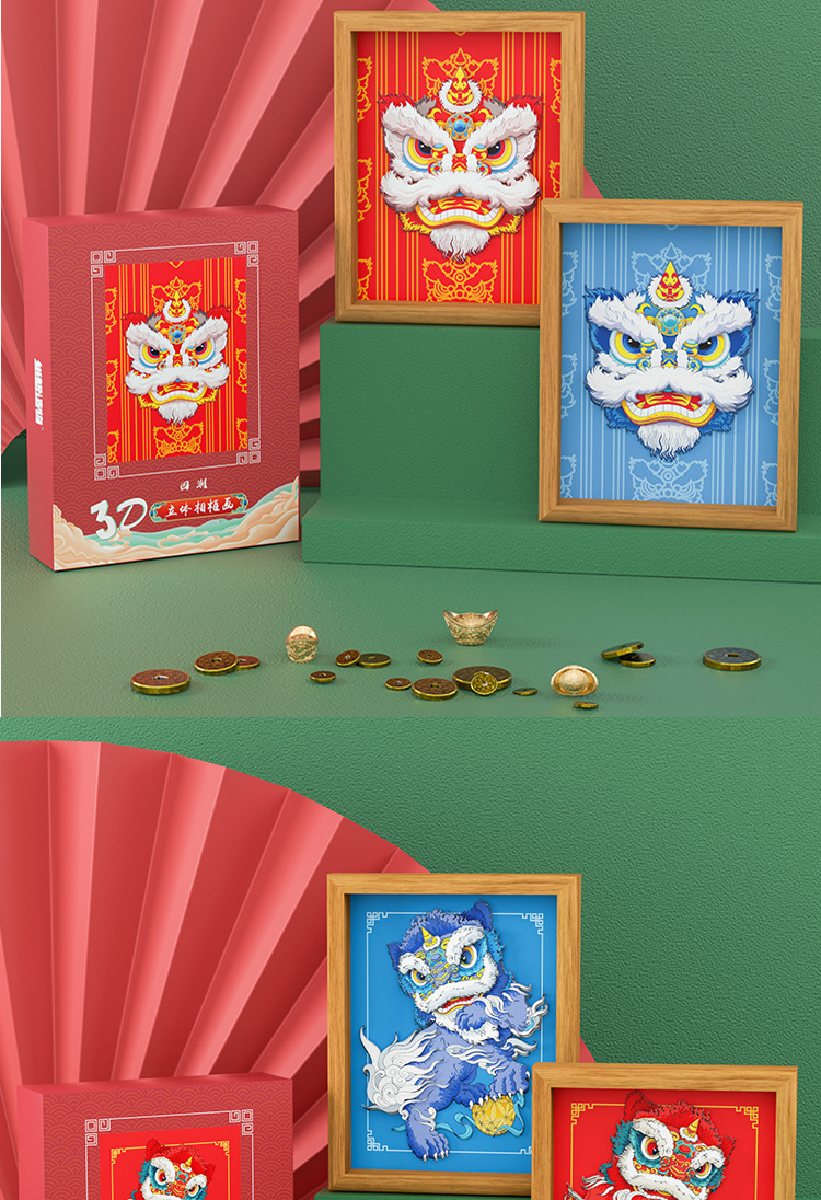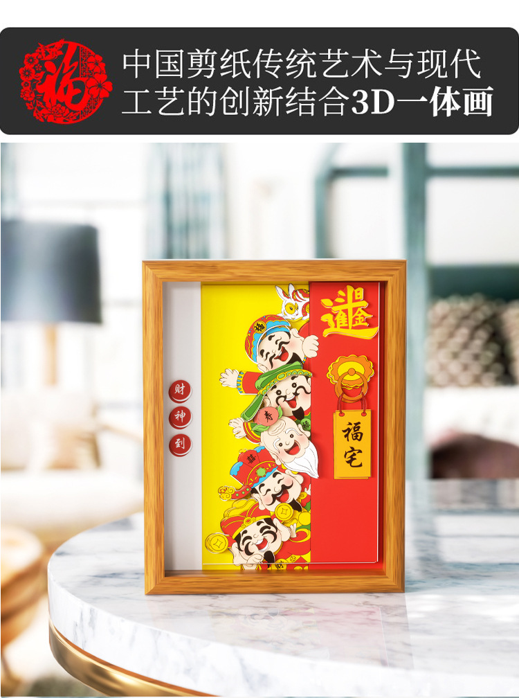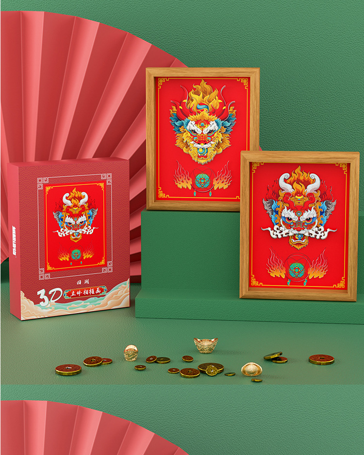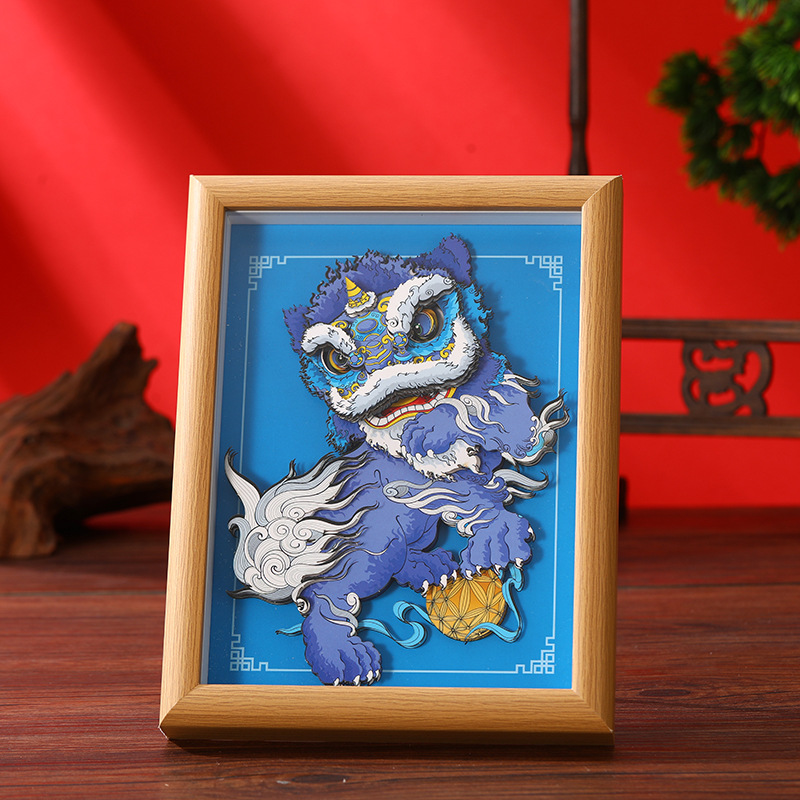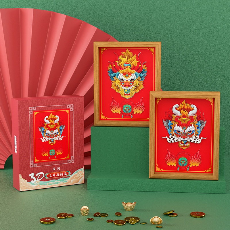 国潮新中式醒狮貔貅财神木质相框摆台立体diy装饰画摆件厂家批发