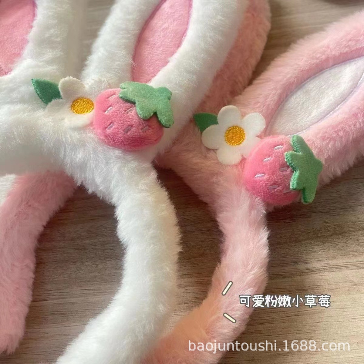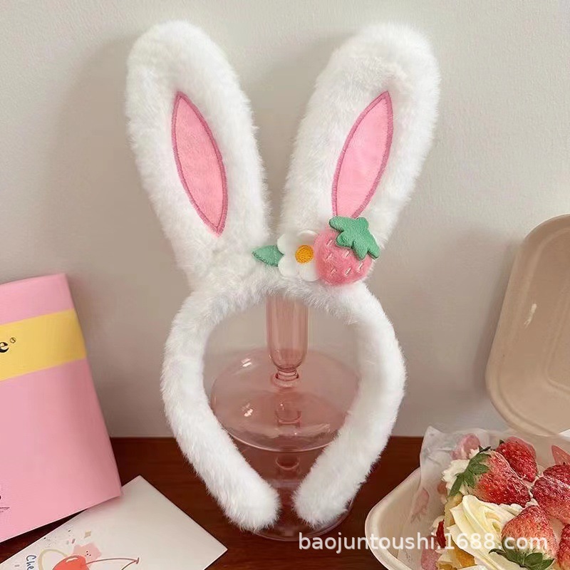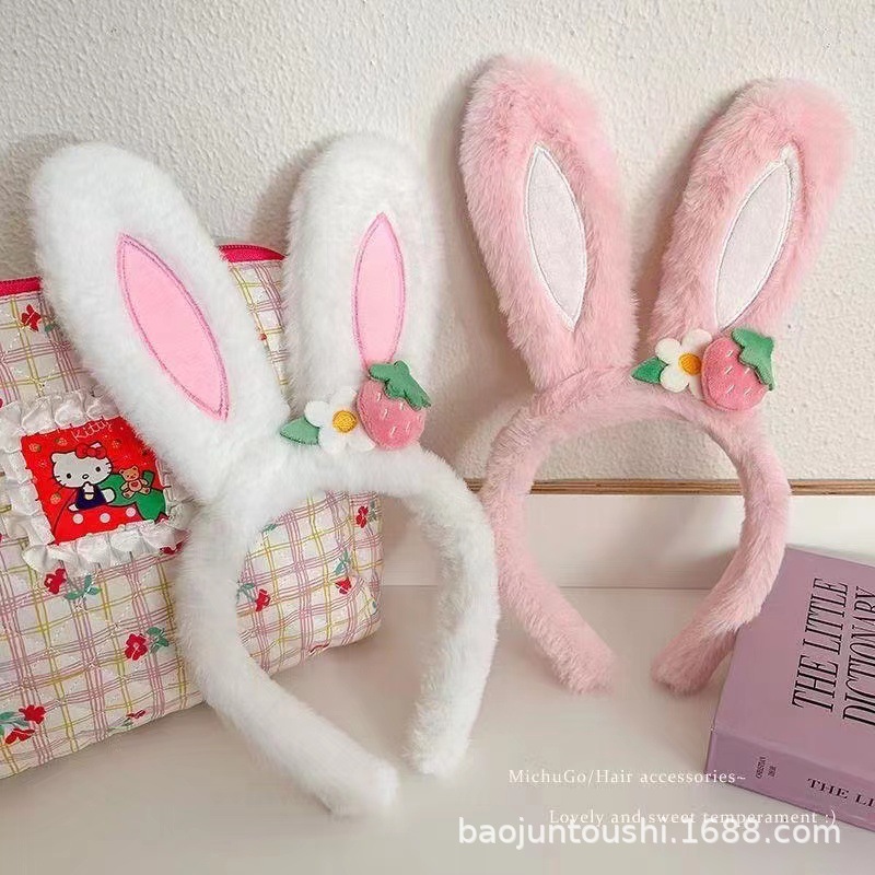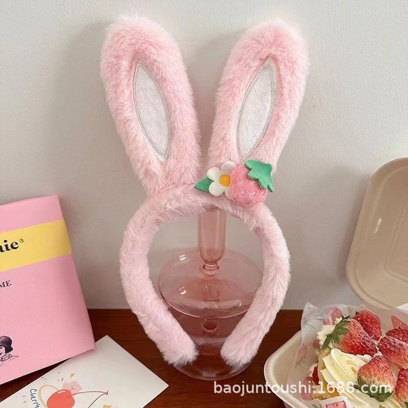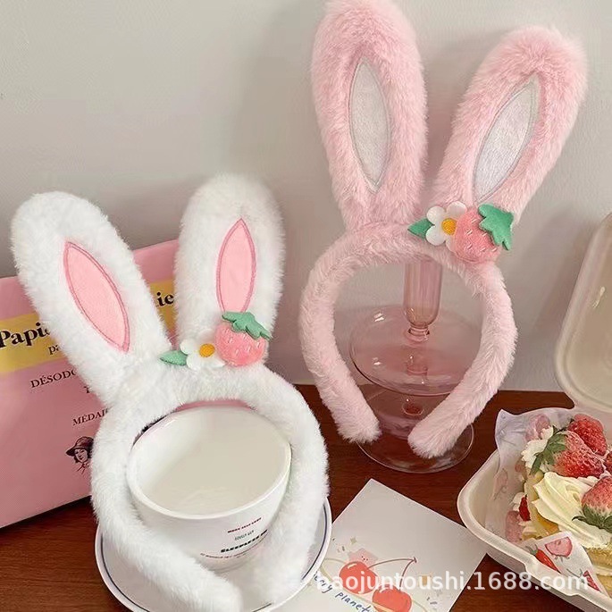 可爱草莓花兔子耳朵发箍女款兔年毛绒压发头箍儿童发捆发饰品批发