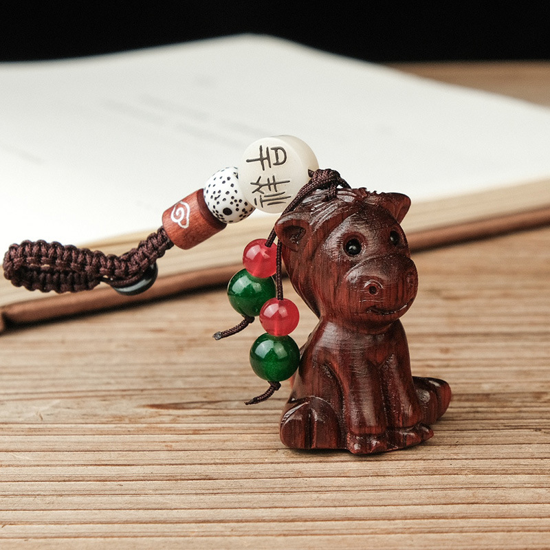 紫檀木十二生肖雕刻摆件动物摆件钥匙扣挂件卡通猪小兔配件蛇牛龙