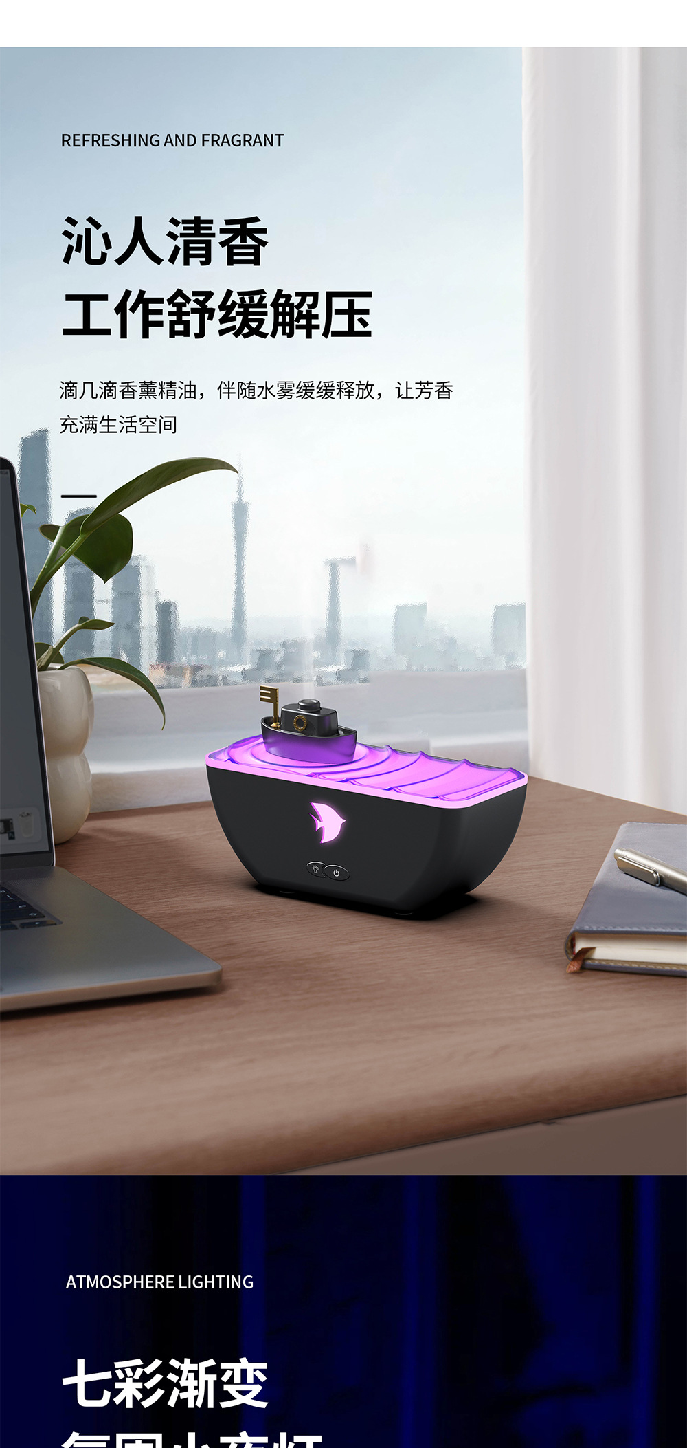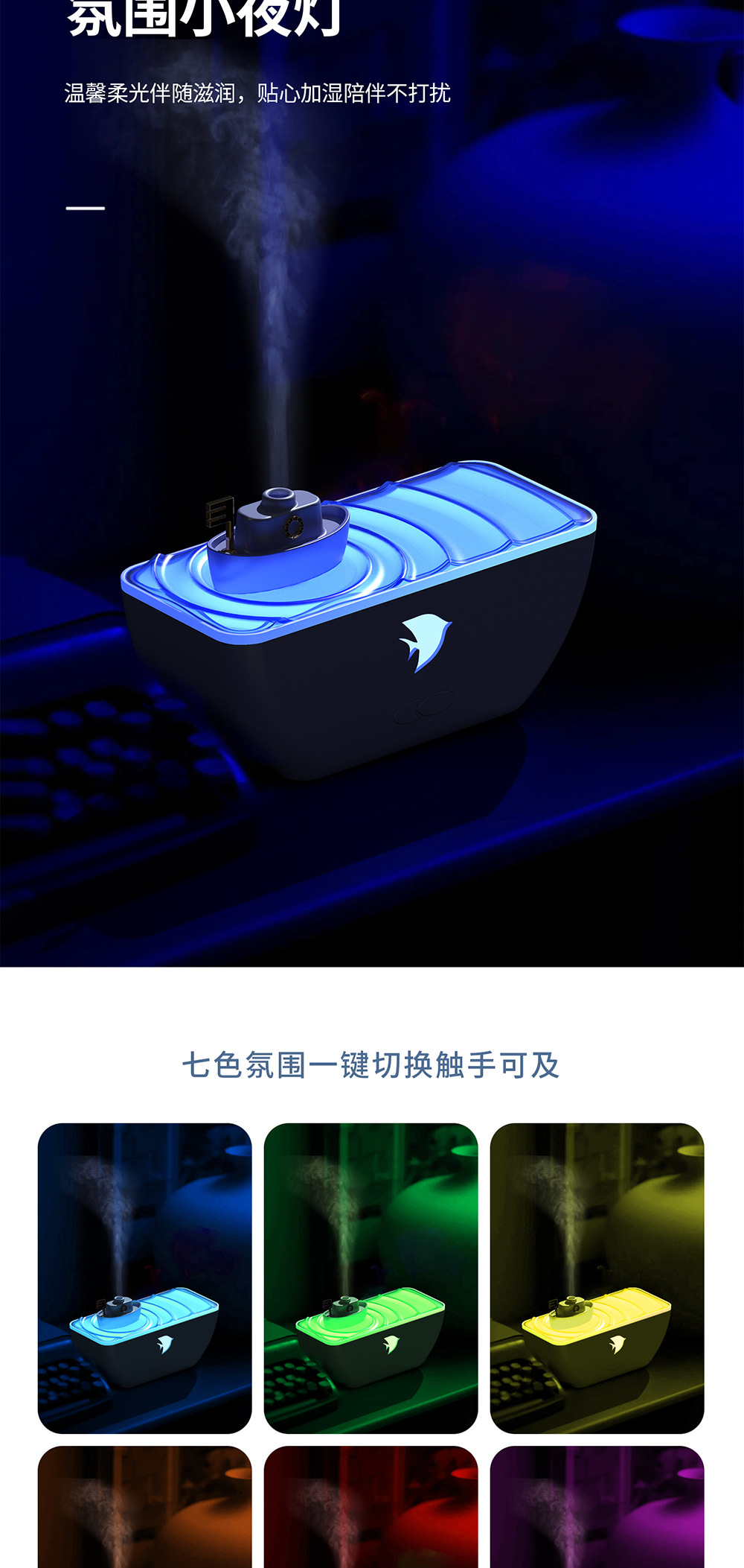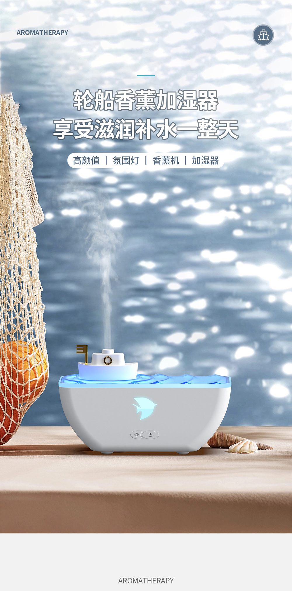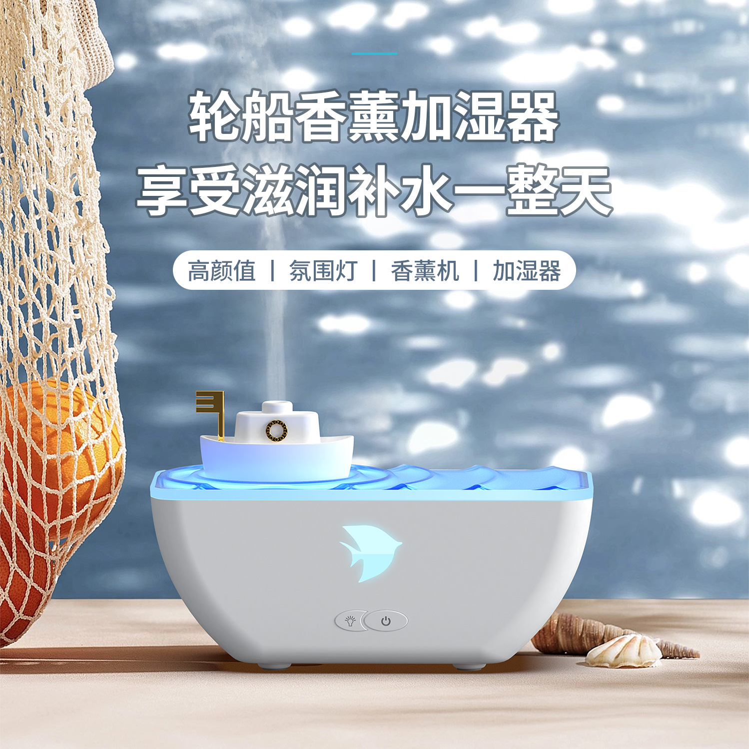 跨境轮船香薰机渐变七彩夜灯氛围感创意礼品补水加湿器卧室用小型