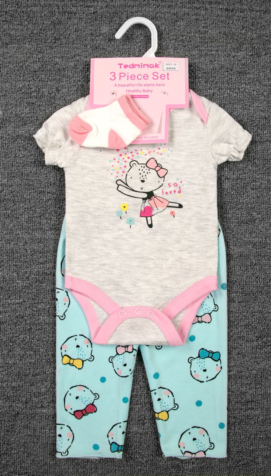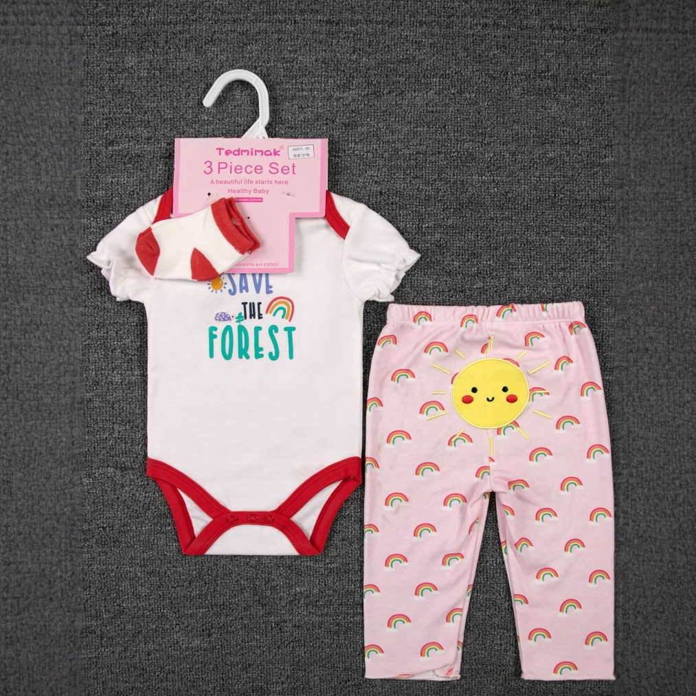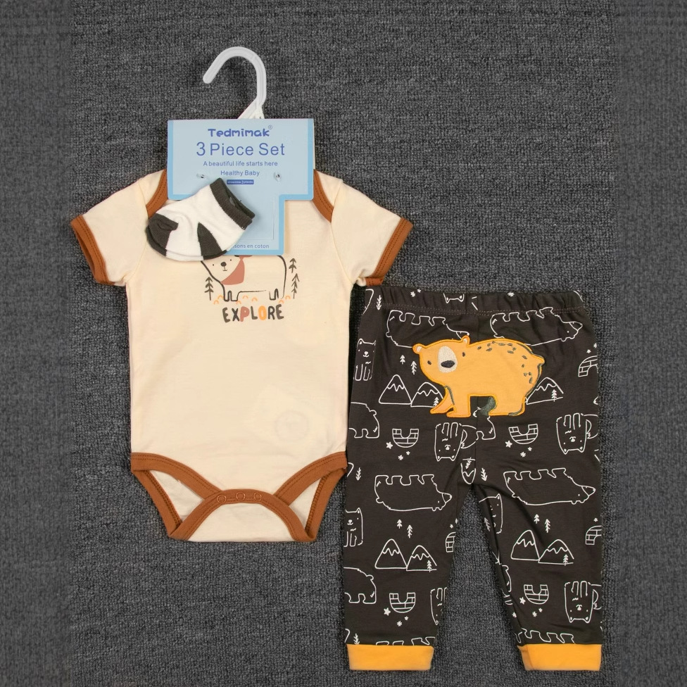 2024新款跨境工厂欧美卡通动物字母印花婴幼童三件套短哈长裤袜子