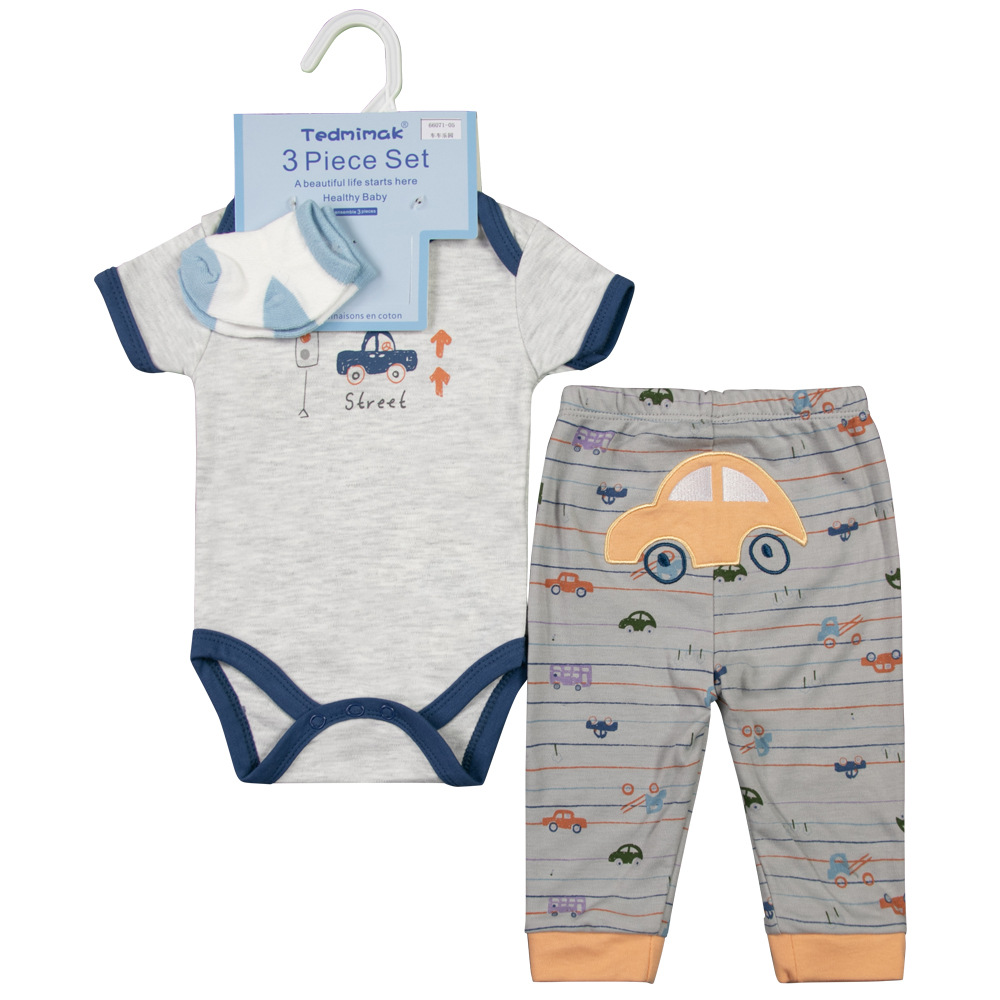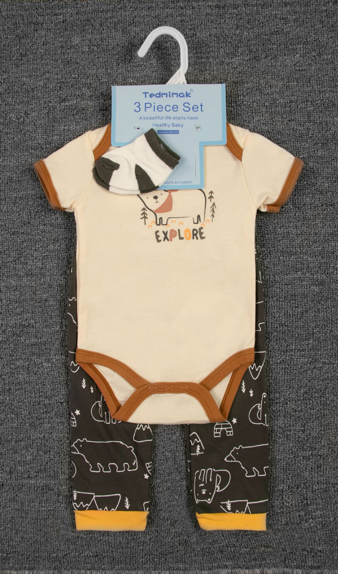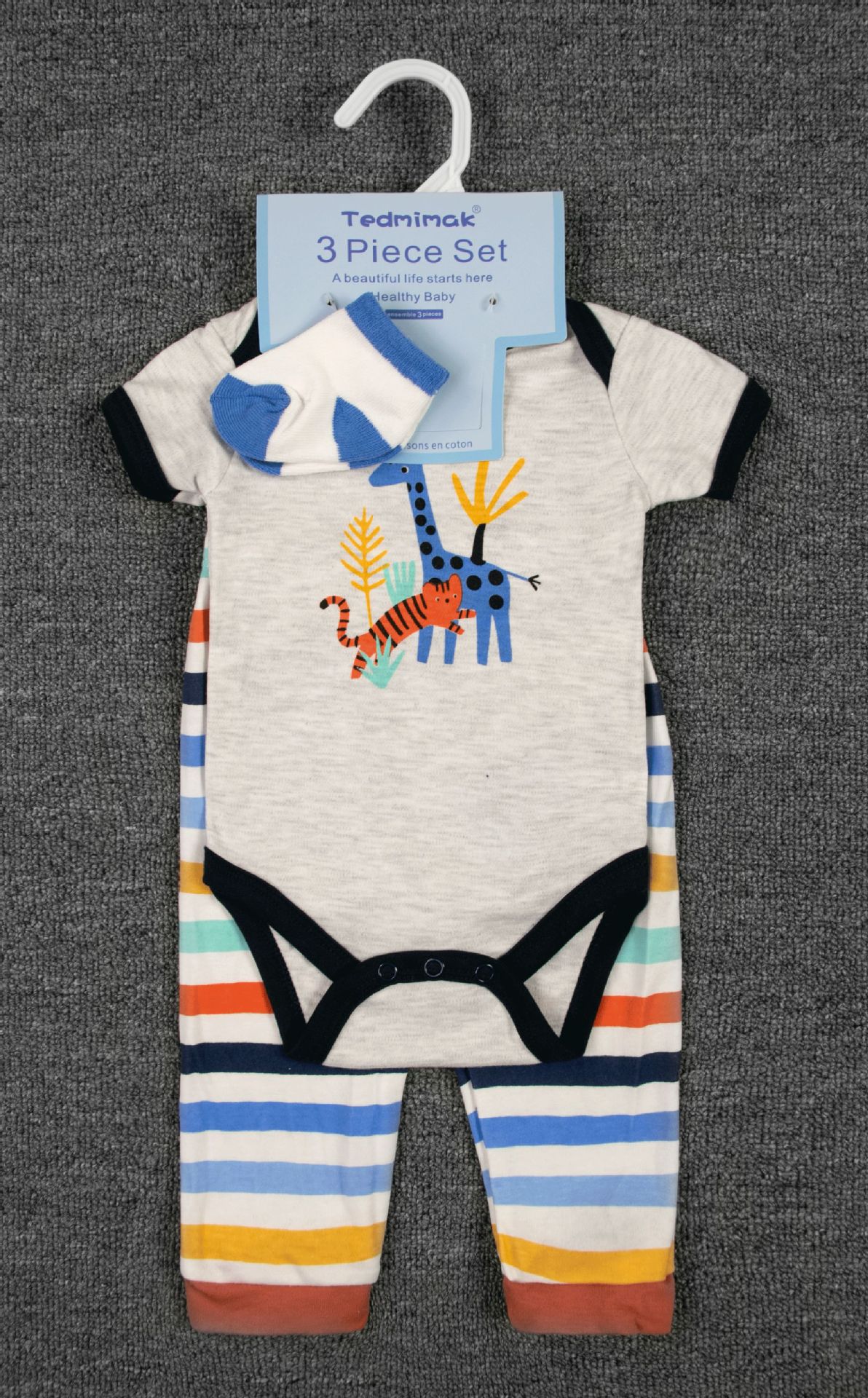 2024新款跨境工厂欧美卡通动物字母印花婴幼童三件套短哈长裤袜子