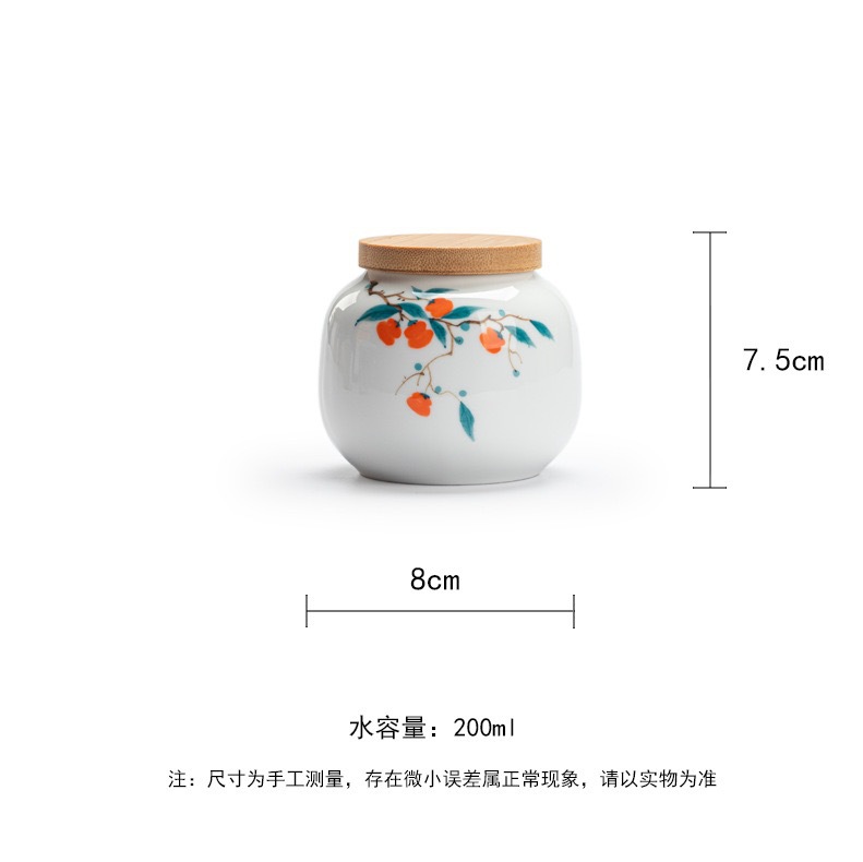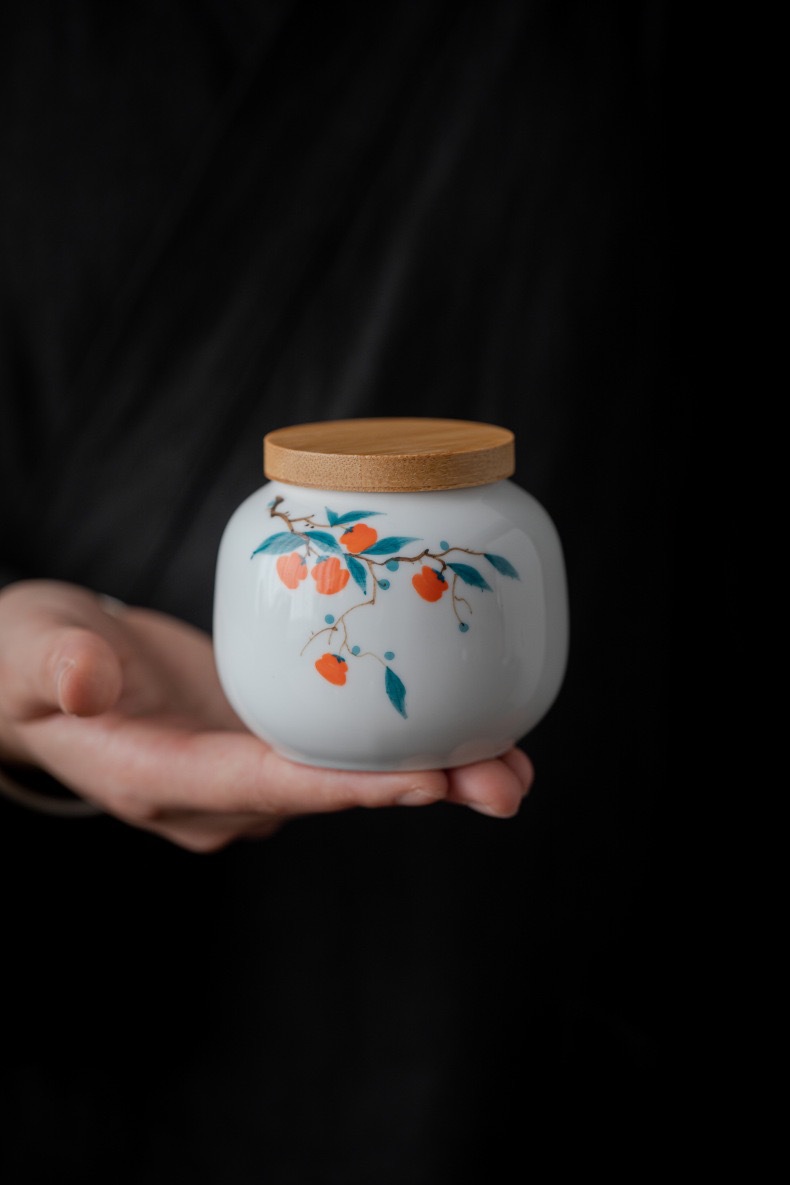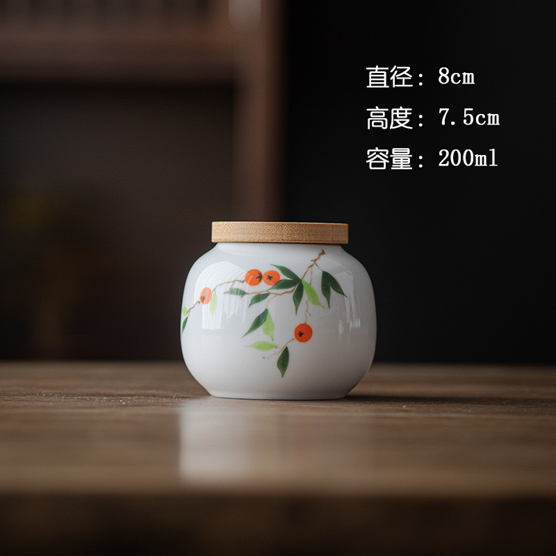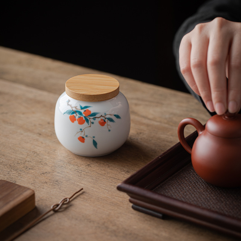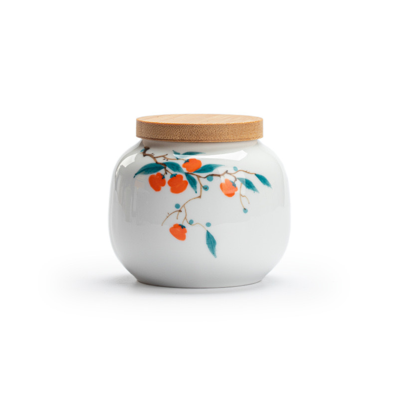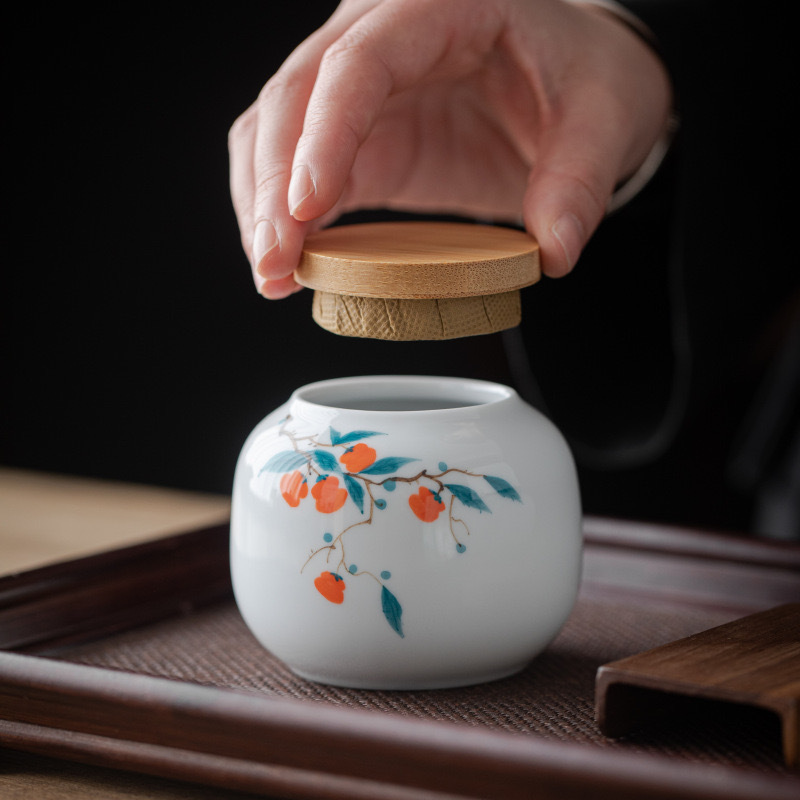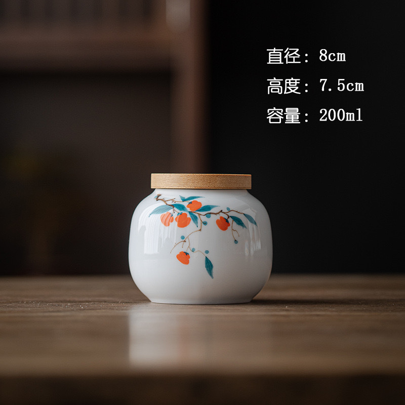 德化白瓷手绘柿子四君子小罐陶瓷茶叶罐釉下彩茶叶储存罐密封茶罐