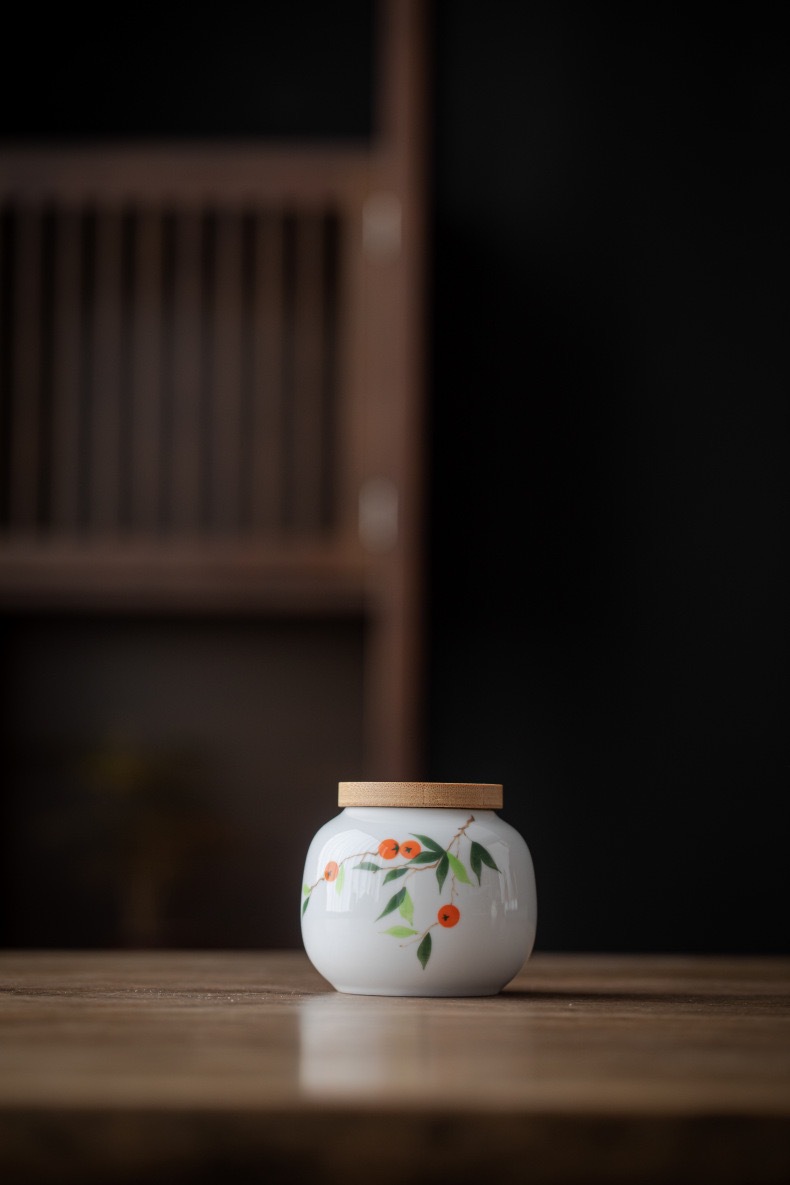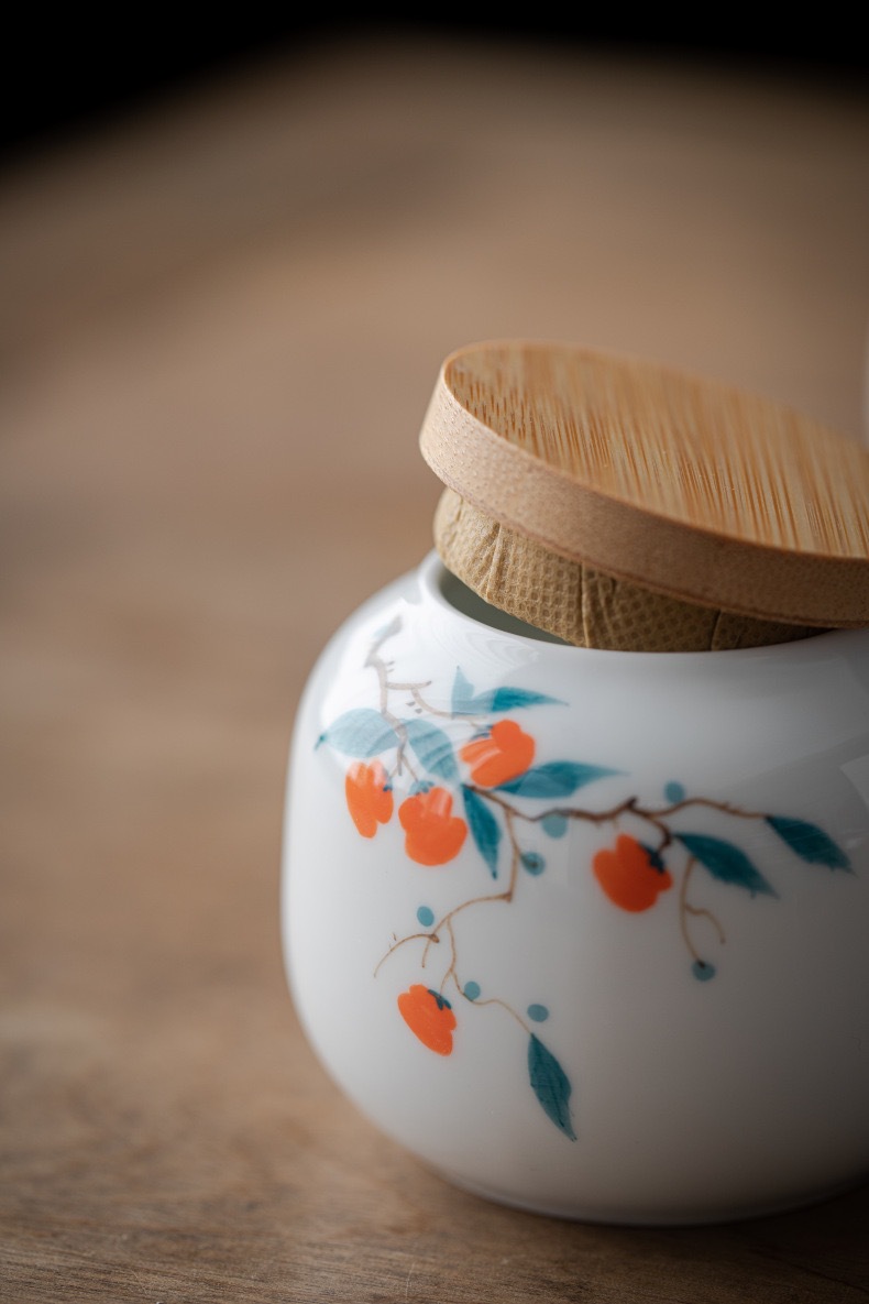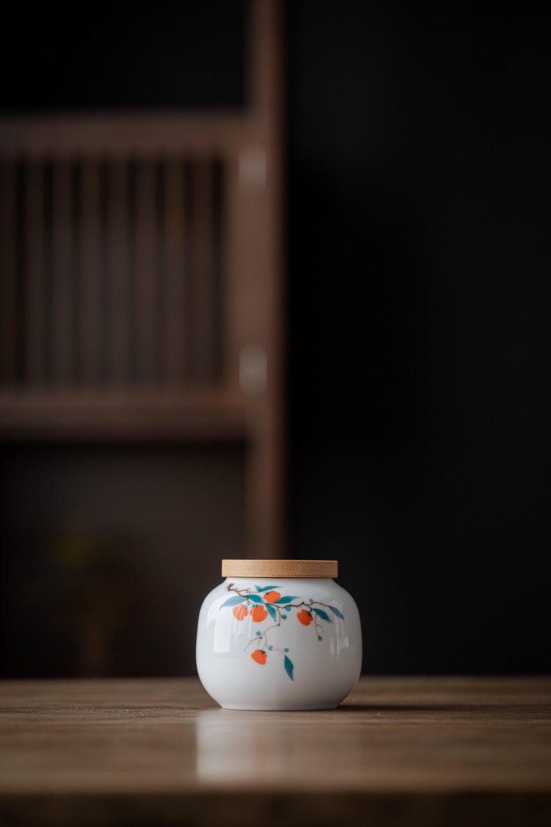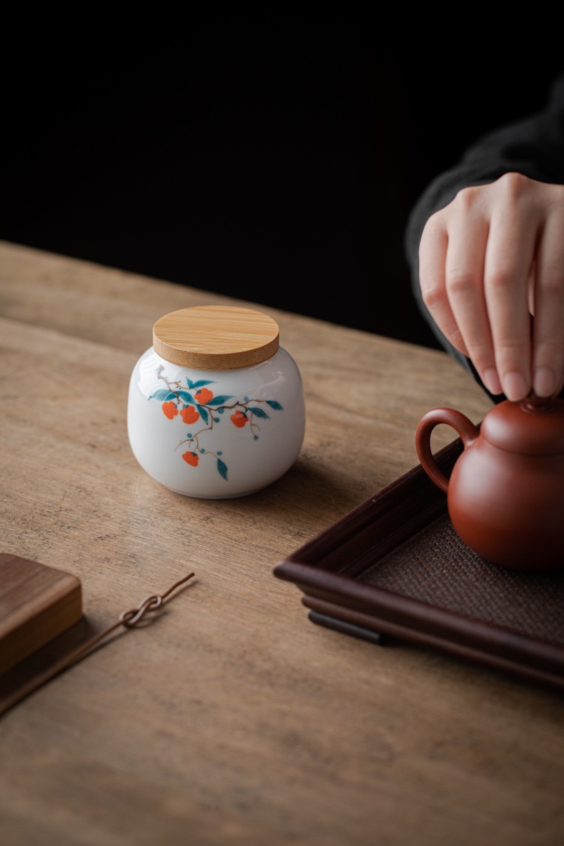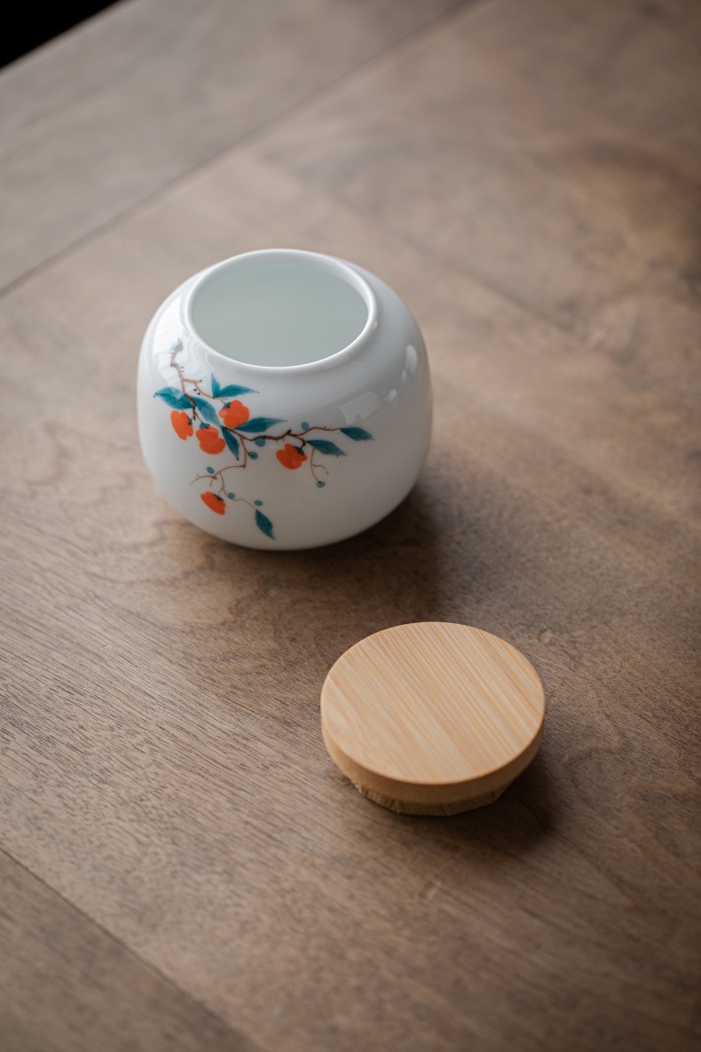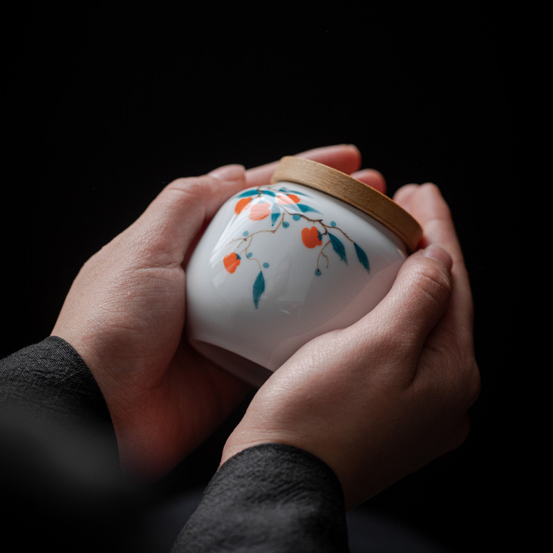 德化白瓷手绘柿子四君子小罐陶瓷茶叶罐釉下彩茶叶储存罐密封茶罐