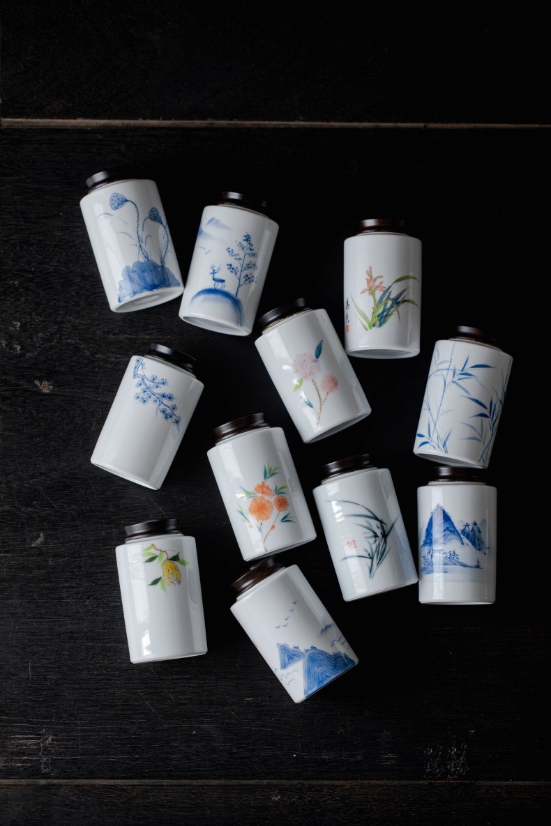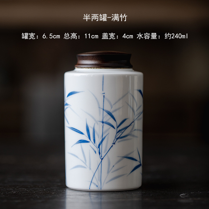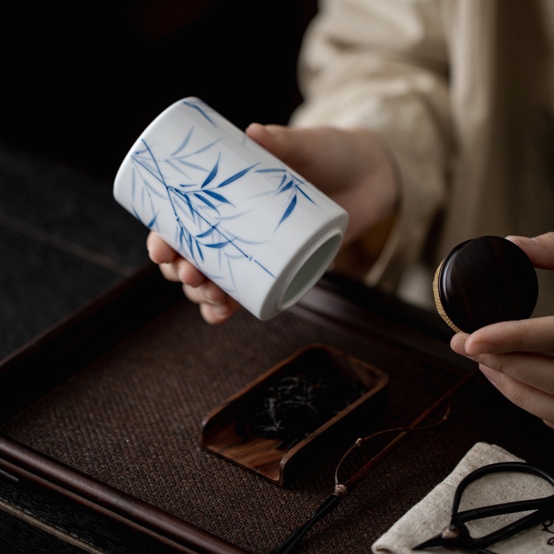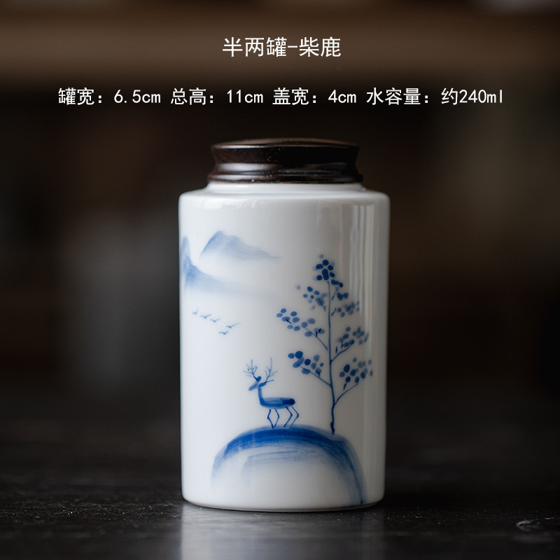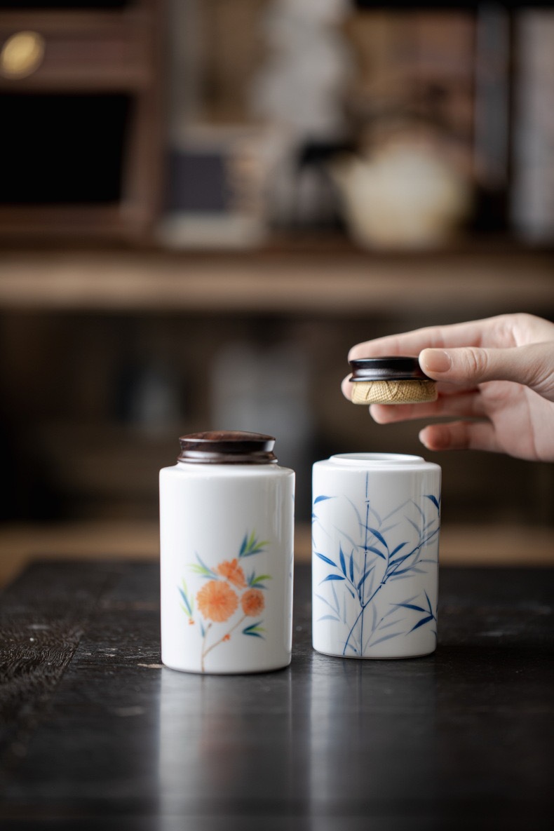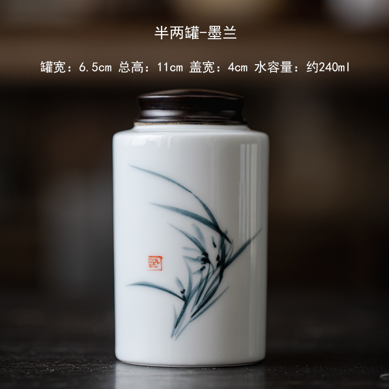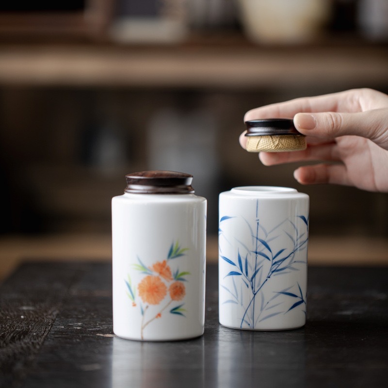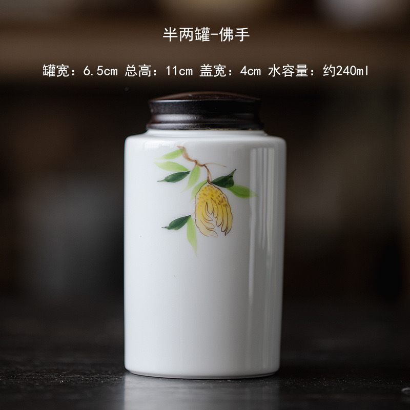 手绘陶瓷茶叶罐子黑檀木盖茶罐密封陶瓷罐便携小罐子储物罐密封罐