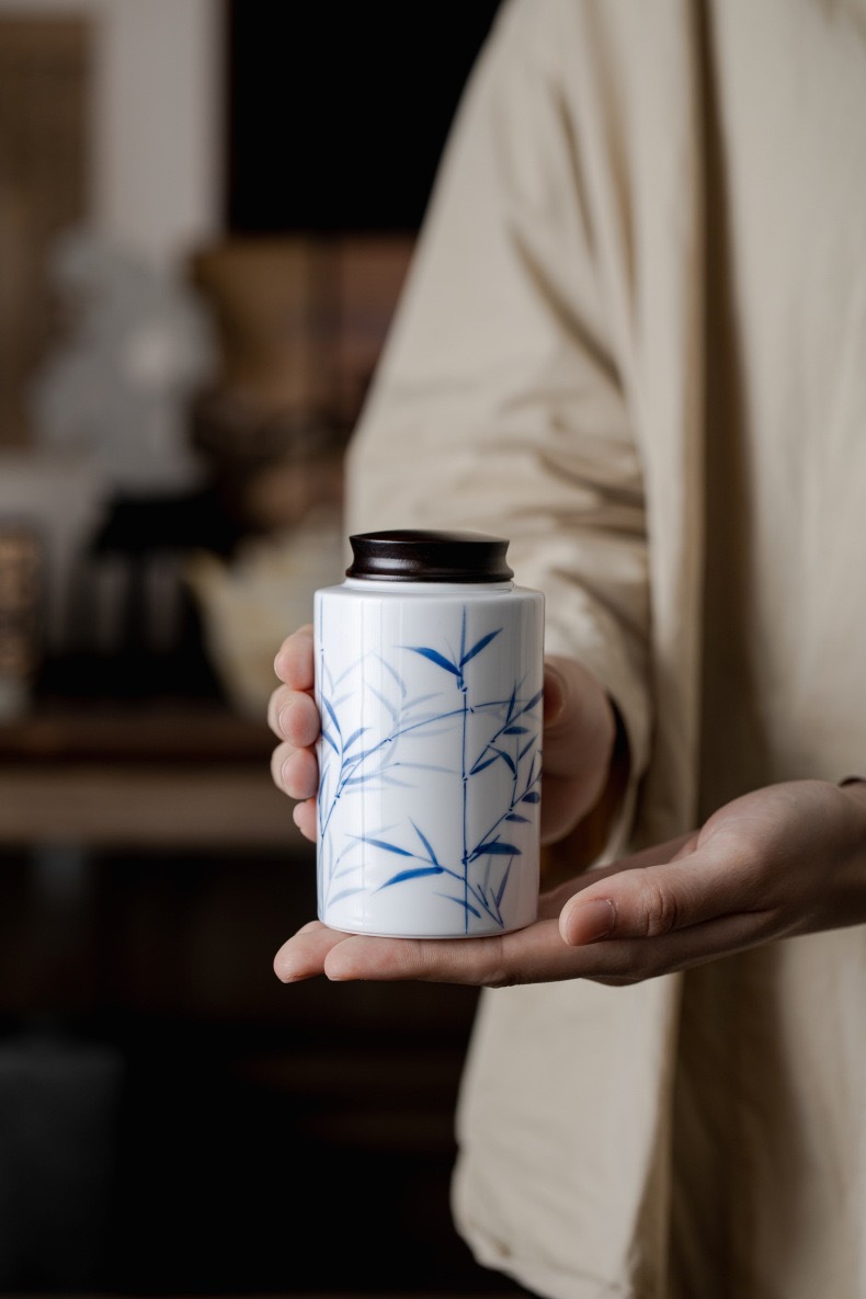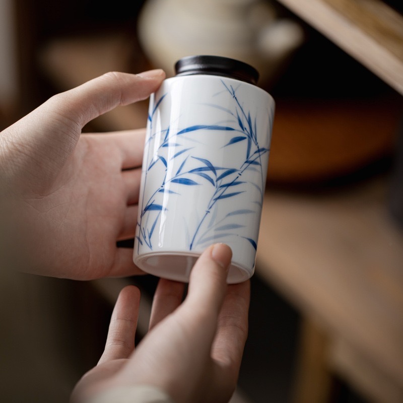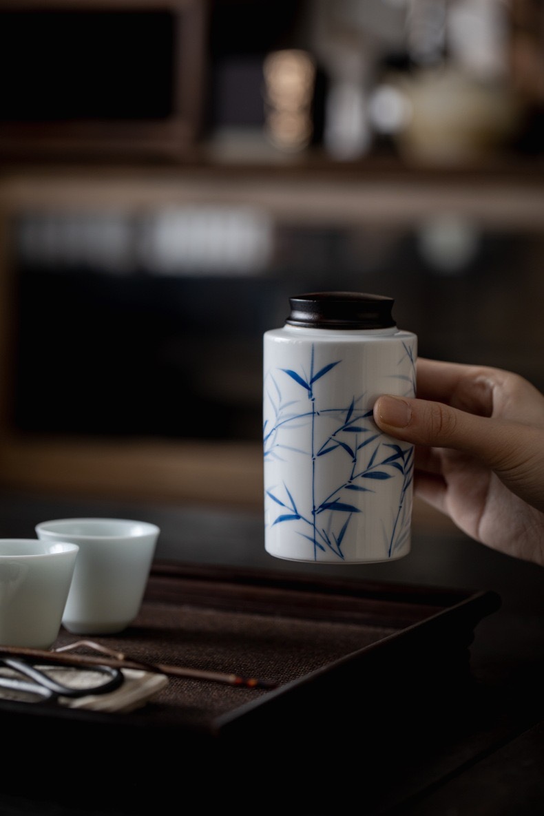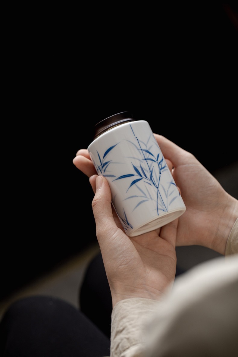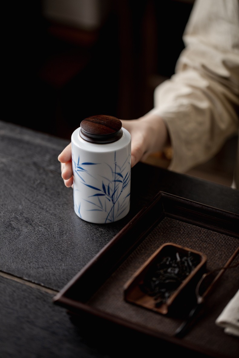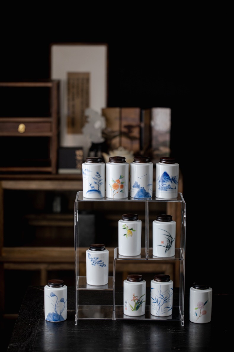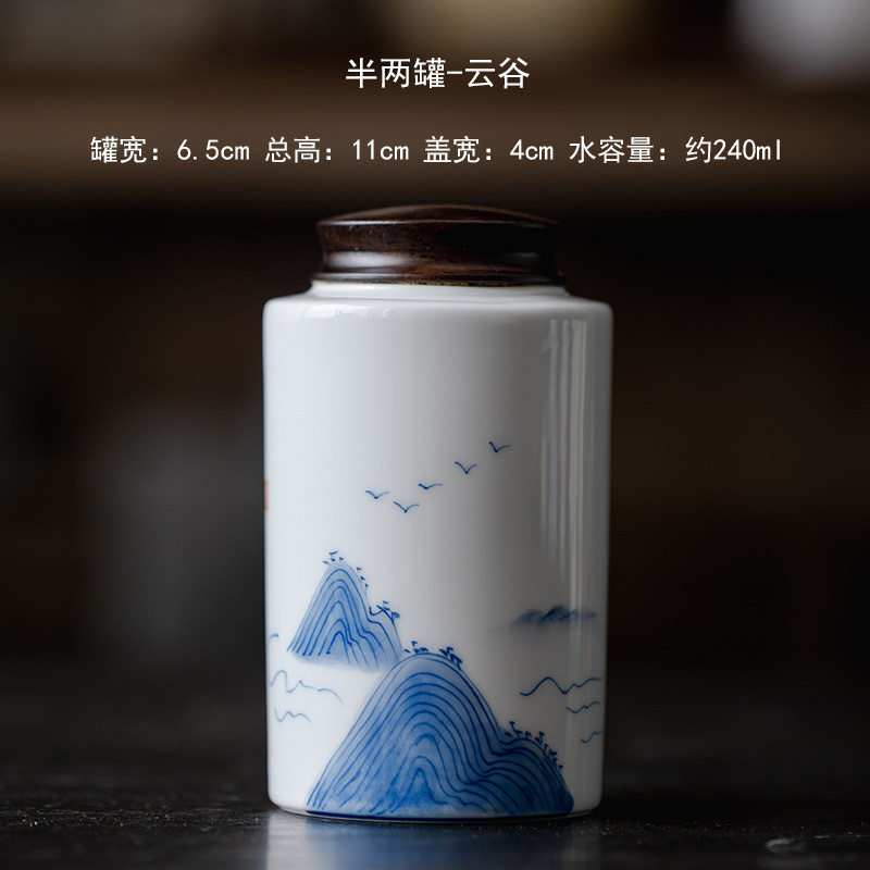 手绘陶瓷茶叶罐子黑檀木盖茶罐密封陶瓷罐便携小罐子储物罐密封罐