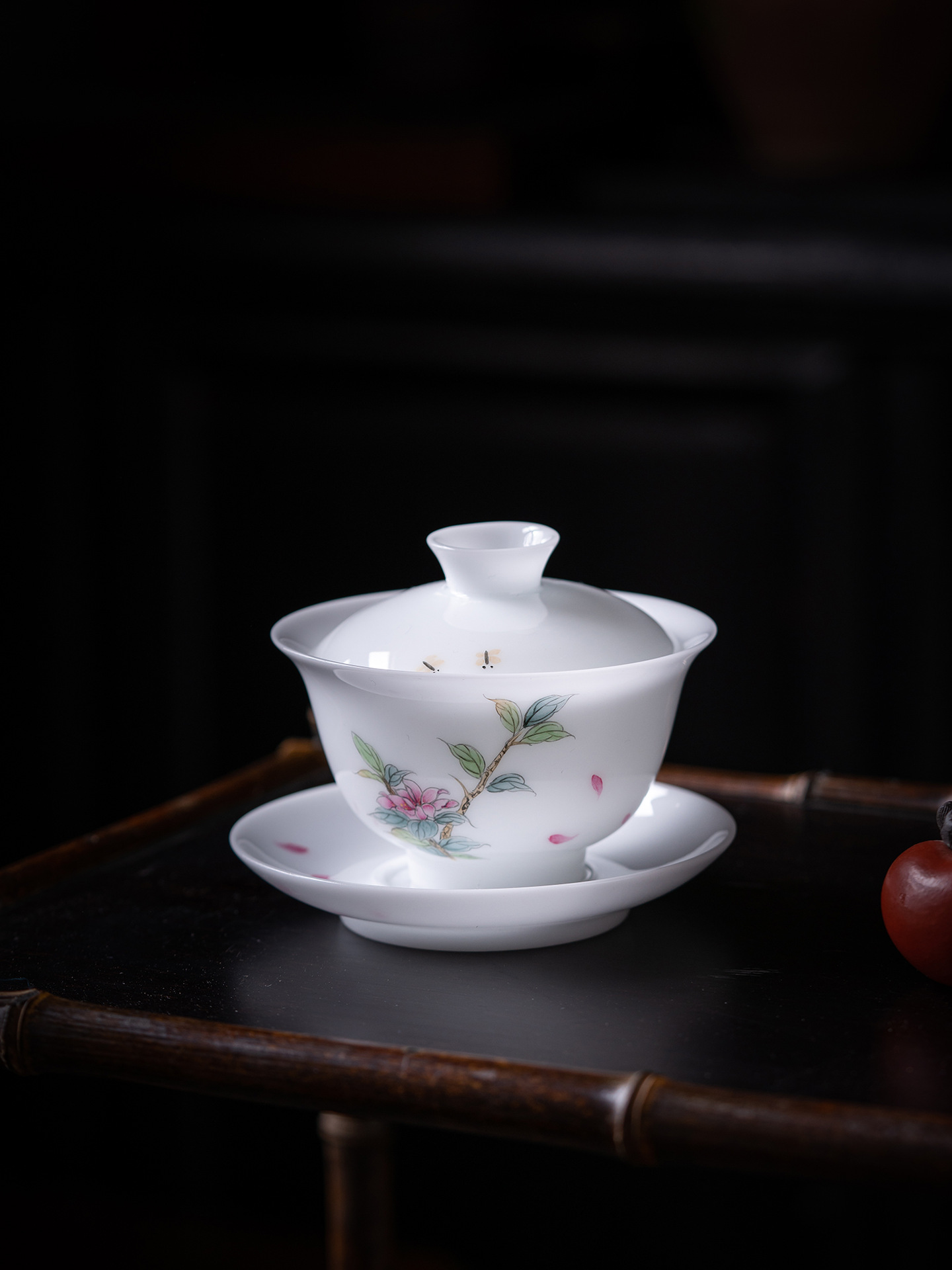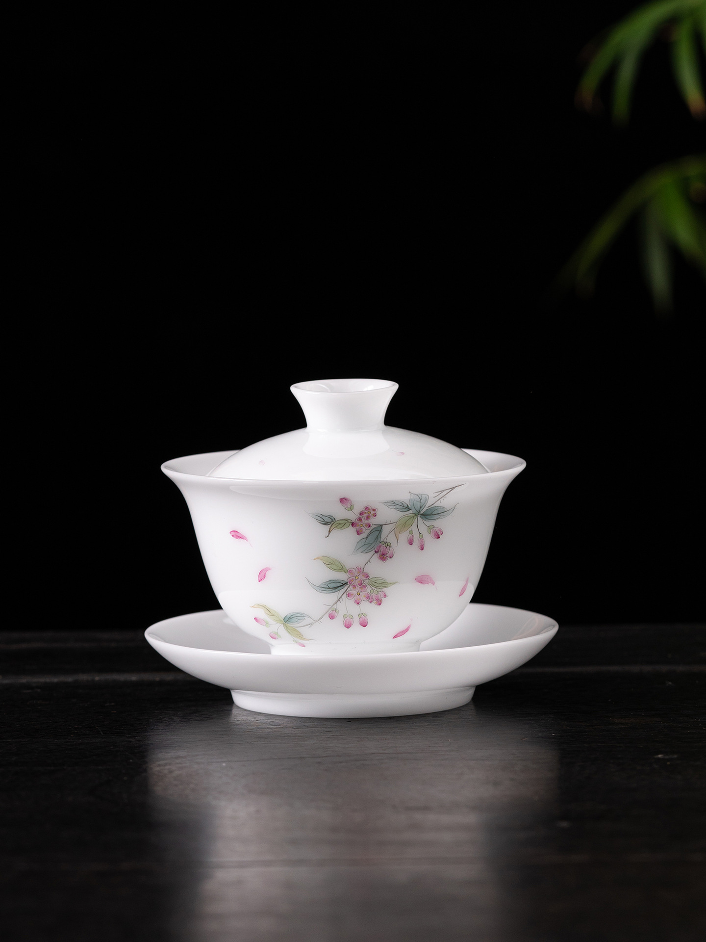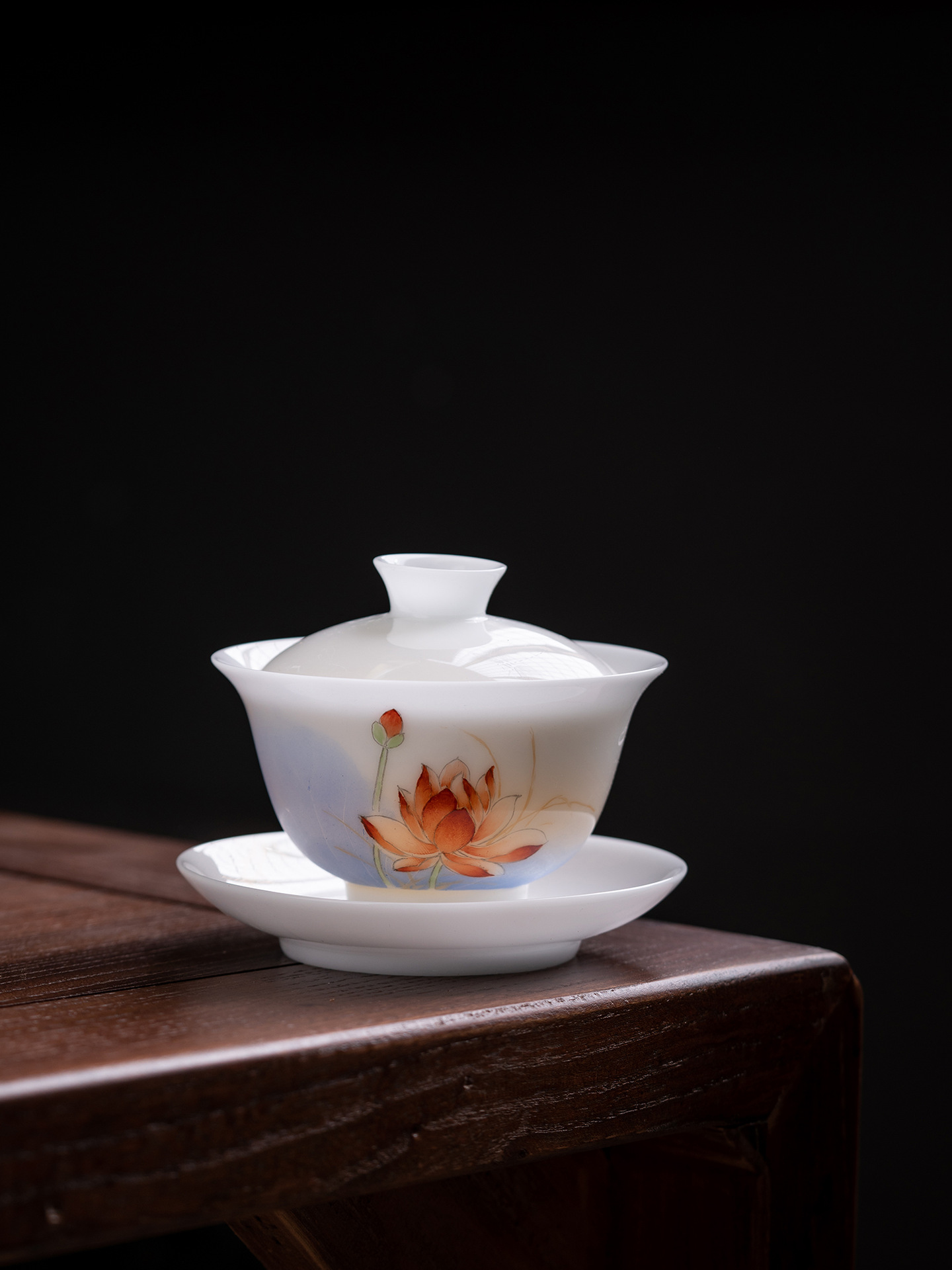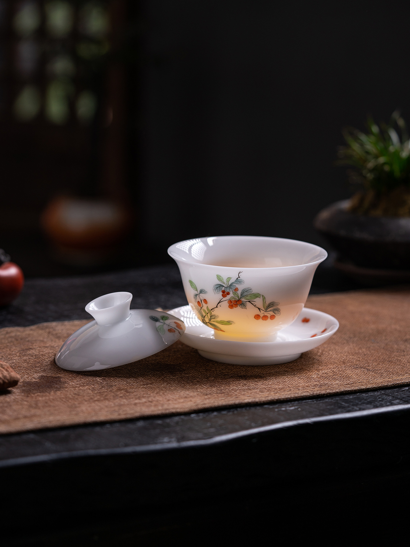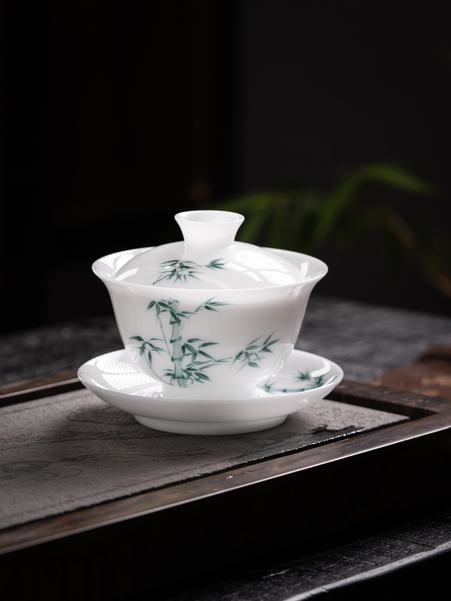 冰种玉瓷单个羊脂玉不烫手三才盖碗茶杯手绘茶碗整套套装带盖
