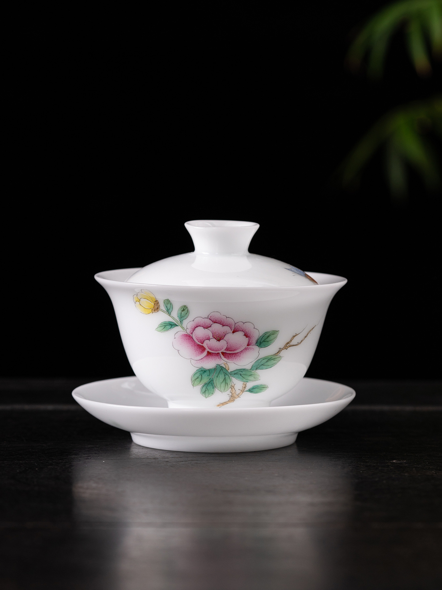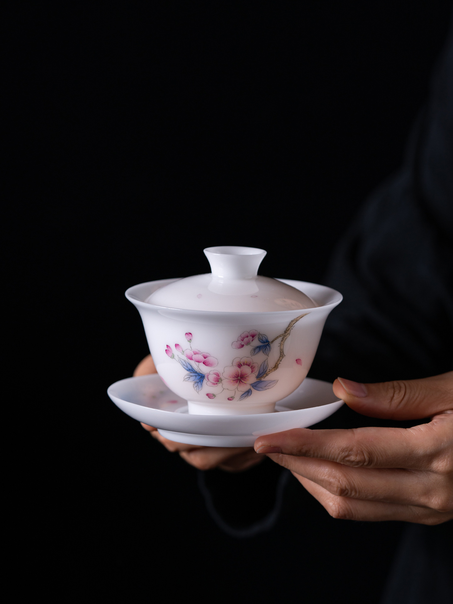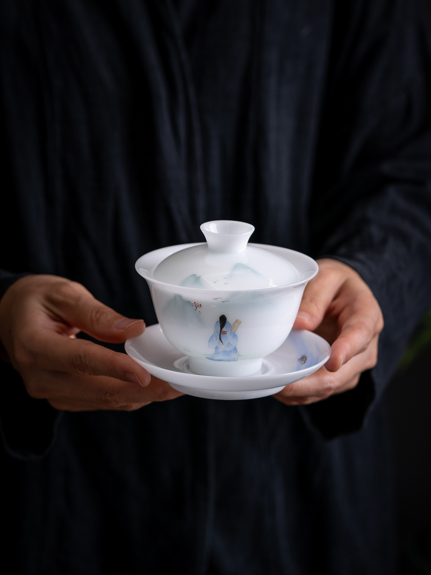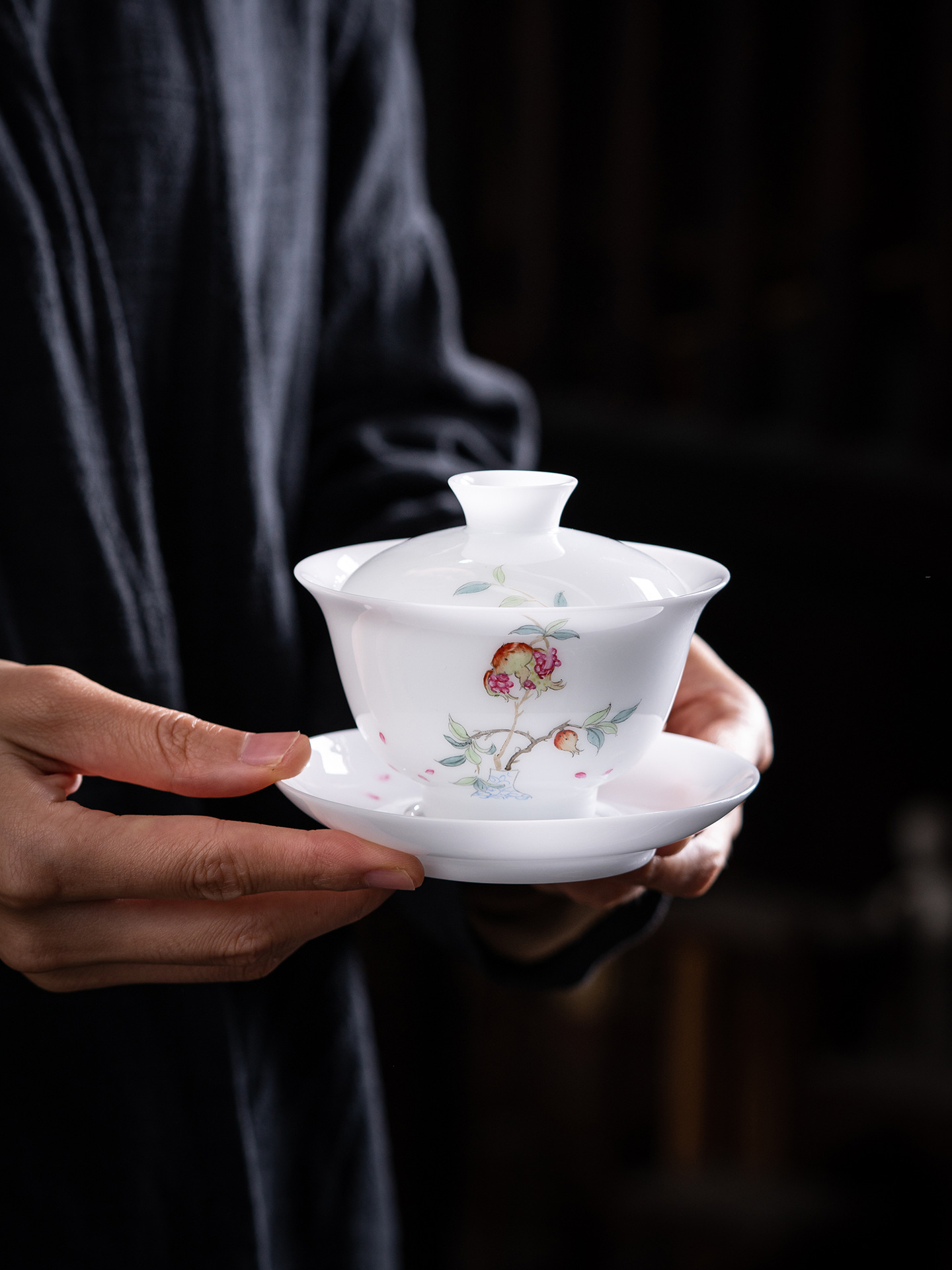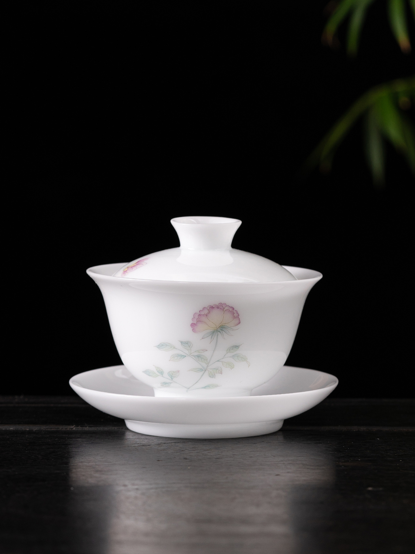 冰种玉瓷单个羊脂玉不烫手三才盖碗茶杯手绘茶碗整套套装带盖